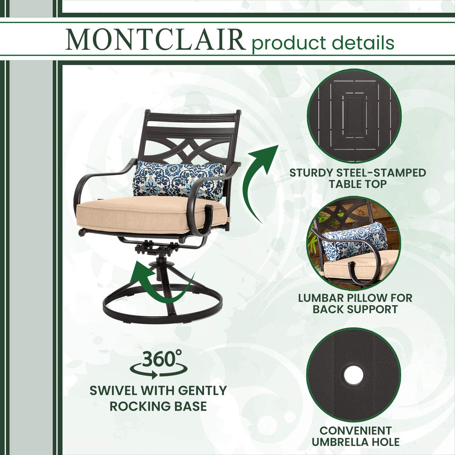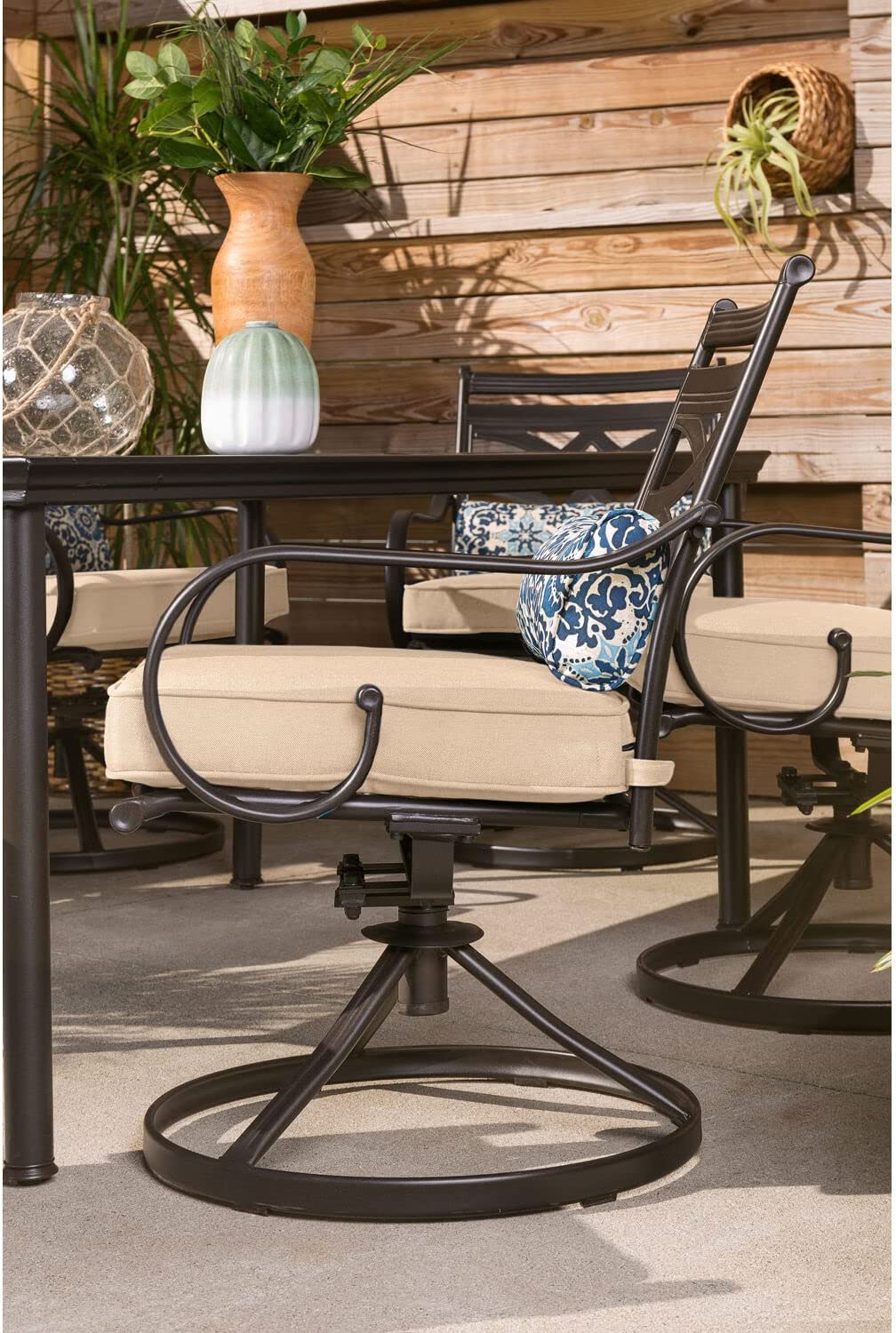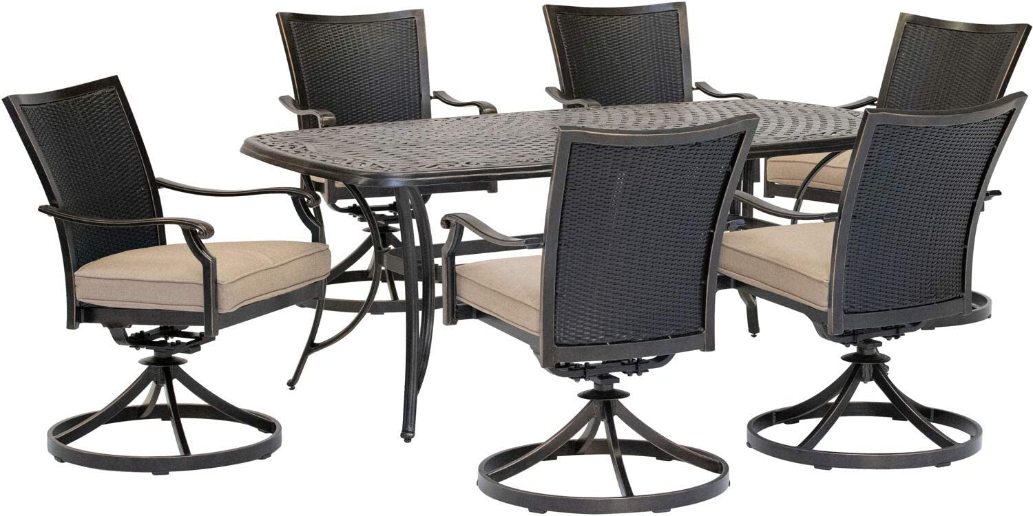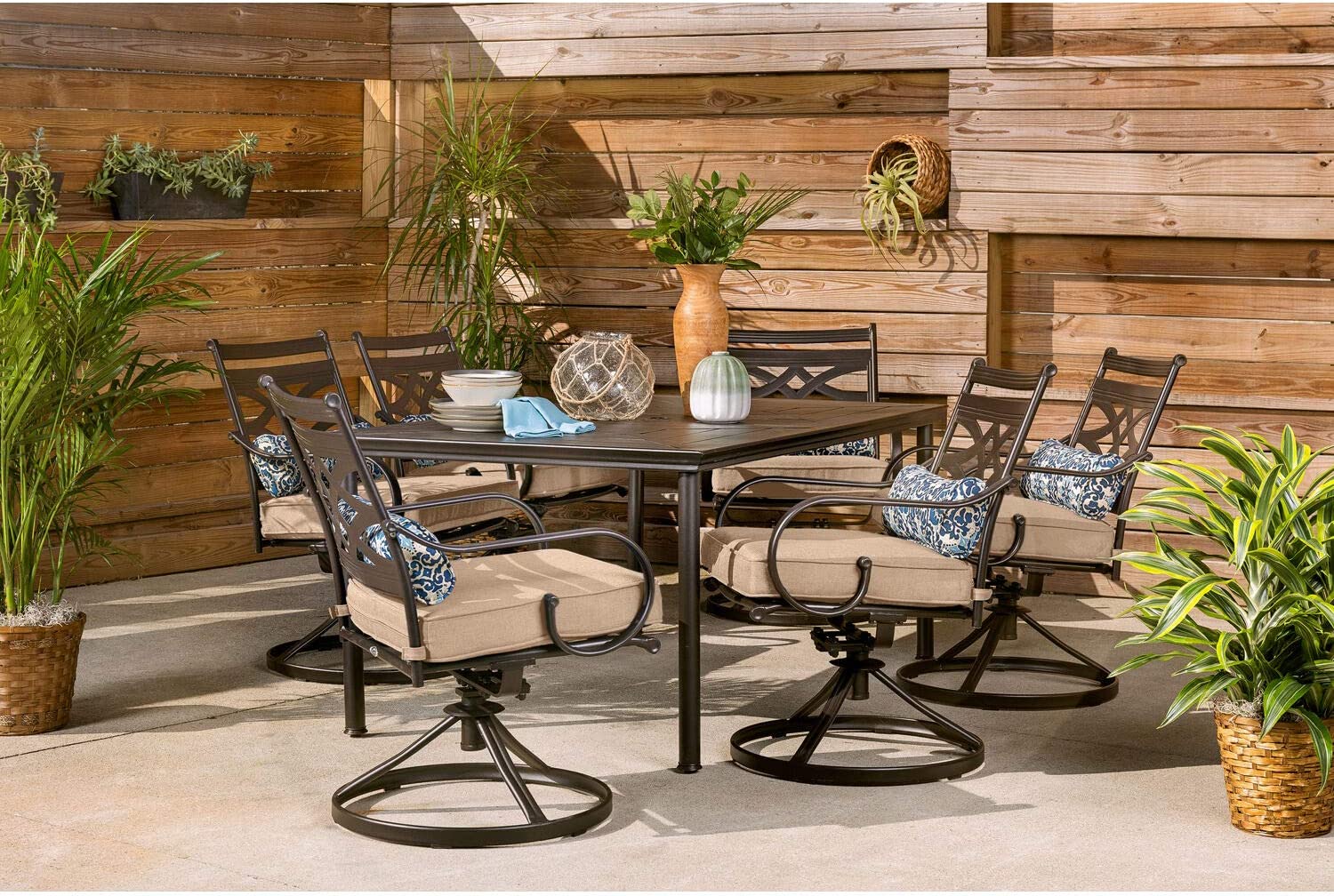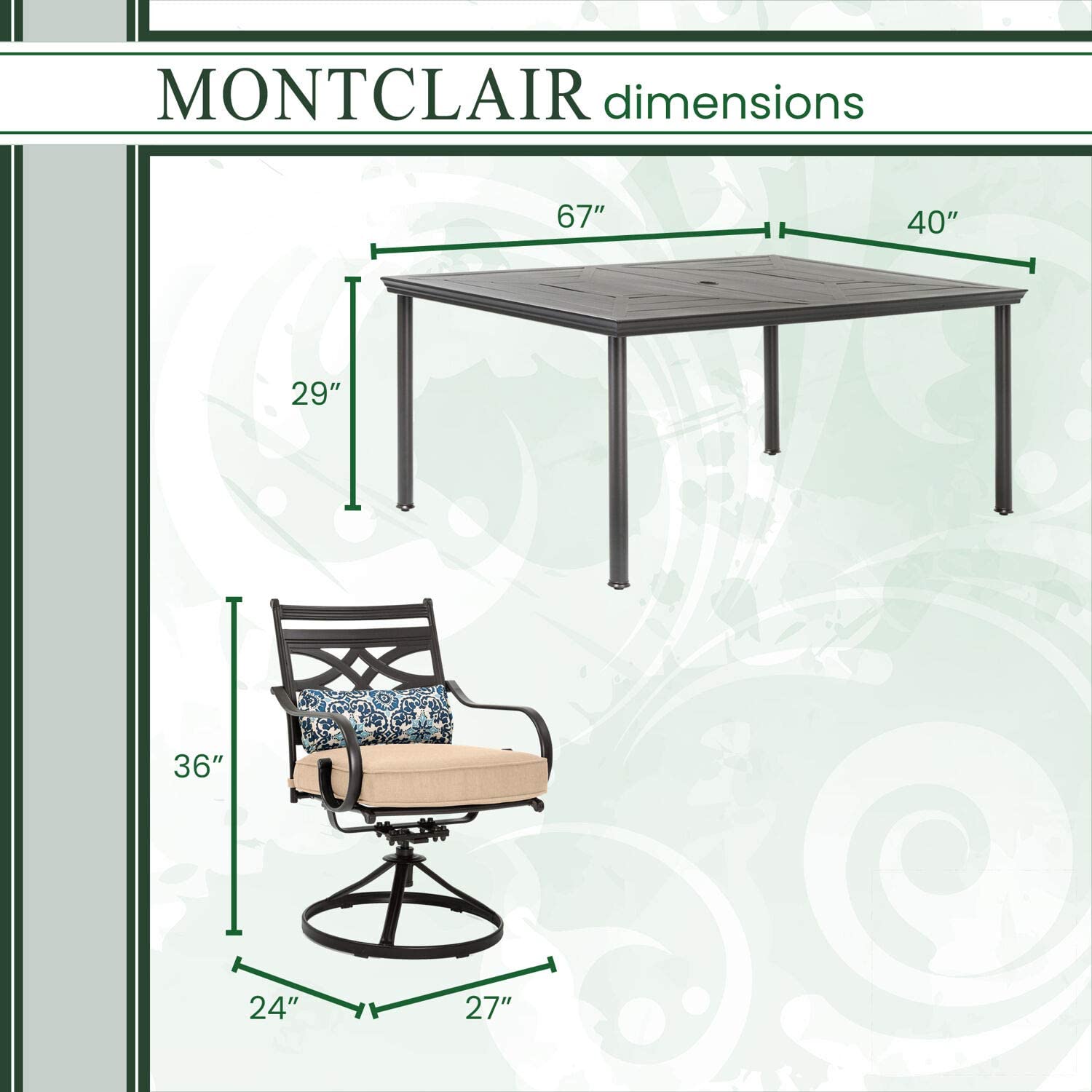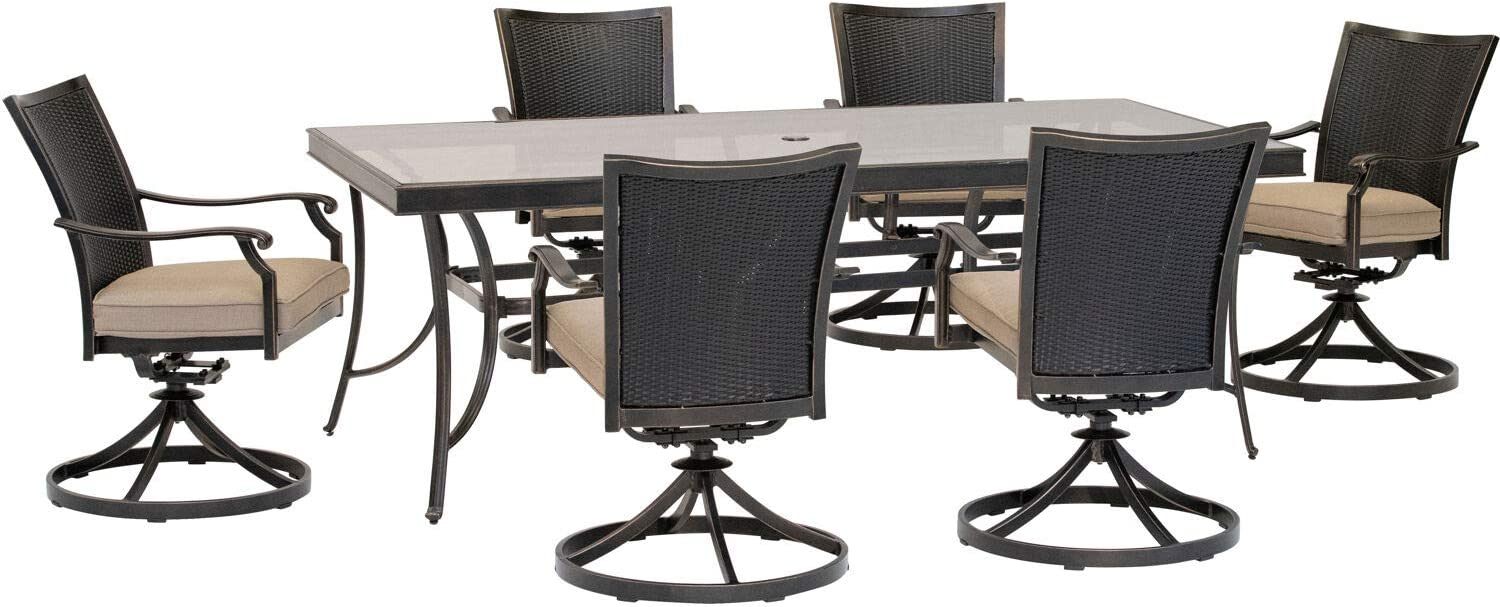 Hanover Montclair 7-Piece All-Weather Outdoor Patio Dining Set, 6 Swivel Rocker Chairs with Comfortable Tan Seat and Lumbar Cushions, 40"x66" Stamped Rectangle Table, MCLRDN7PCSQSW6-TAN