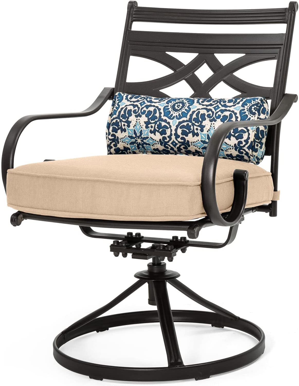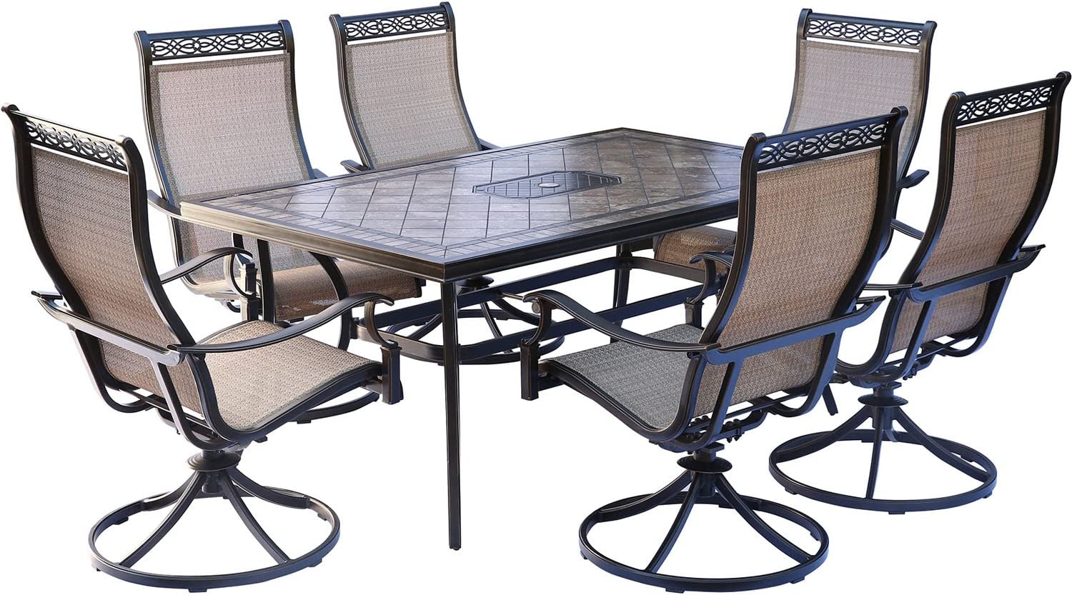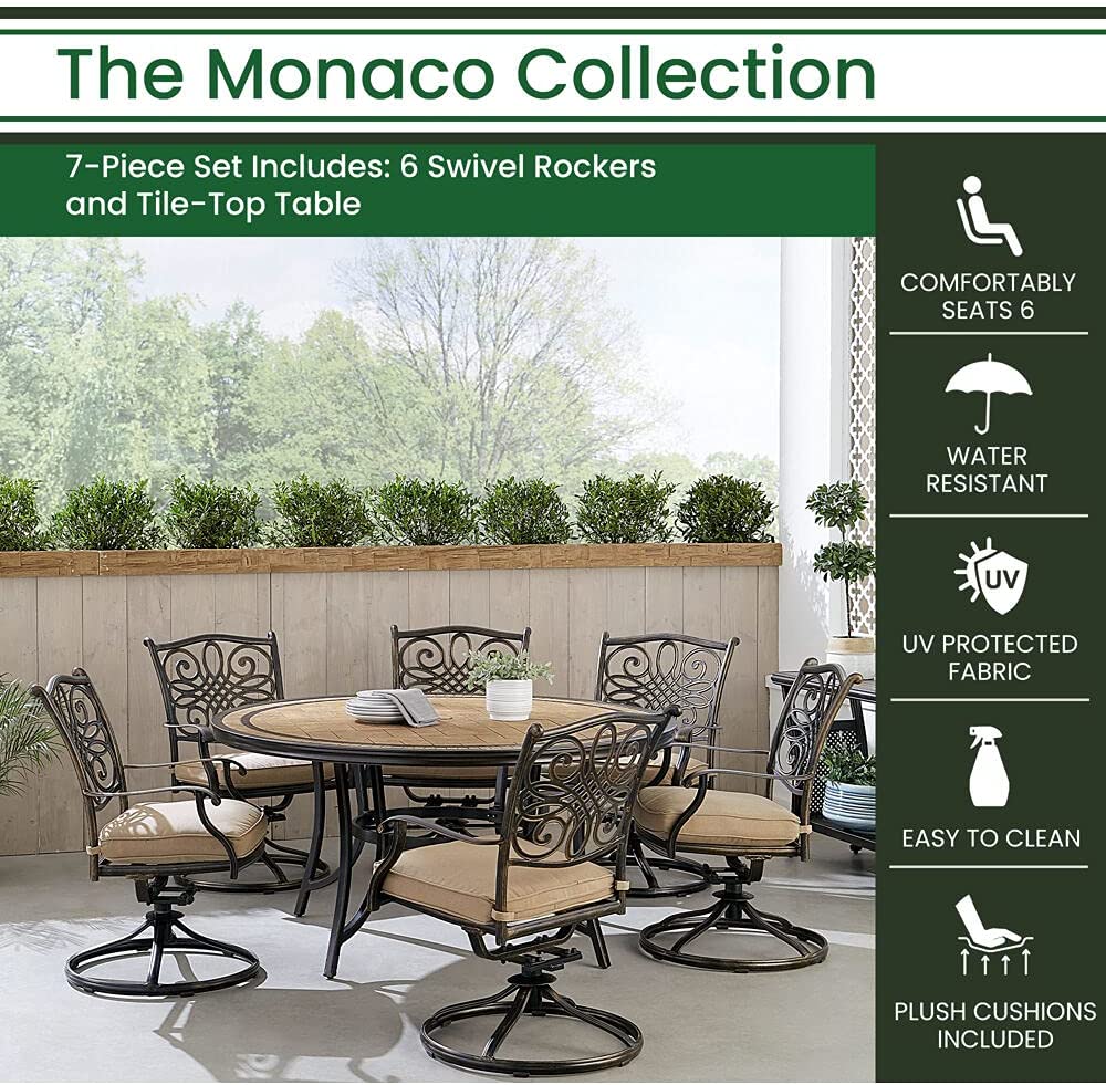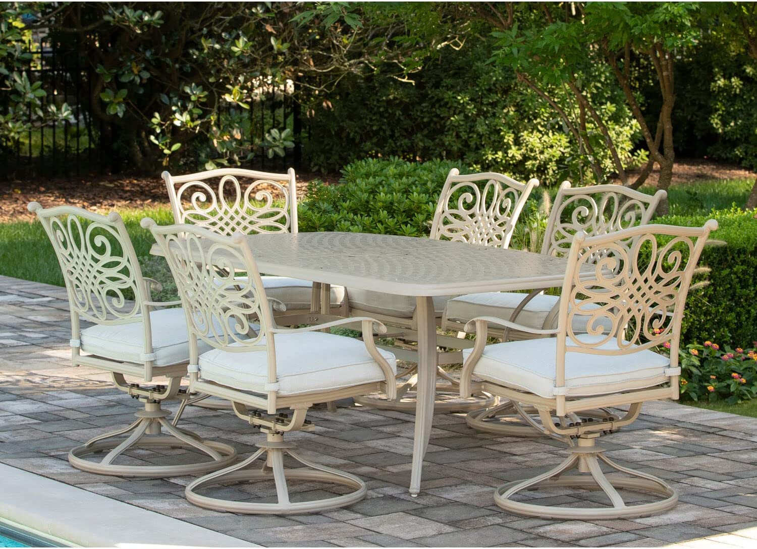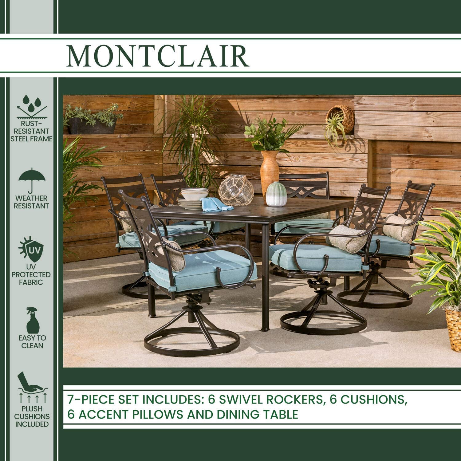 Hanover Montclair 7-Piece All-Weather Outdoor Patio Dining Set, 6 Swivel Rocker Chairs with Comfortable Tan Seat and Lumbar Cushions, 40"x66" Stamped Rectangle Table, MCLRDN7PCSQSW6-TAN