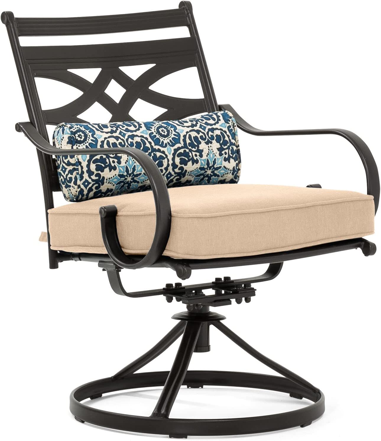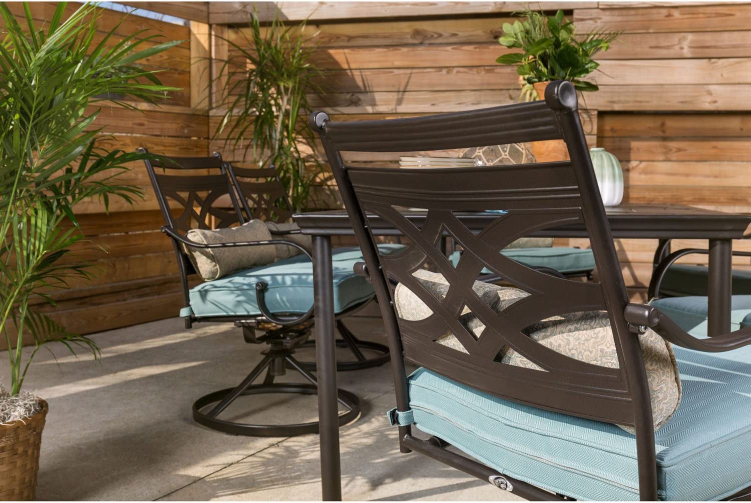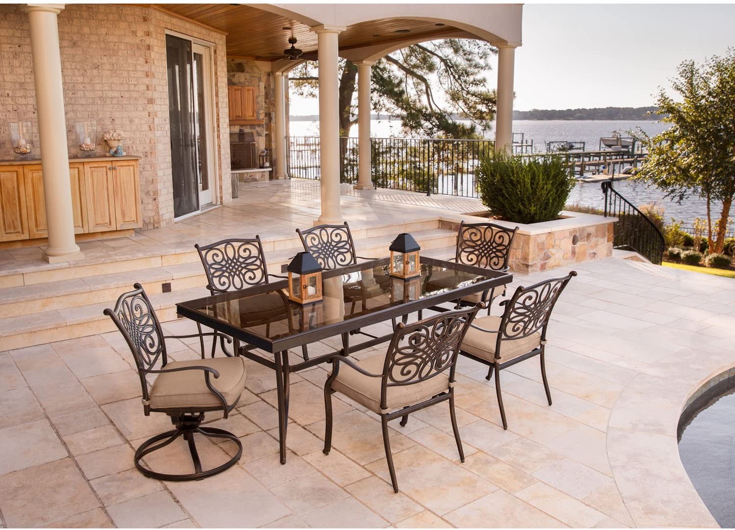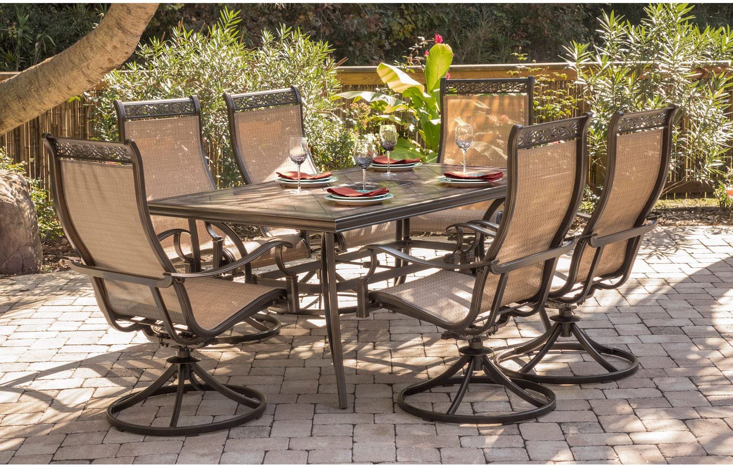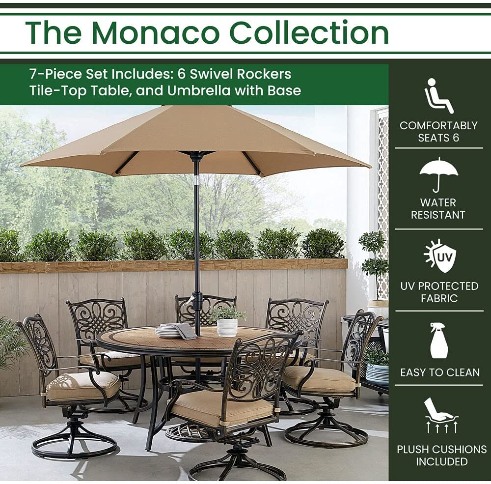 Hanover Montclair 7-Piece All-Weather Outdoor Patio Dining Set, 6 Swivel Rocker Chairs with Comfortable Tan Seat and Lumbar Cushions, 40"x66" Stamped Rectangle Table, MCLRDN7PCSQSW6-TAN