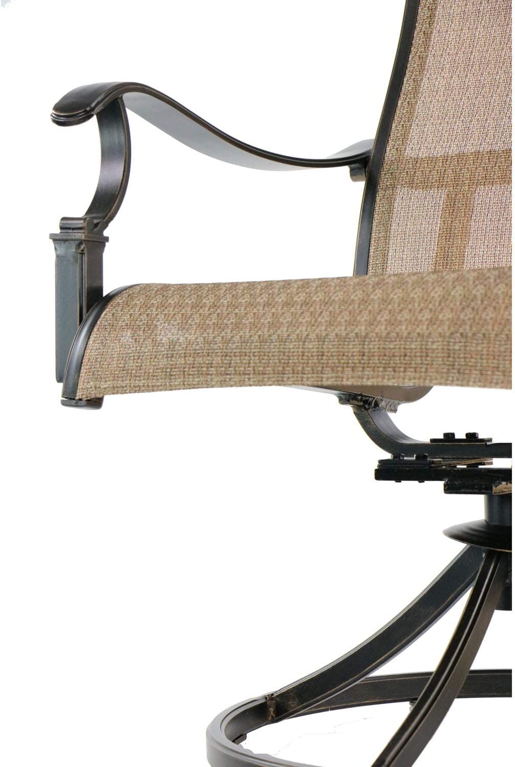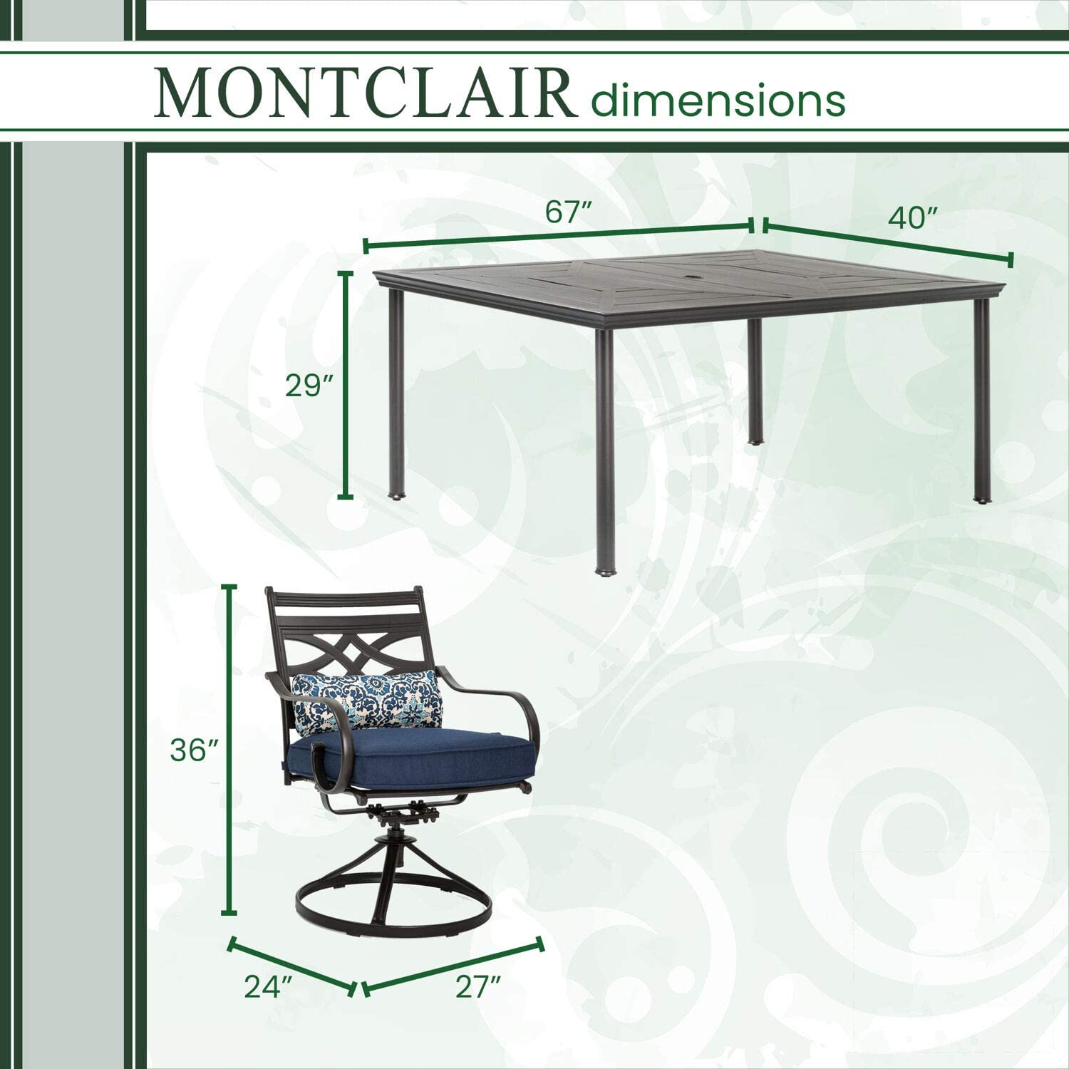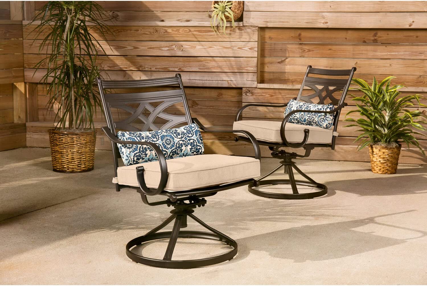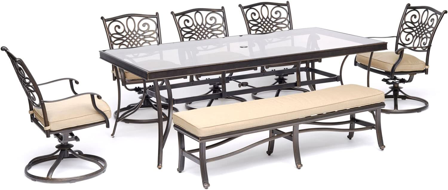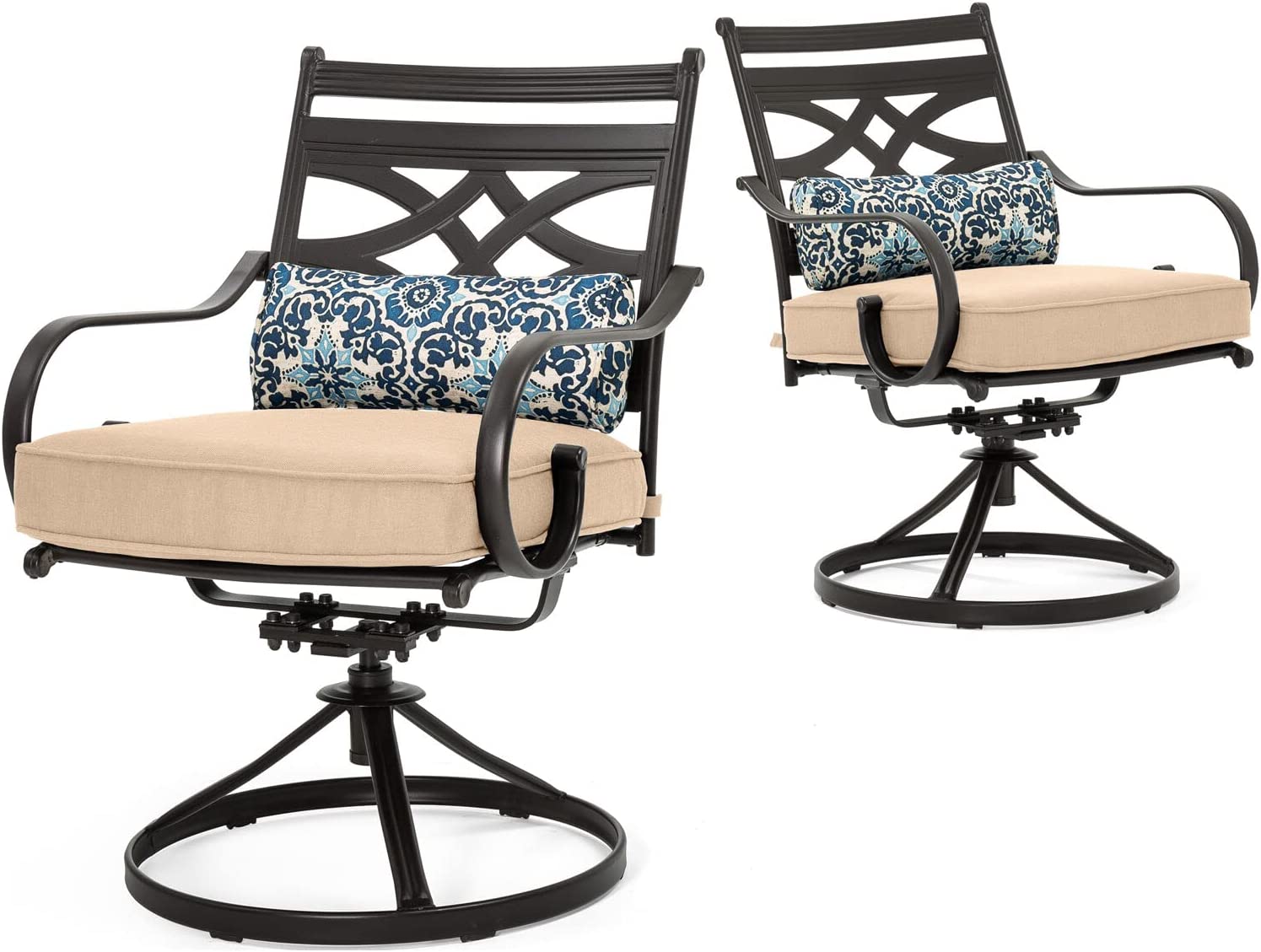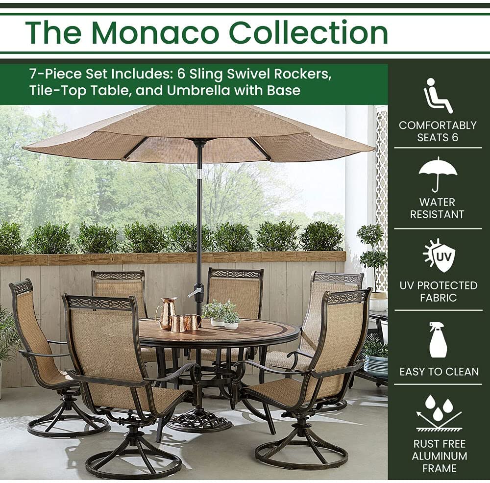 Hanover Montclair 7-Piece All-Weather Outdoor Patio Dining Set, 6 Swivel Rocker Chairs with Comfortable Tan Seat and Lumbar Cushions, 40"x66" Stamped Rectangle Table, MCLRDN7PCSQSW6-TAN