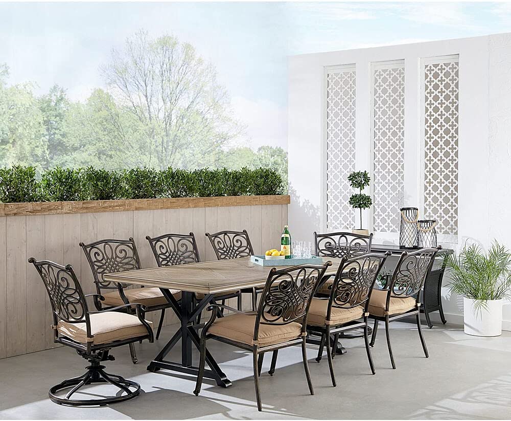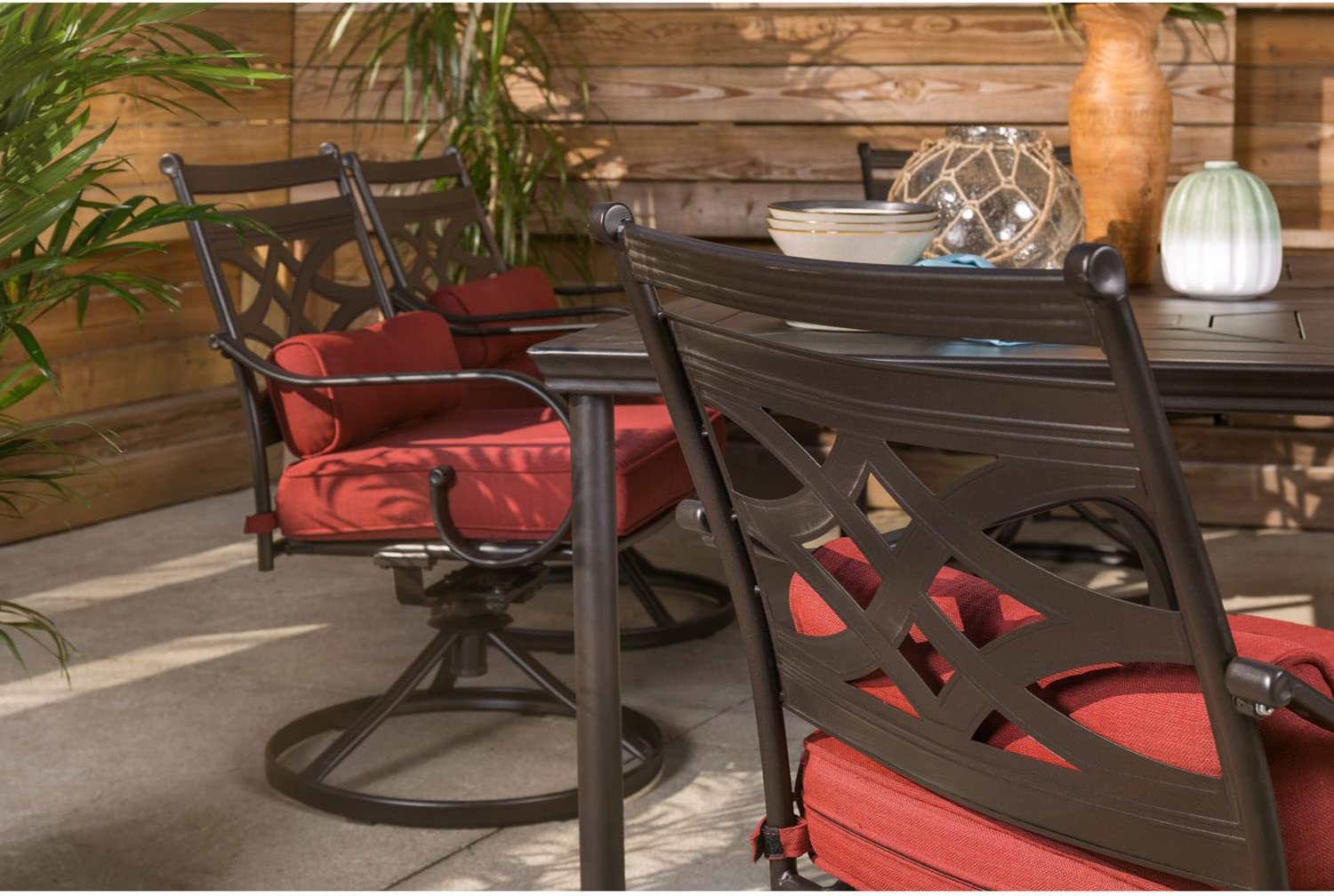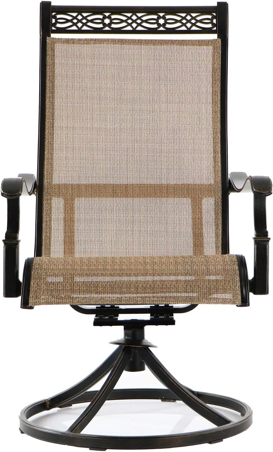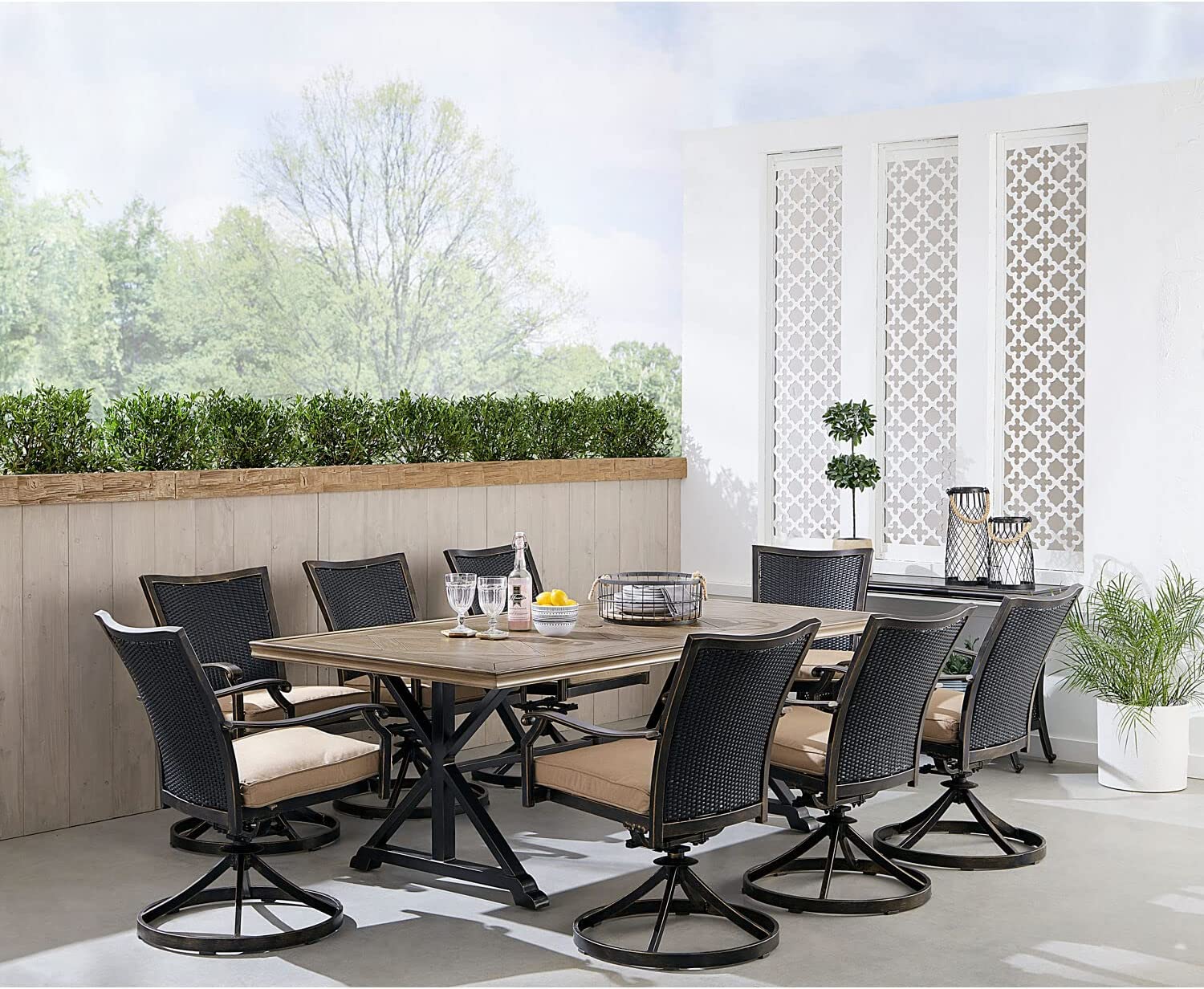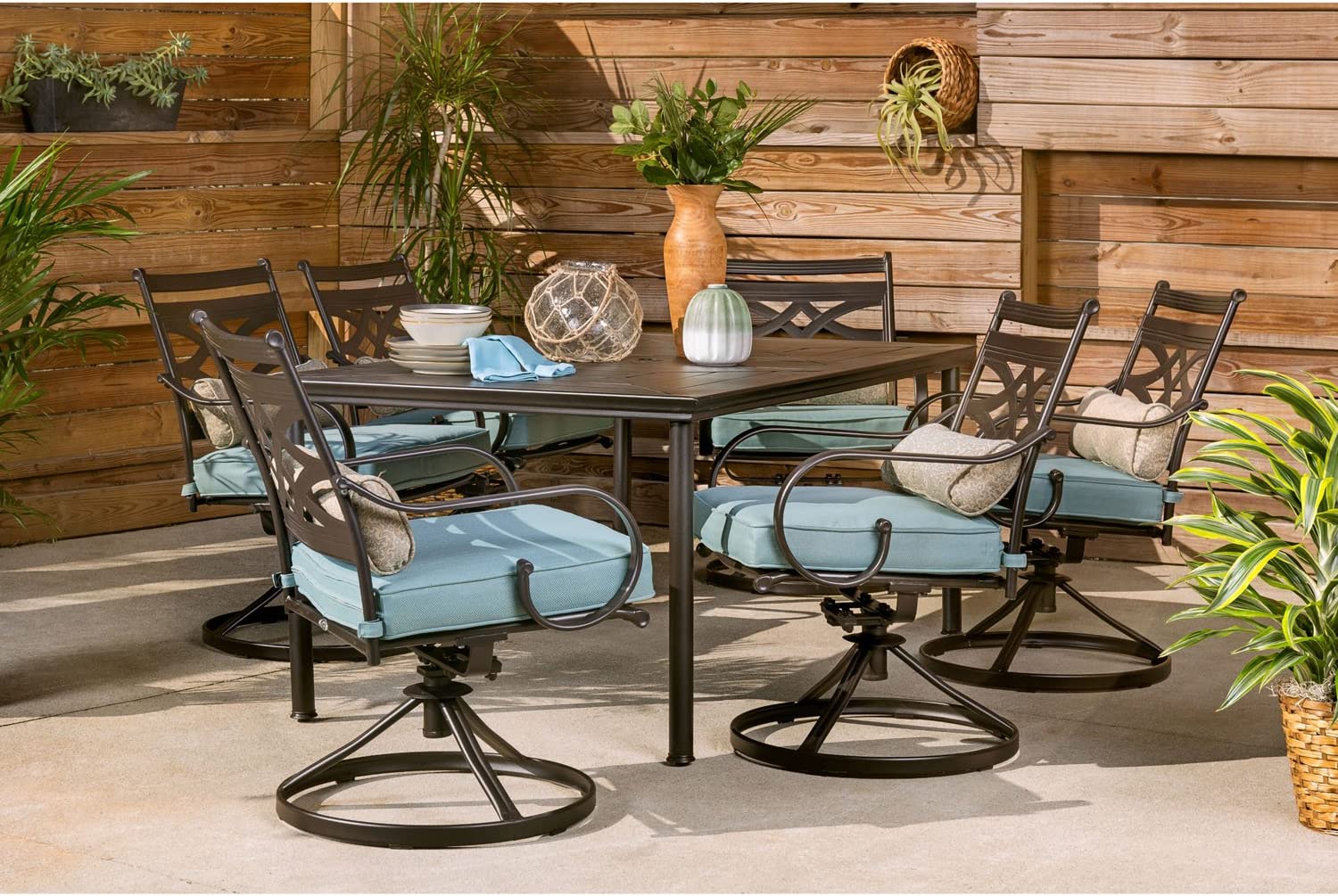 Hanover Montclair 7-Piece All-Weather Outdoor Patio Dining Set, 6 Swivel Rocker Chairs with Comfortable Tan Seat and Lumbar Cushions, 40"x66" Stamped Rectangle Table, MCLRDN7PCSQSW6-TAN