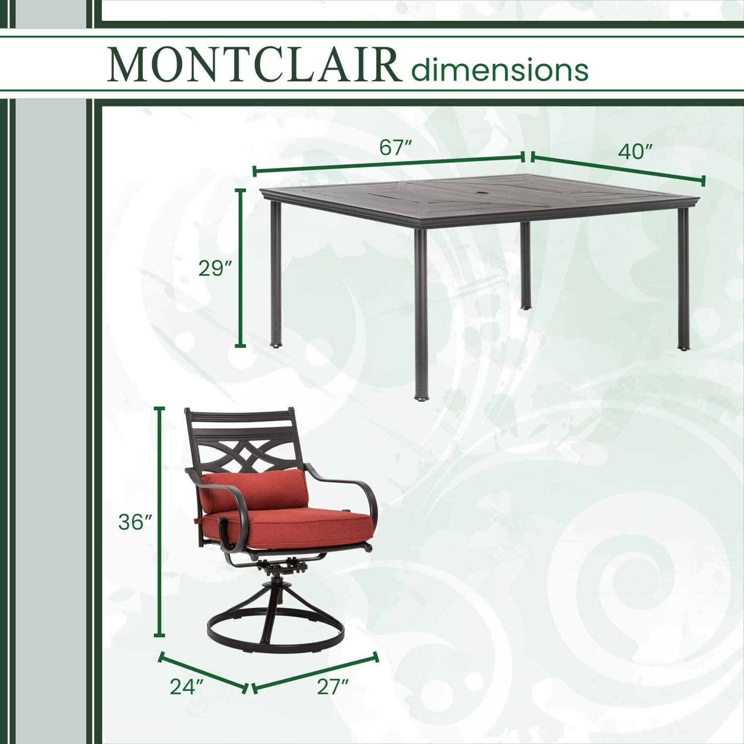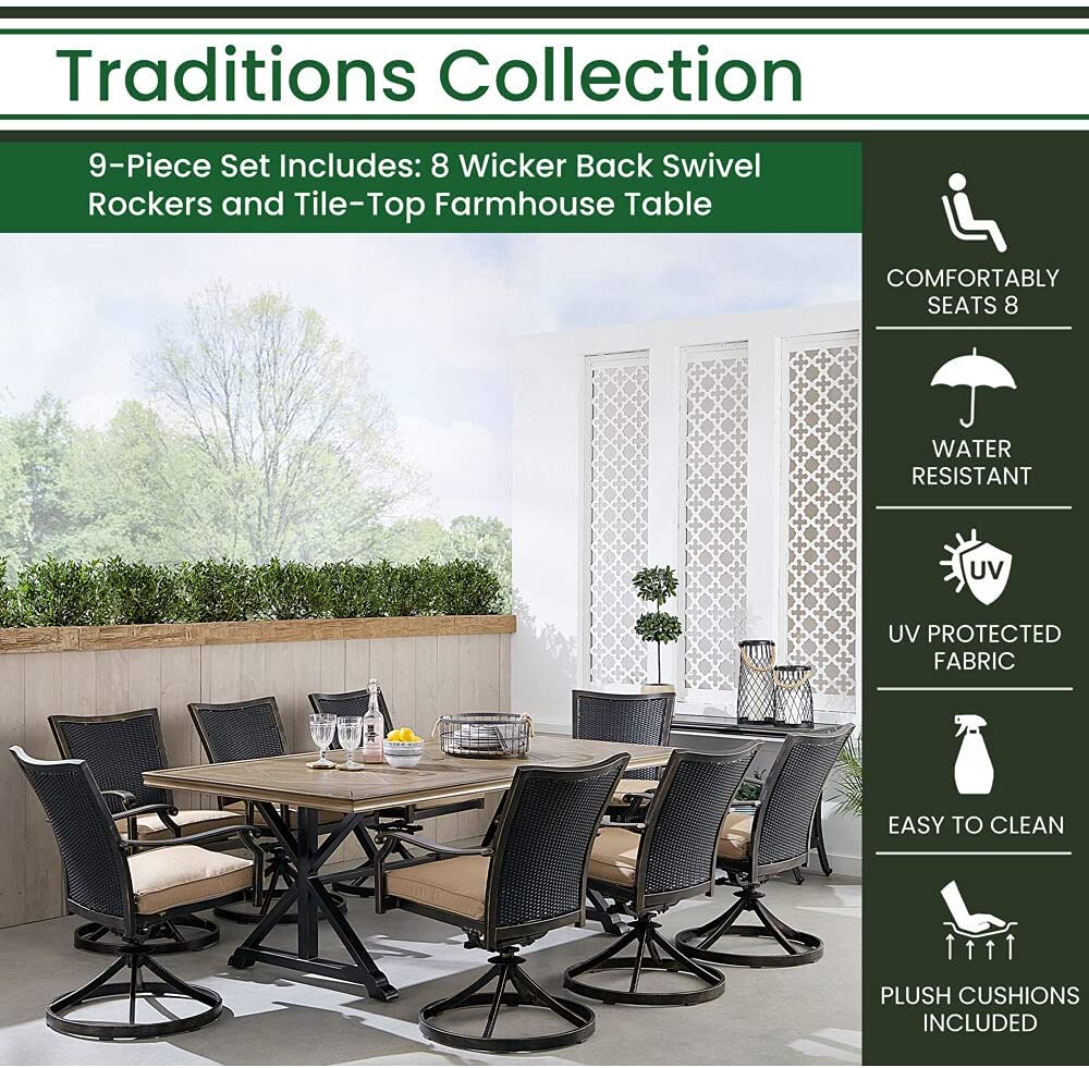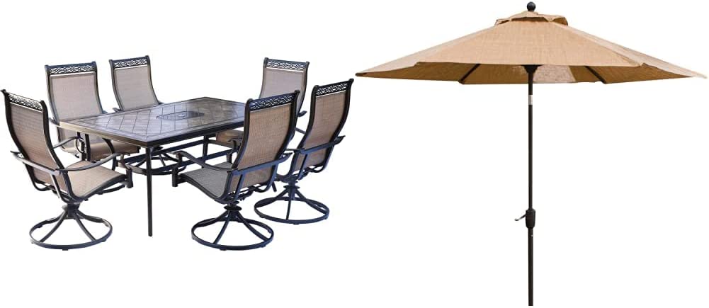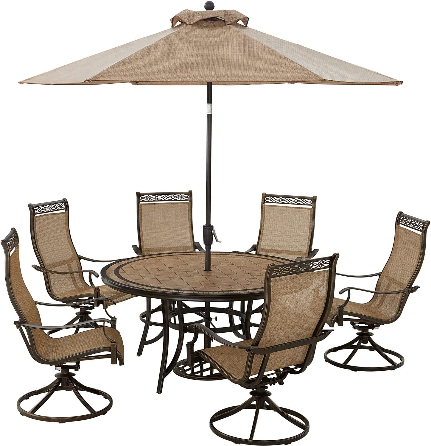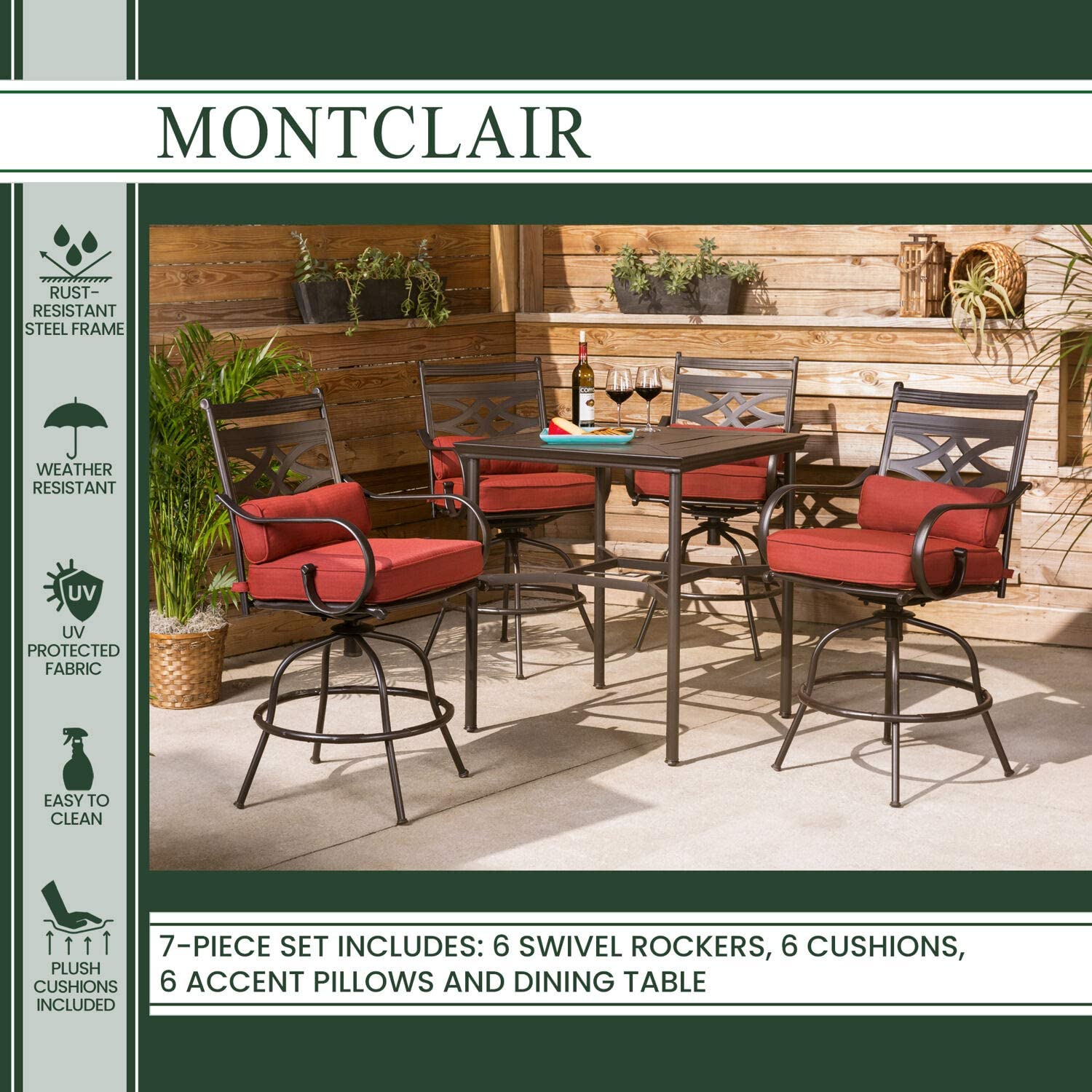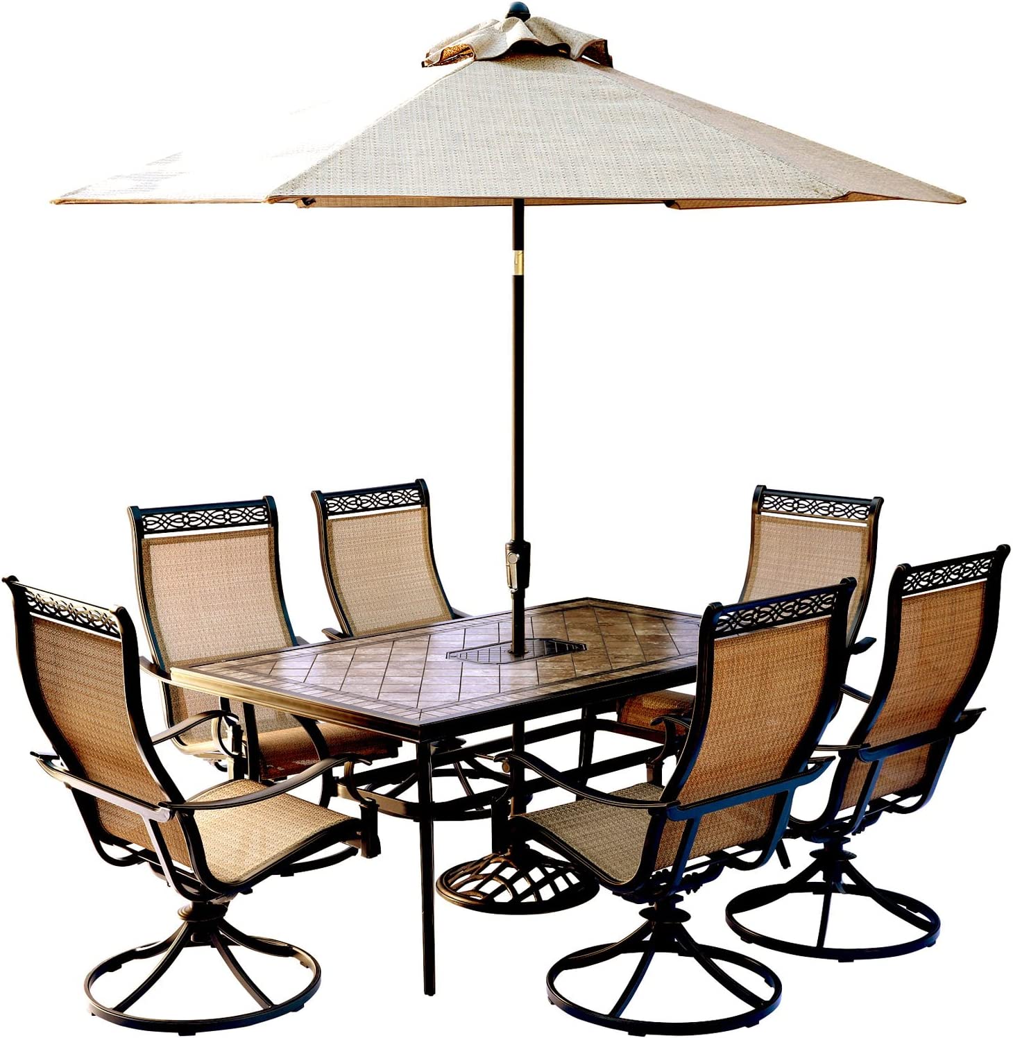 Hanover Montclair 7-Piece All-Weather Outdoor Patio Dining Set, 6 Swivel Rocker Chairs with Comfortable Tan Seat and Lumbar Cushions, 40"x66" Stamped Rectangle Table, MCLRDN7PCSQSW6-TAN
