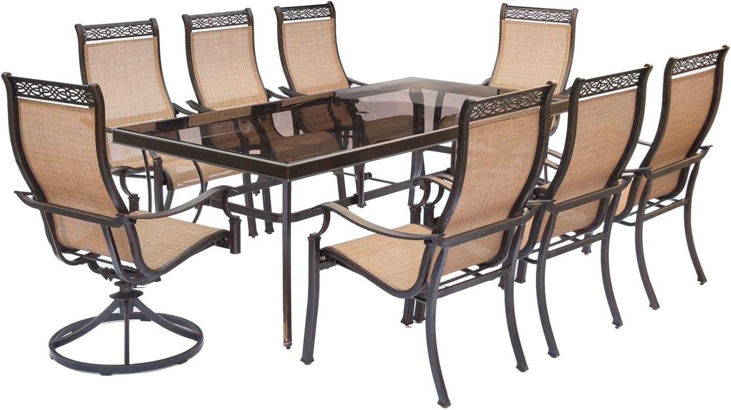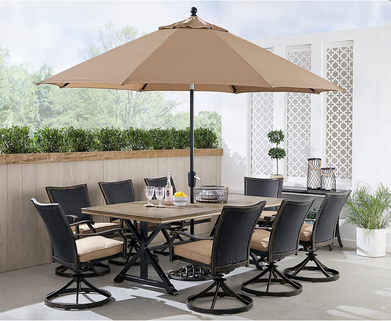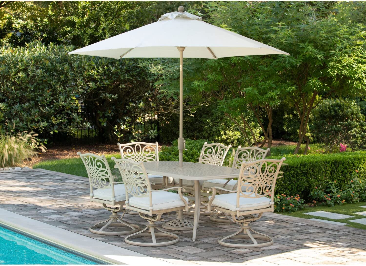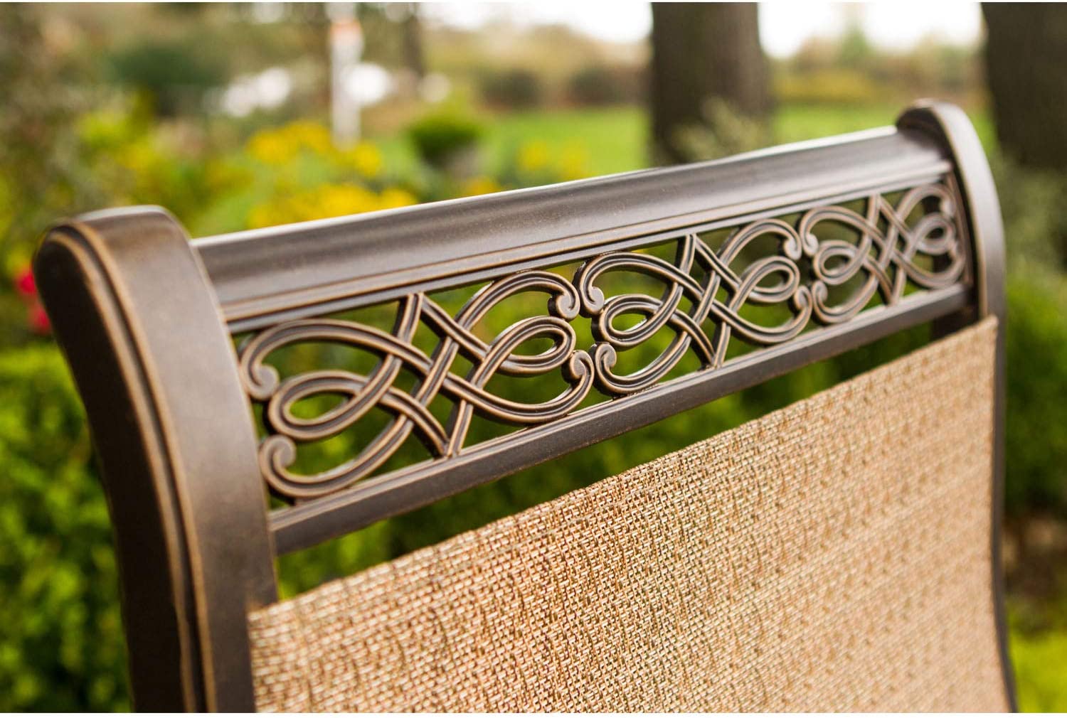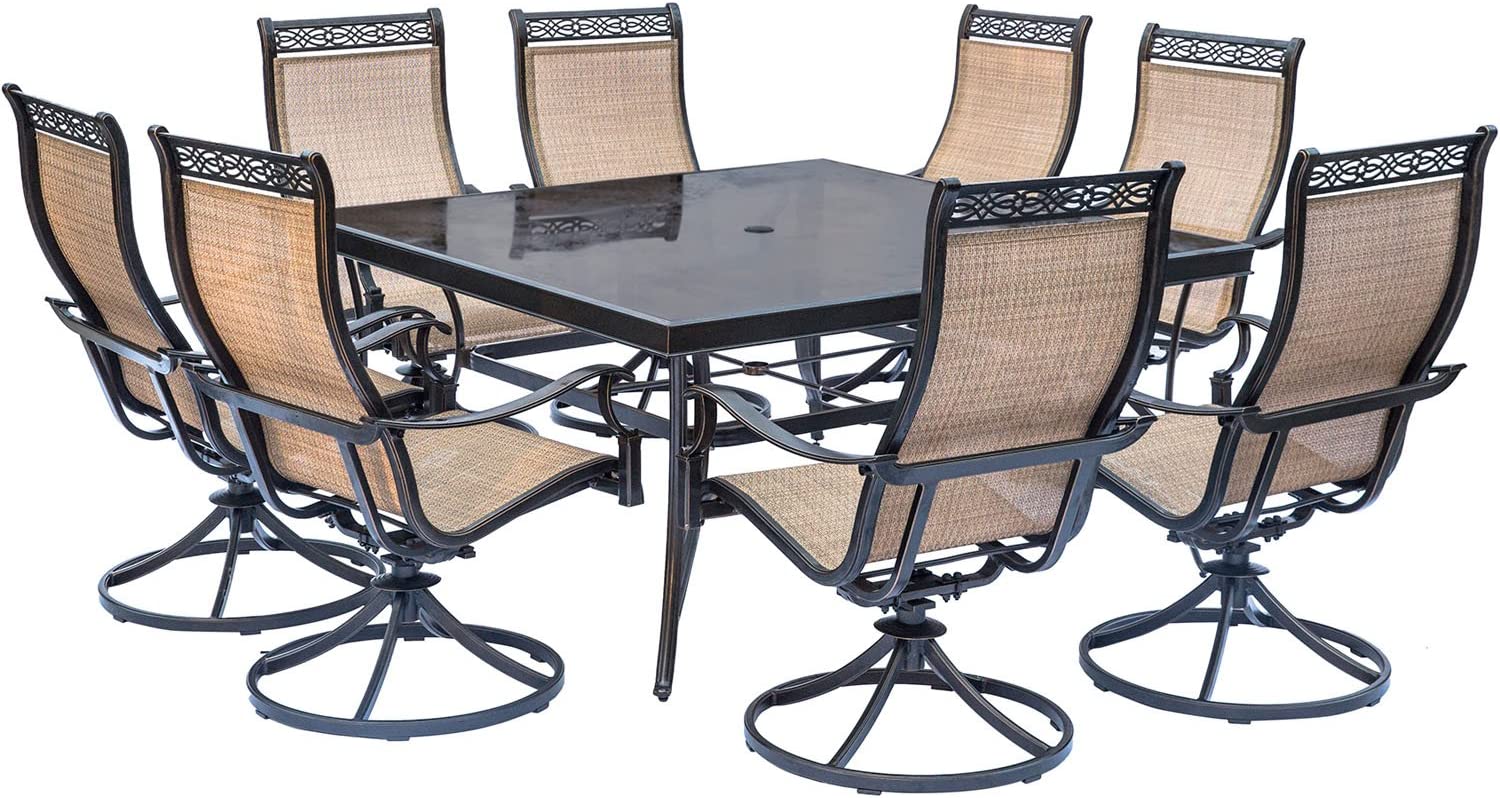 Hanover Montclair 7-Piece All-Weather Outdoor Patio Dining Set, 6 Swivel Rocker Chairs with Comfortable Tan Seat and Lumbar Cushions, 40"x66" Stamped Rectangle Table, MCLRDN7PCSQSW6-TAN