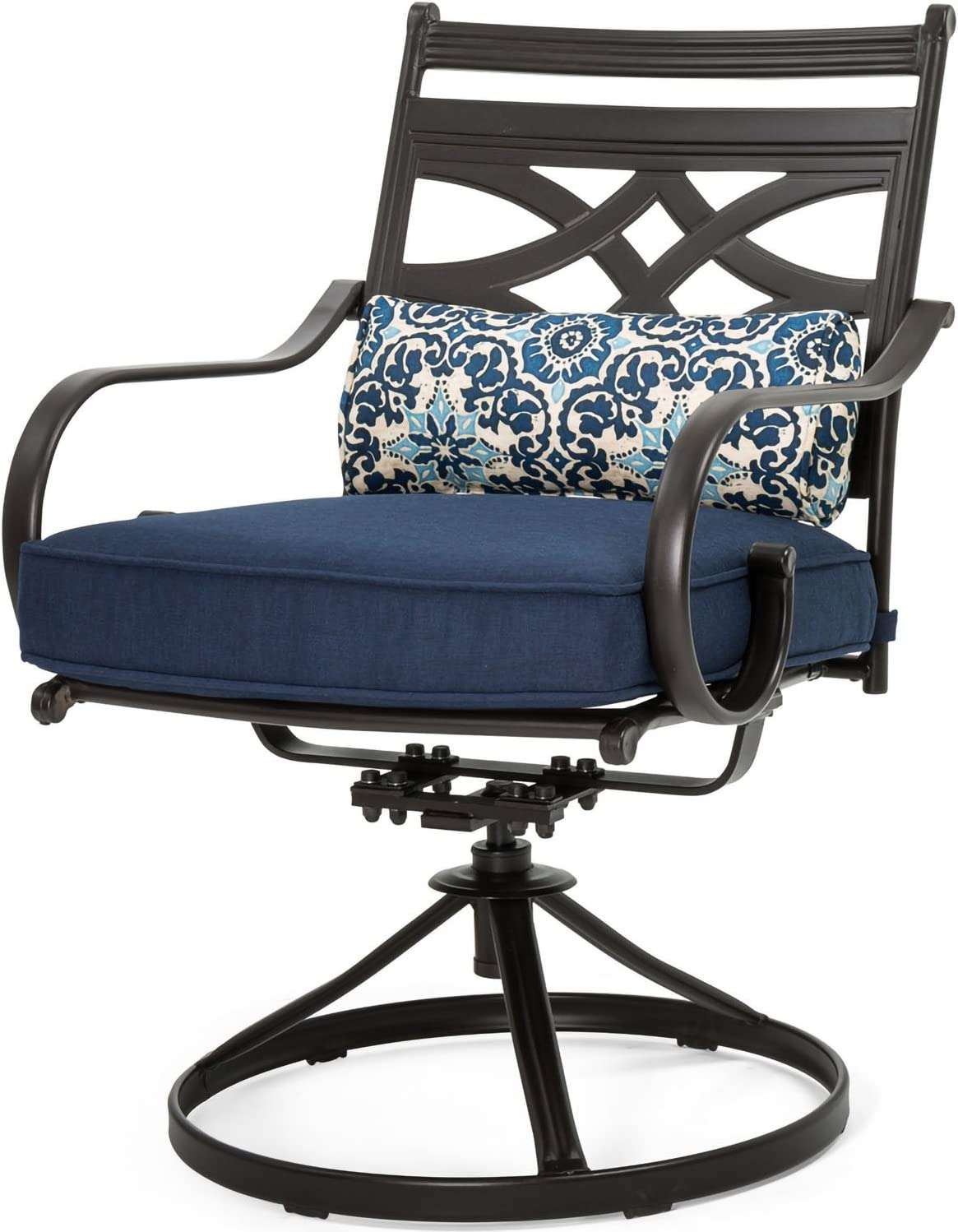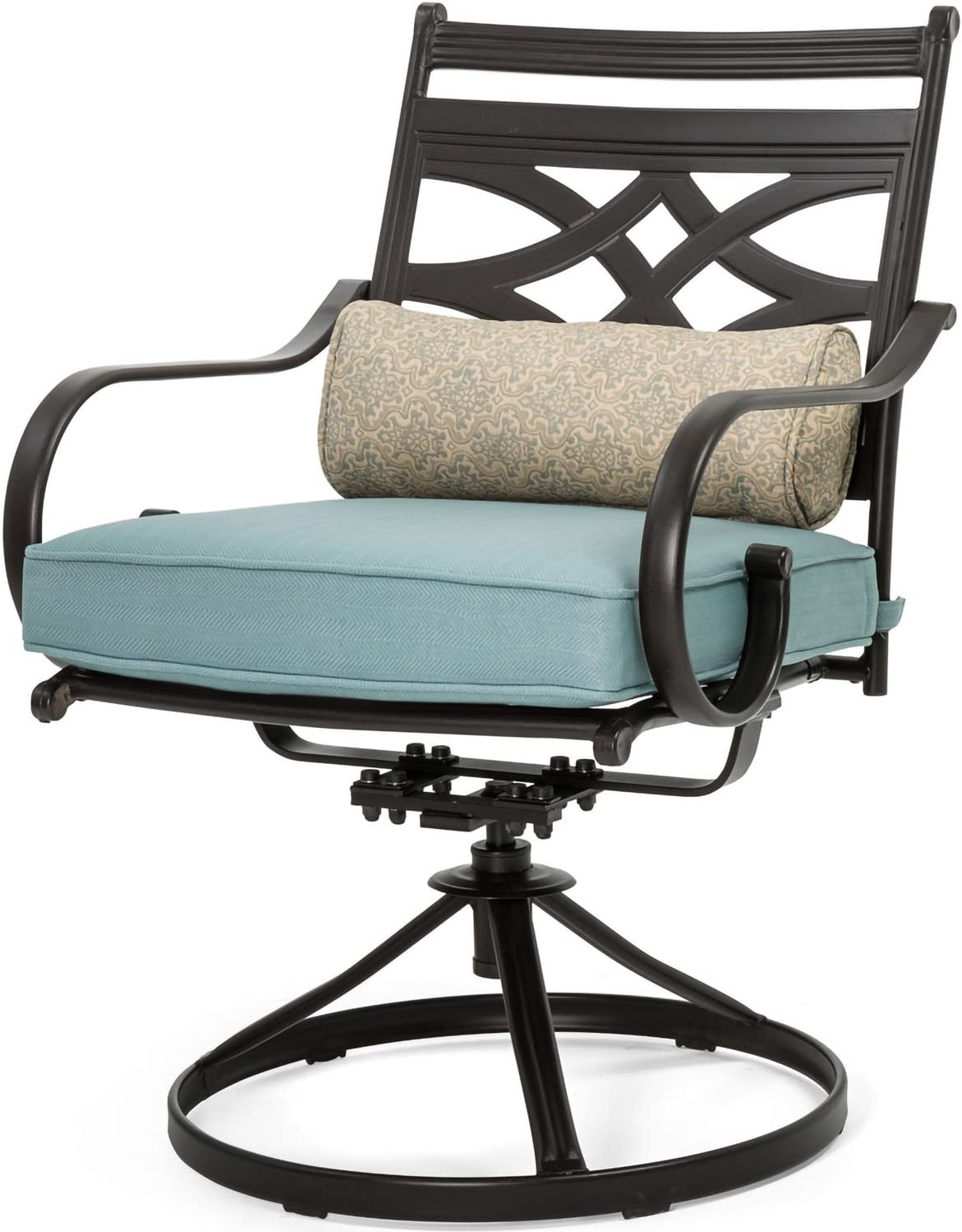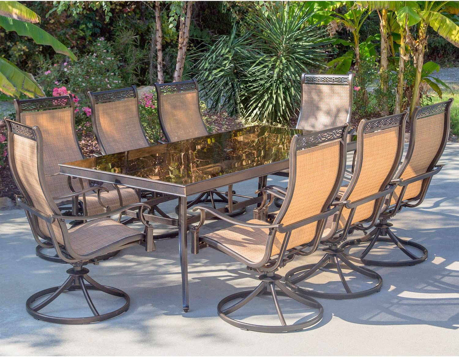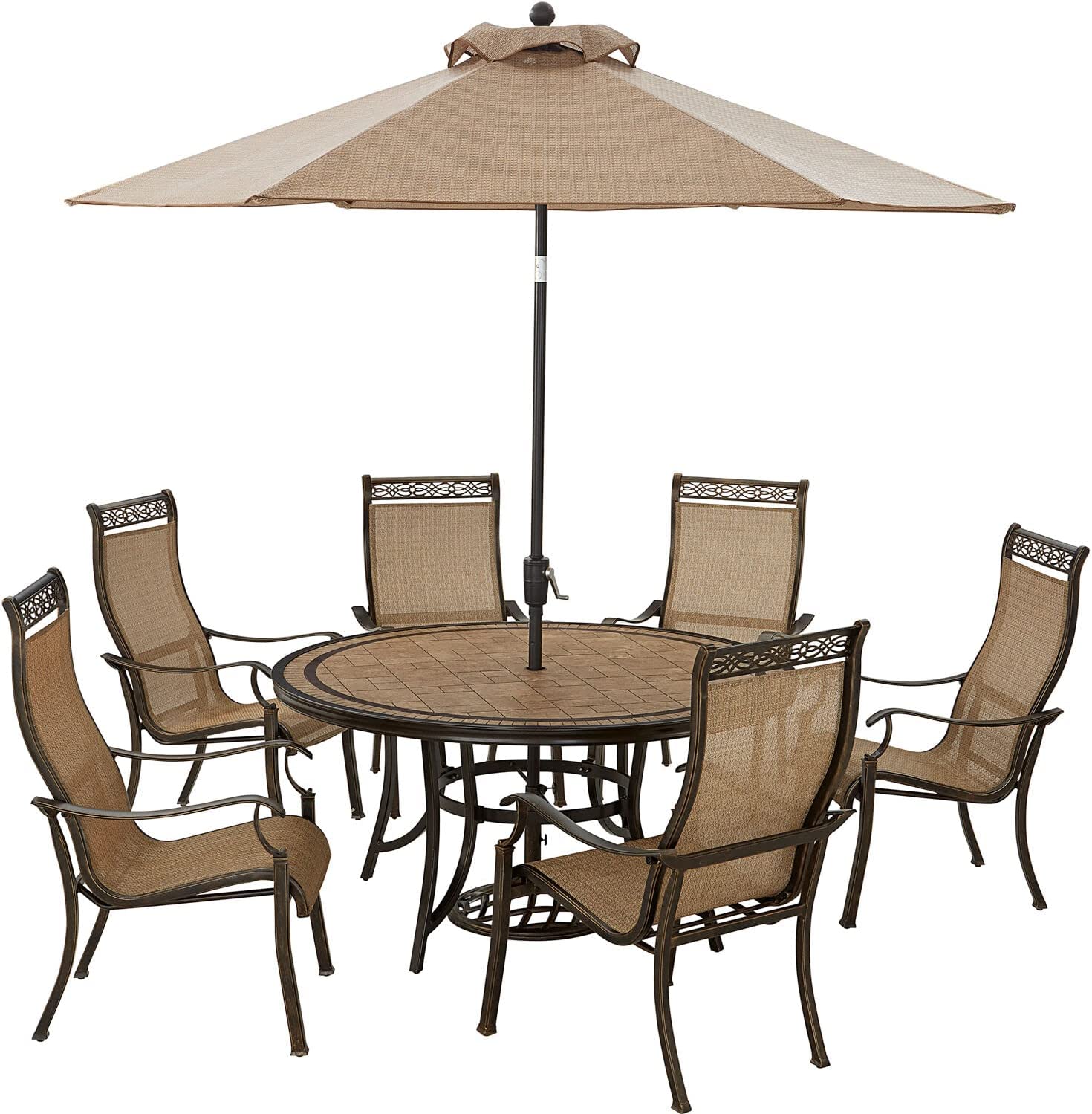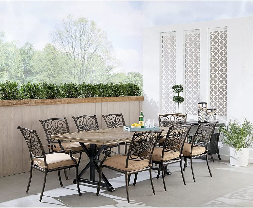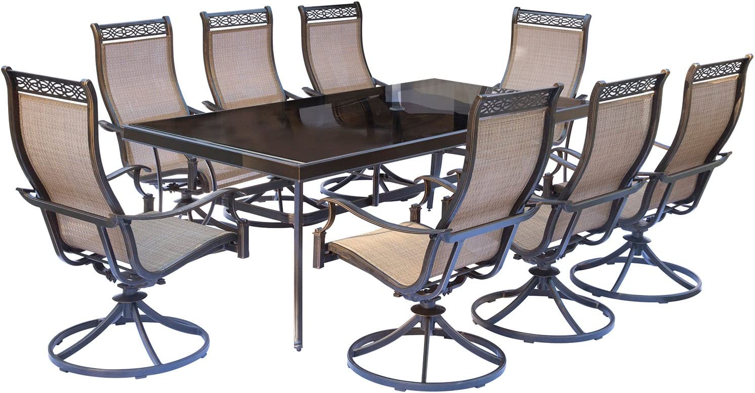 Hanover Montclair 7-Piece All-Weather Outdoor Patio Dining Set, 6 Swivel Rocker Chairs with Comfortable Tan Seat and Lumbar Cushions, 40"x66" Stamped Rectangle Table, MCLRDN7PCSQSW6-TAN