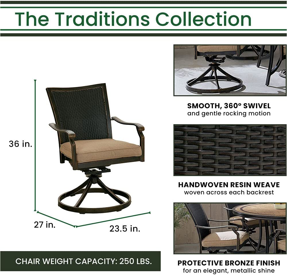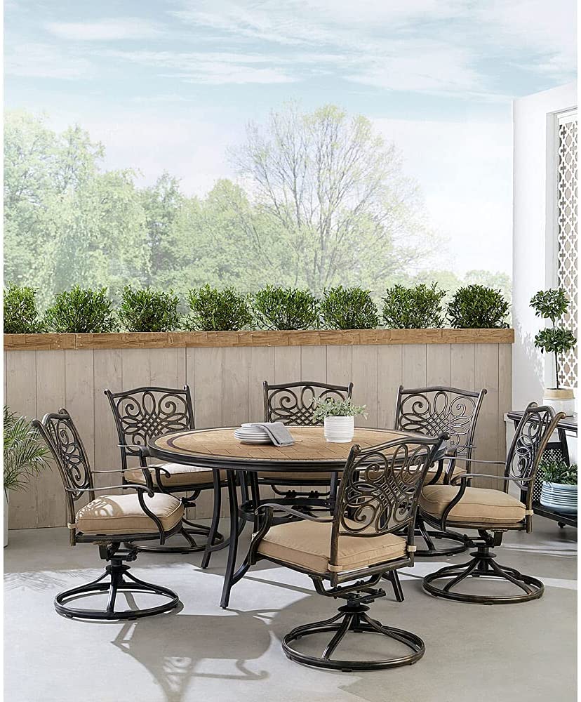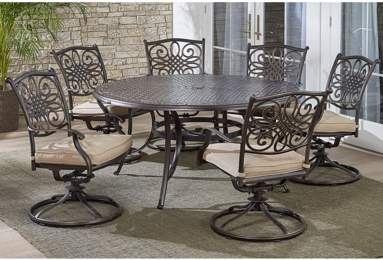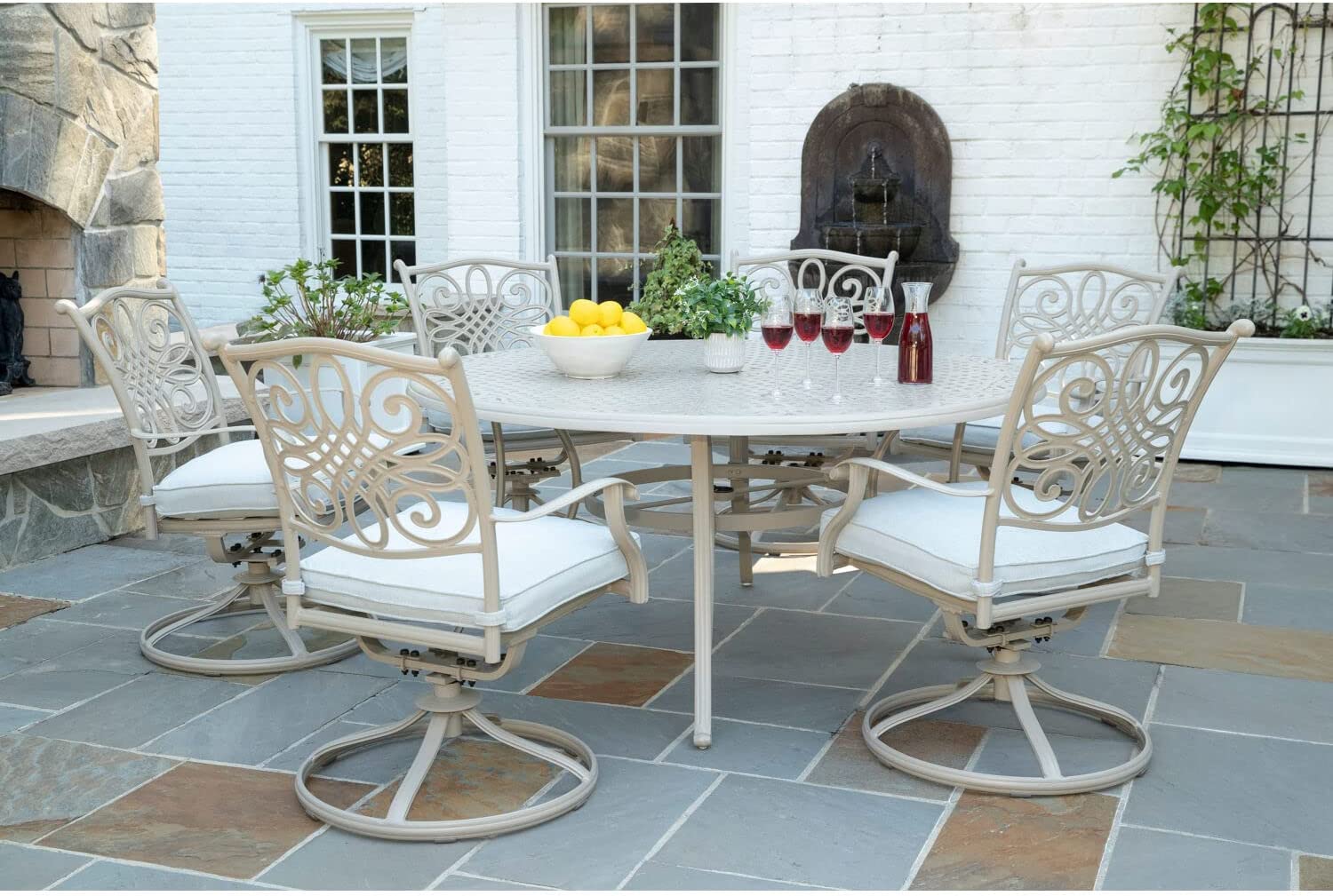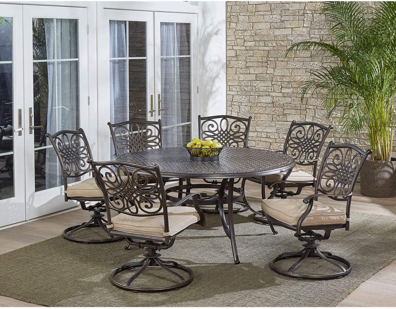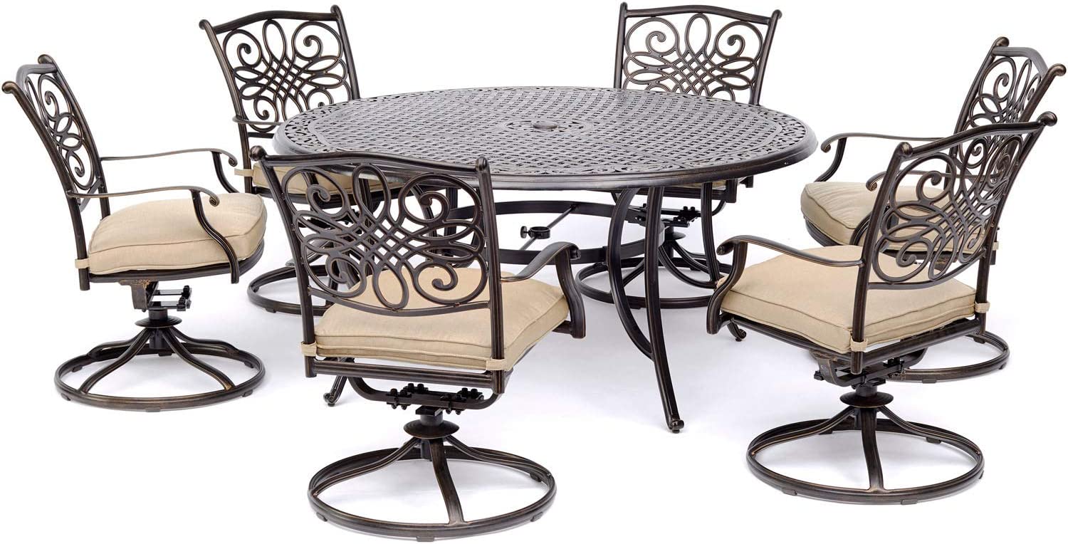 Hanover 7-Piece Tan with a 60 Cast-top Six Traditions Rust-Free Outdoor Patio Set Cushions, 6 Swivel Rockers and Aluminum Round Dining Table