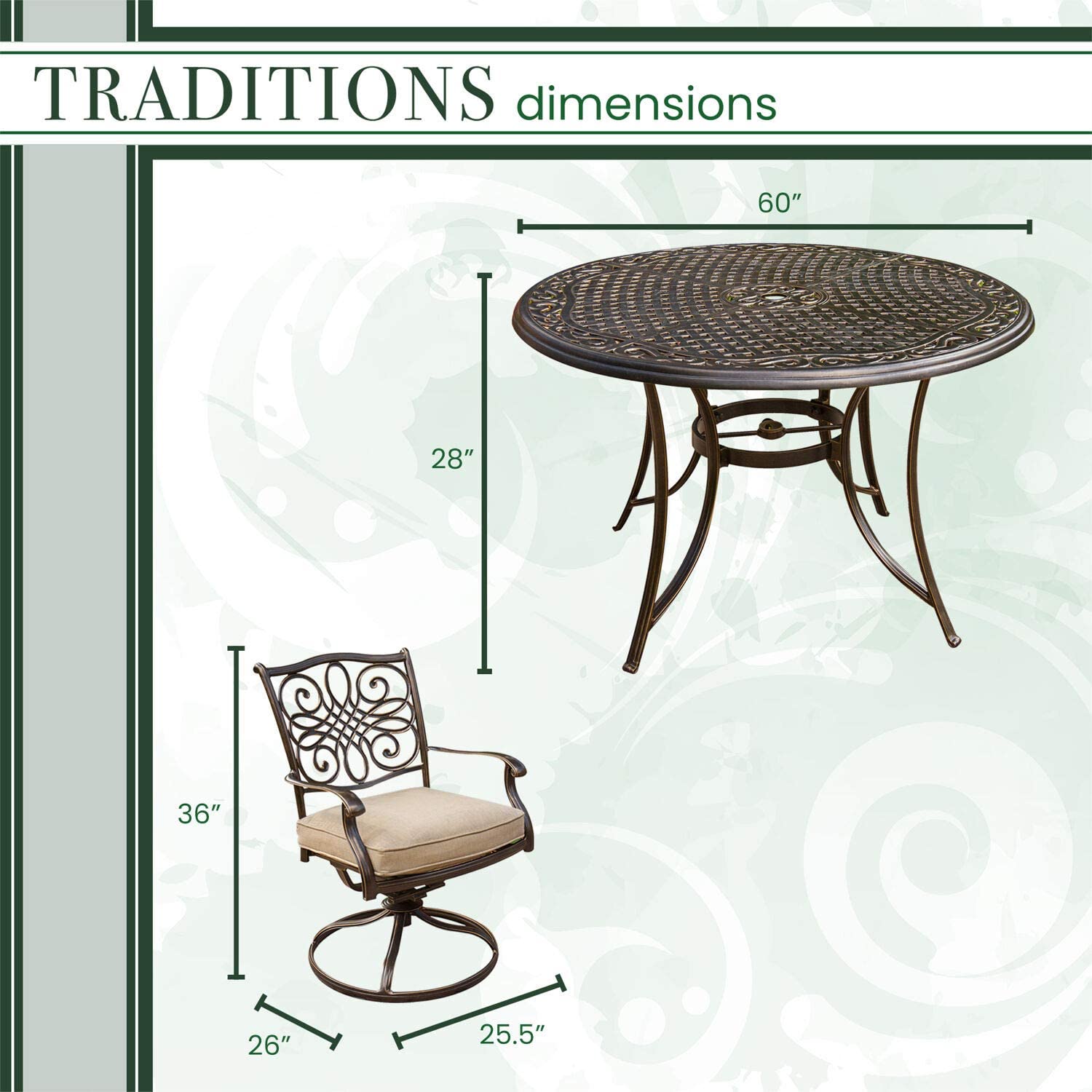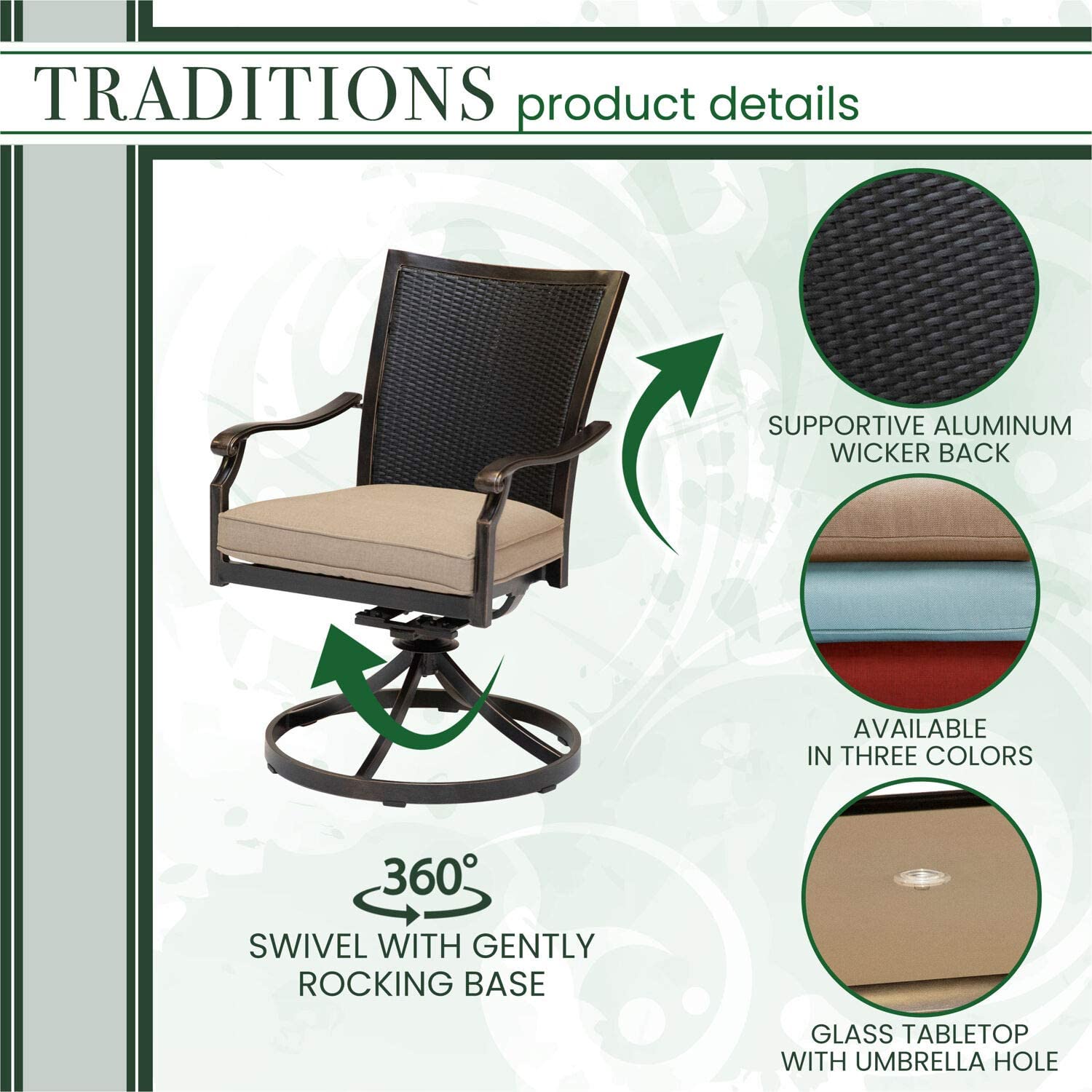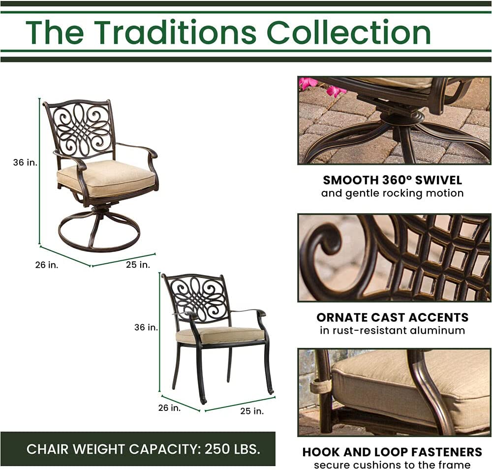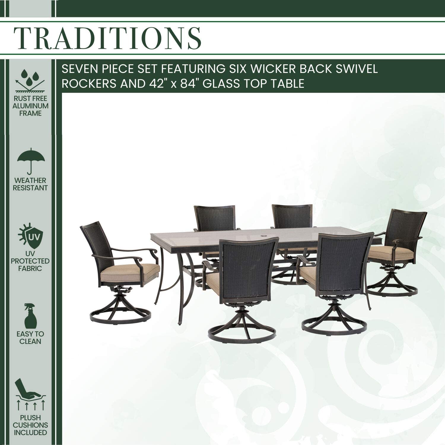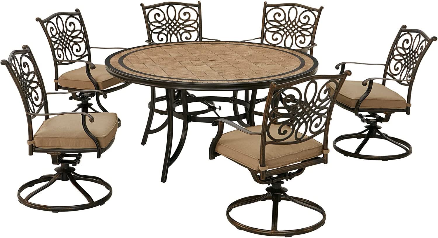 Hanover 7-Piece Tan with a 60 Cast-top Six Traditions Rust-Free Outdoor Patio Set Cushions, 6 Swivel Rockers and Aluminum Round Dining Table