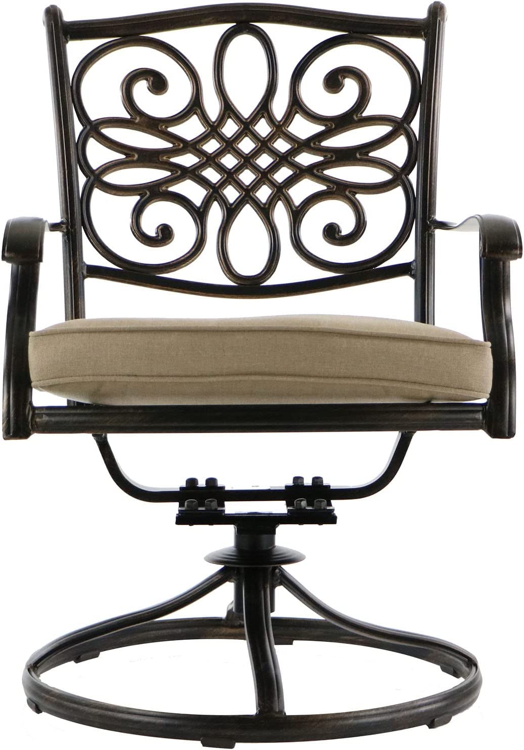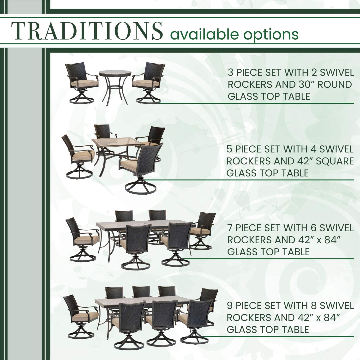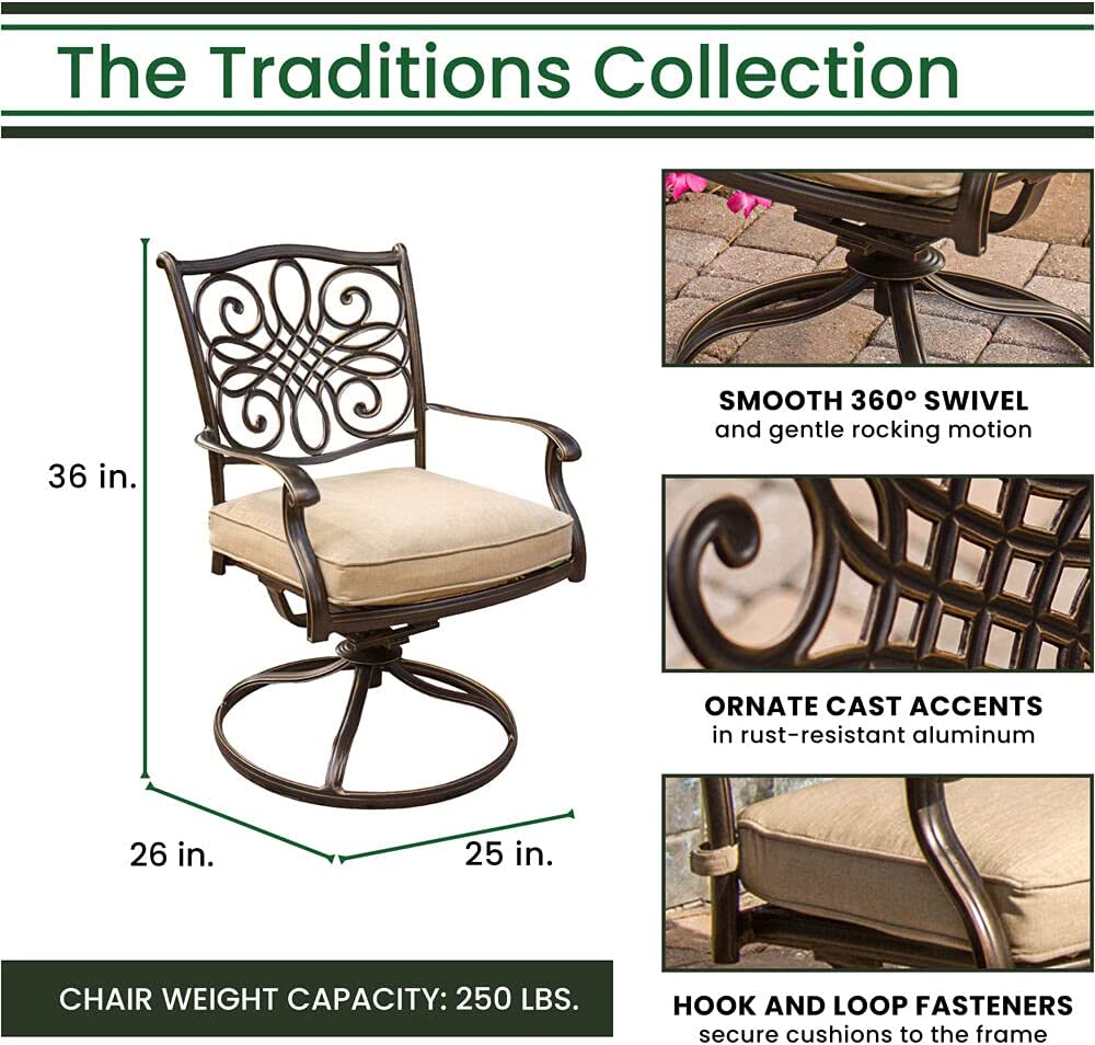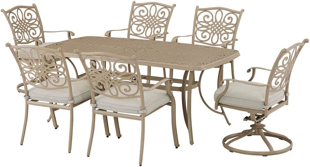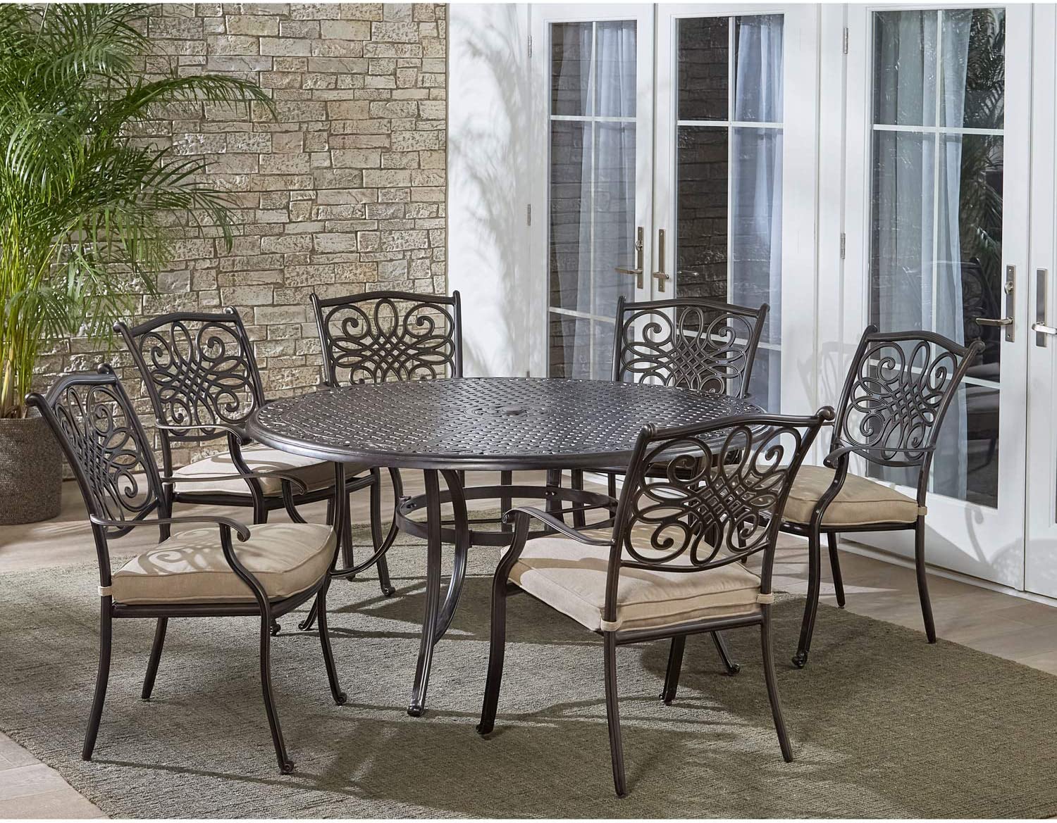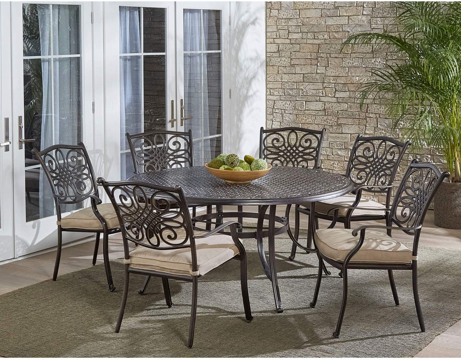Hanover 7-Piece Tan with a 60 Cast-top Six Traditions Rust-Free Outdoor Patio Set Cushions, 6 Swivel Rockers and Aluminum Round Dining Table