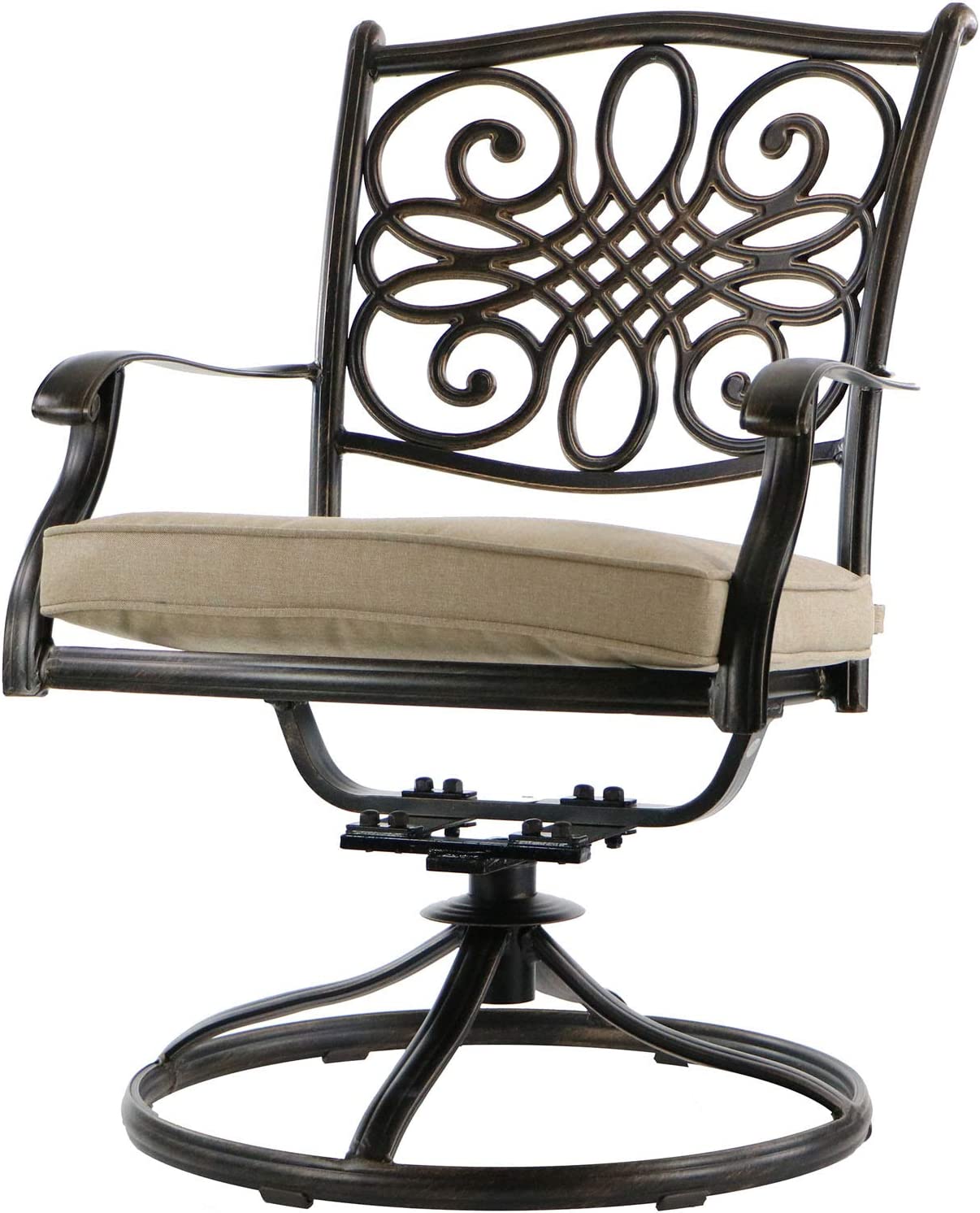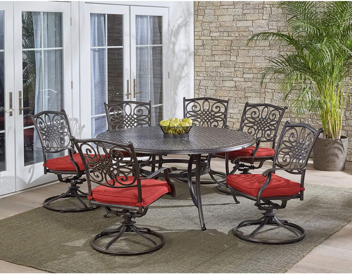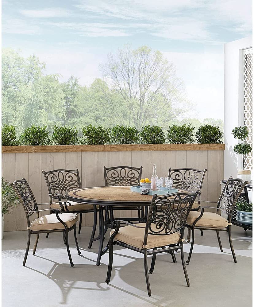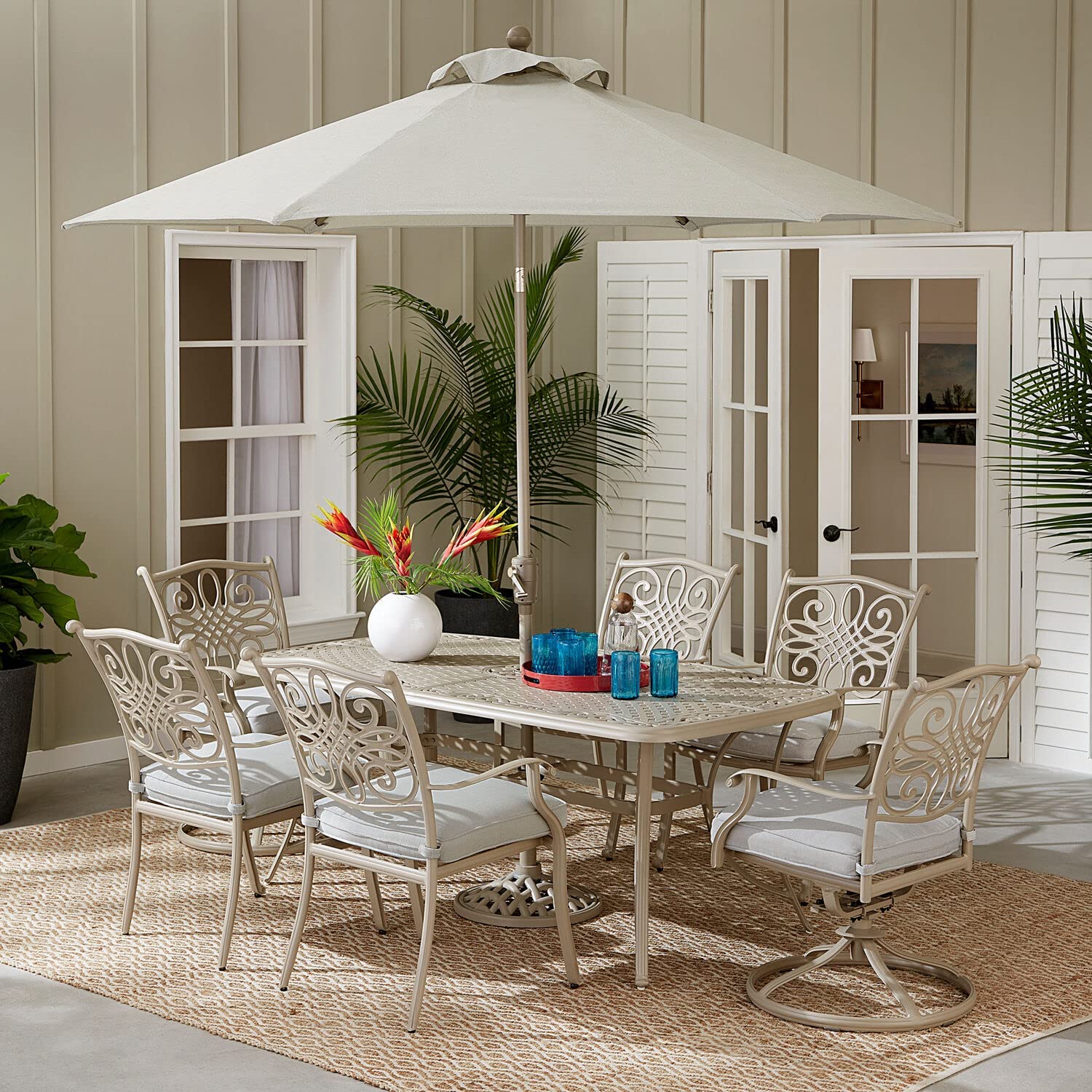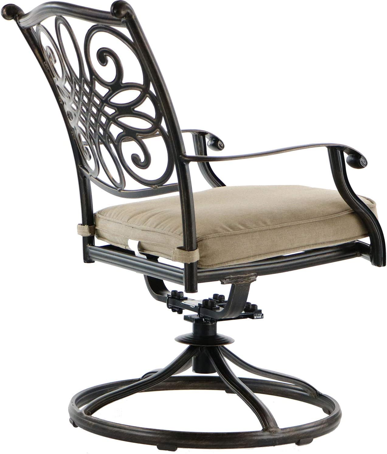 Hanover 7-Piece Tan with a 60 Cast-top Six Traditions Rust-Free Outdoor Patio Set Cushions, 6 Swivel Rockers and Aluminum Round Dining Table