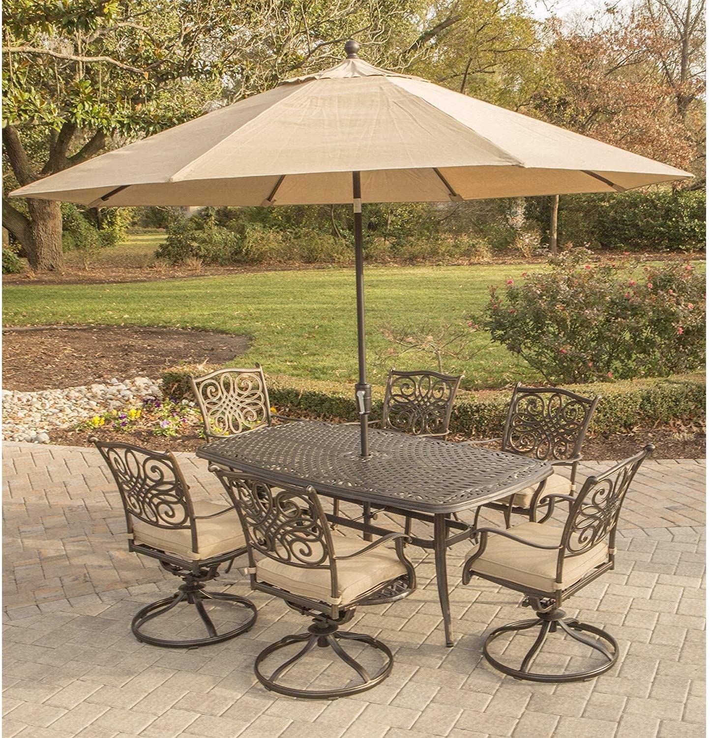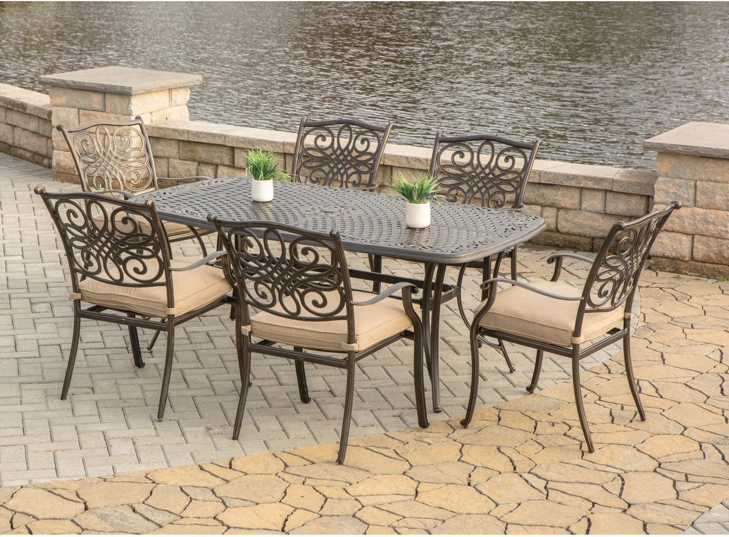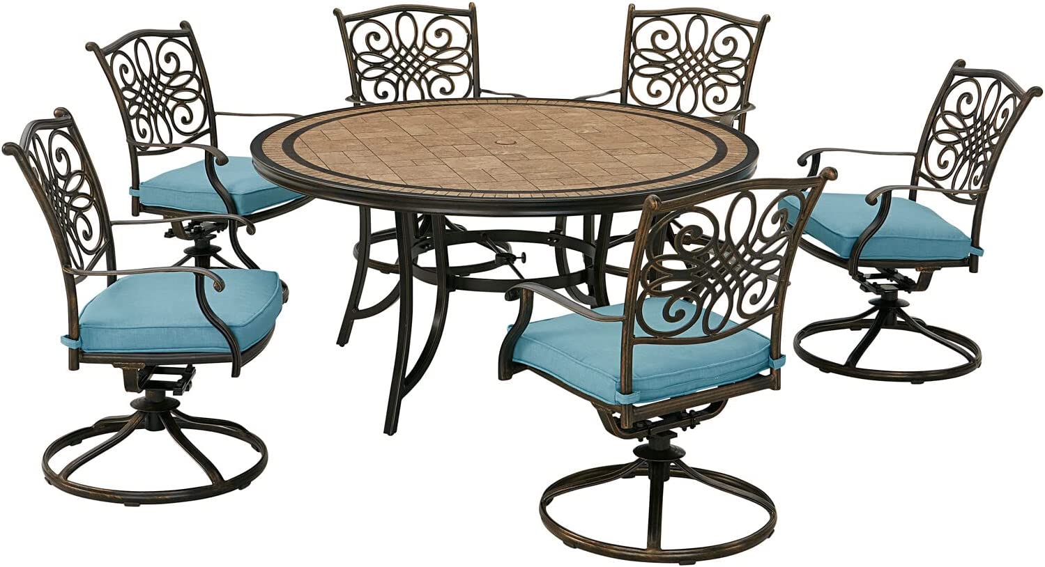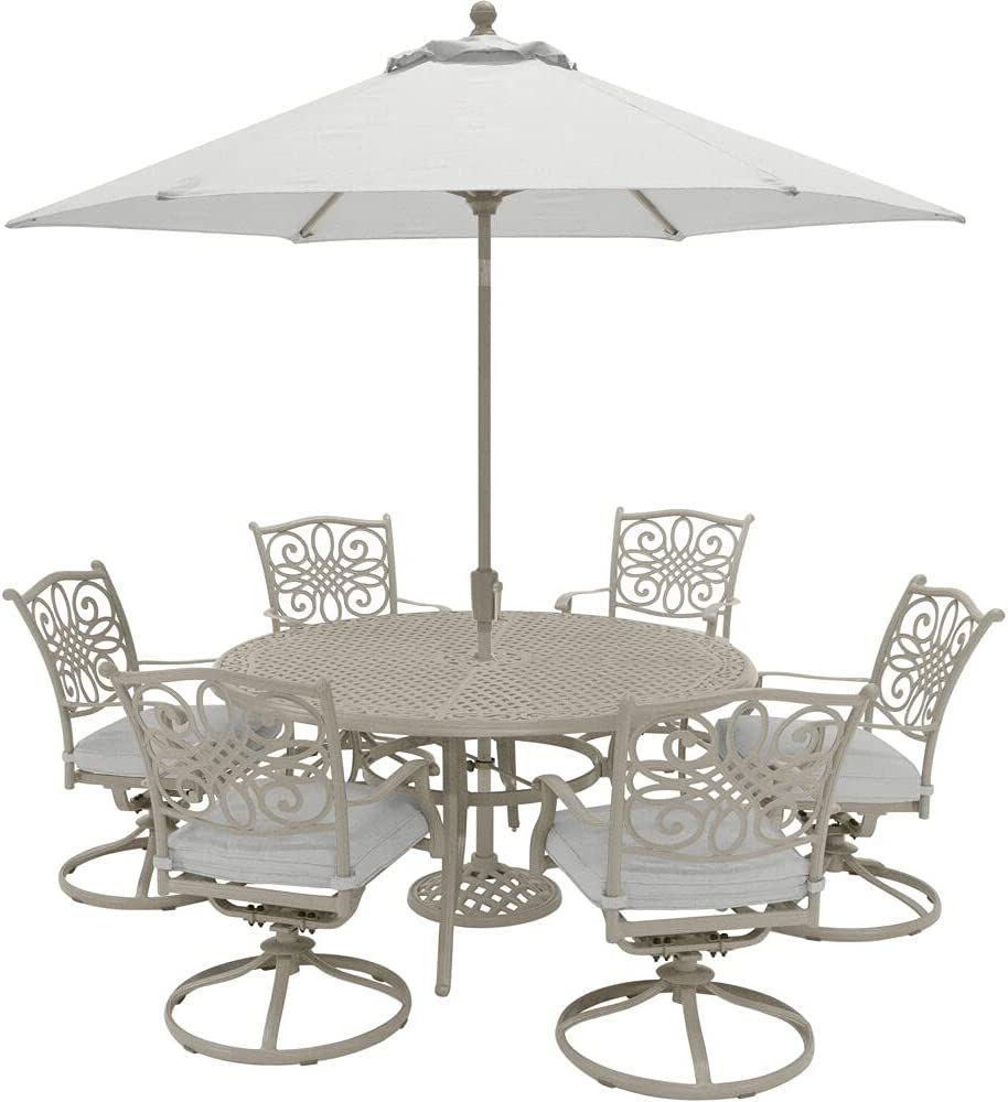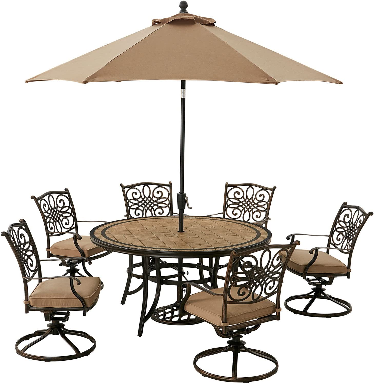 Hanover 7-Piece Tan with a 60 Cast-top Six Traditions Rust-Free Outdoor Patio Set Cushions, 6 Swivel Rockers and Aluminum Round Dining Table