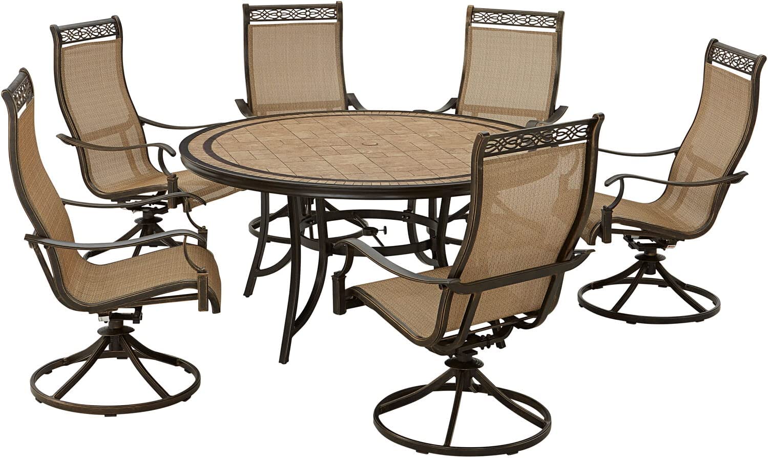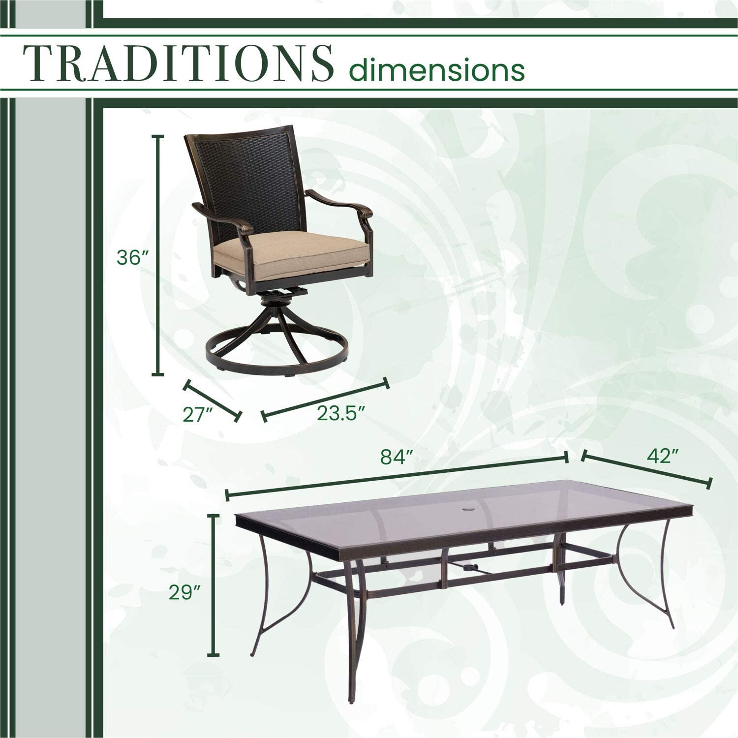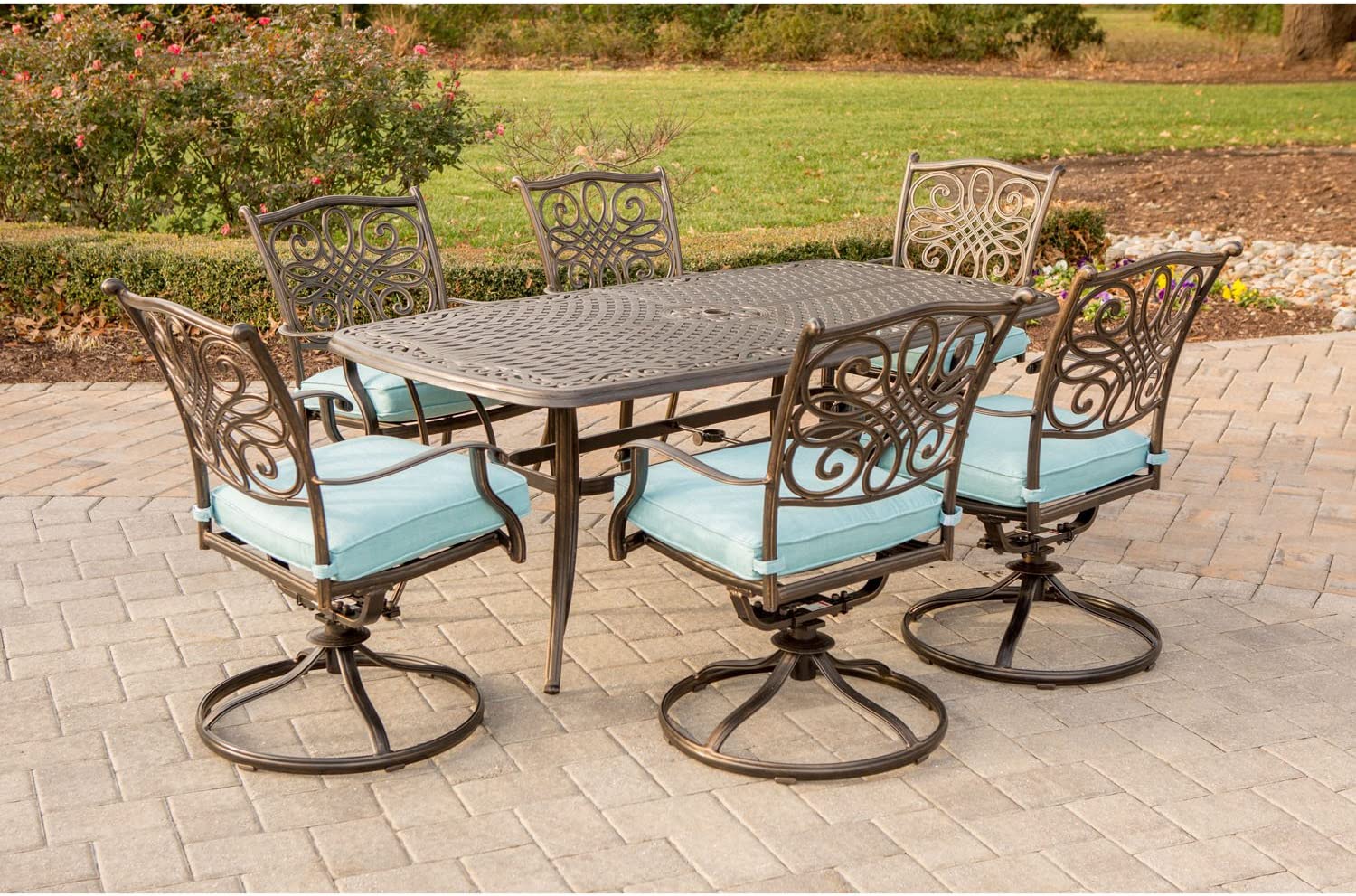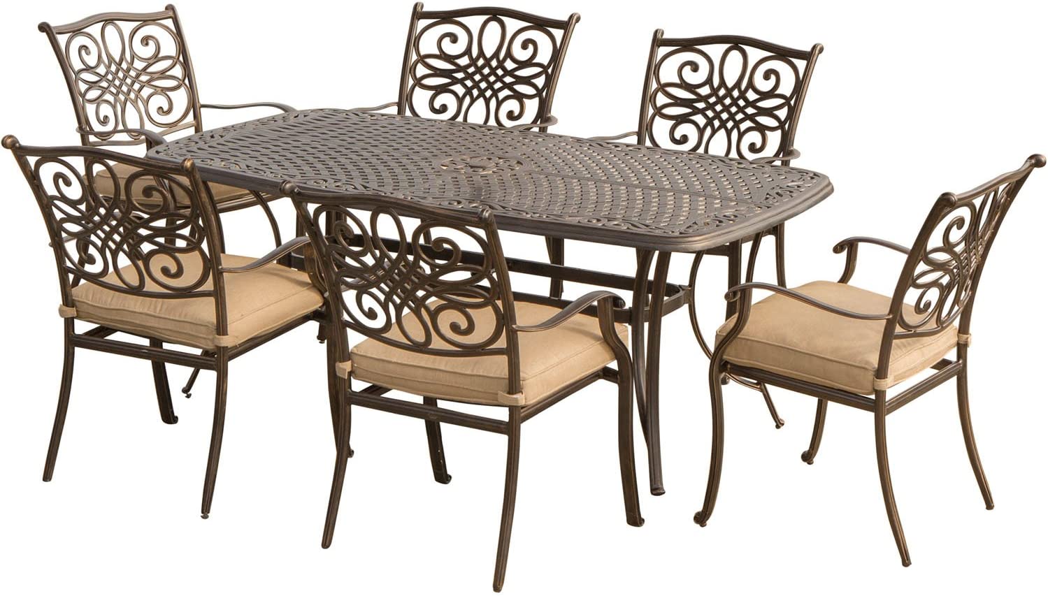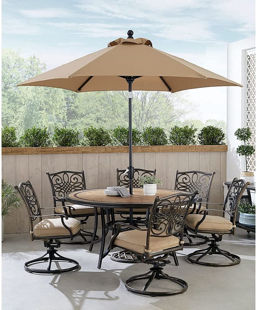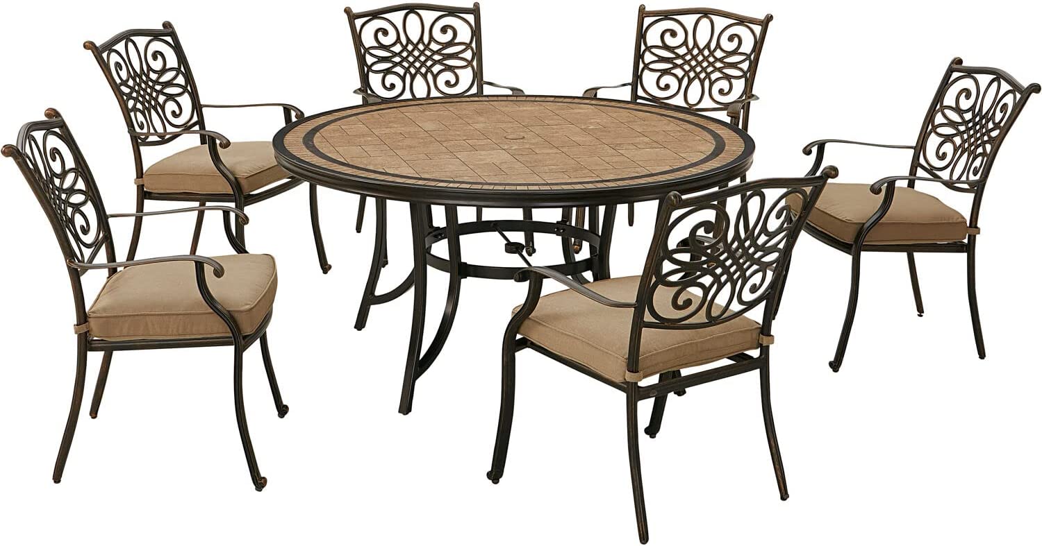 Hanover 7-Piece Tan with a 60 Cast-top Six Traditions Rust-Free Outdoor Patio Set Cushions, 6 Swivel Rockers and Aluminum Round Dining Table