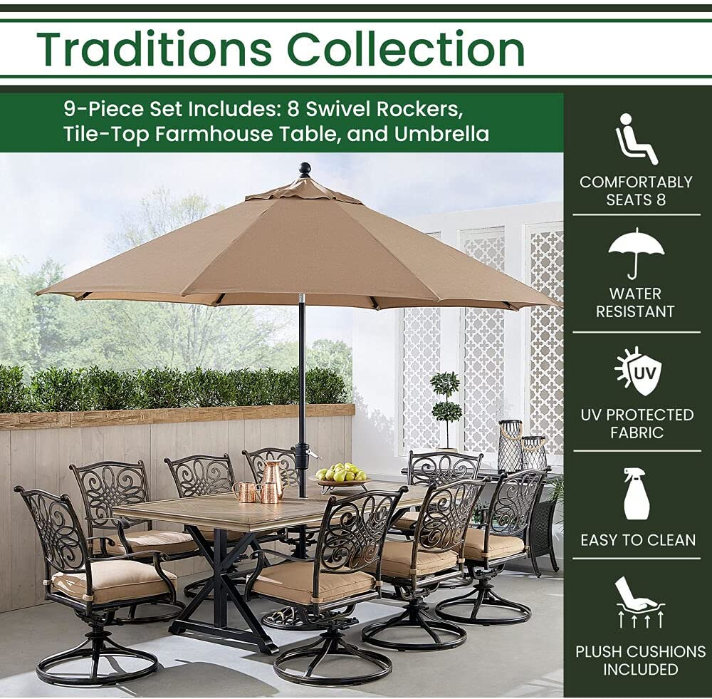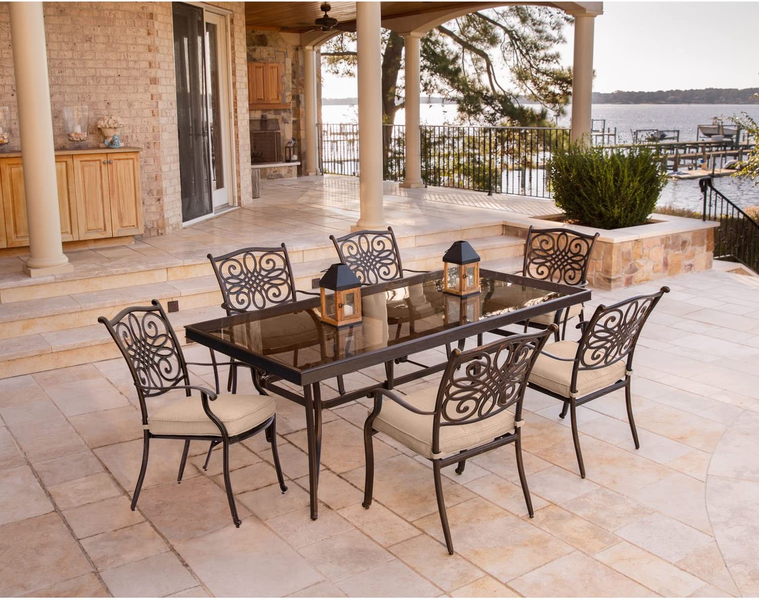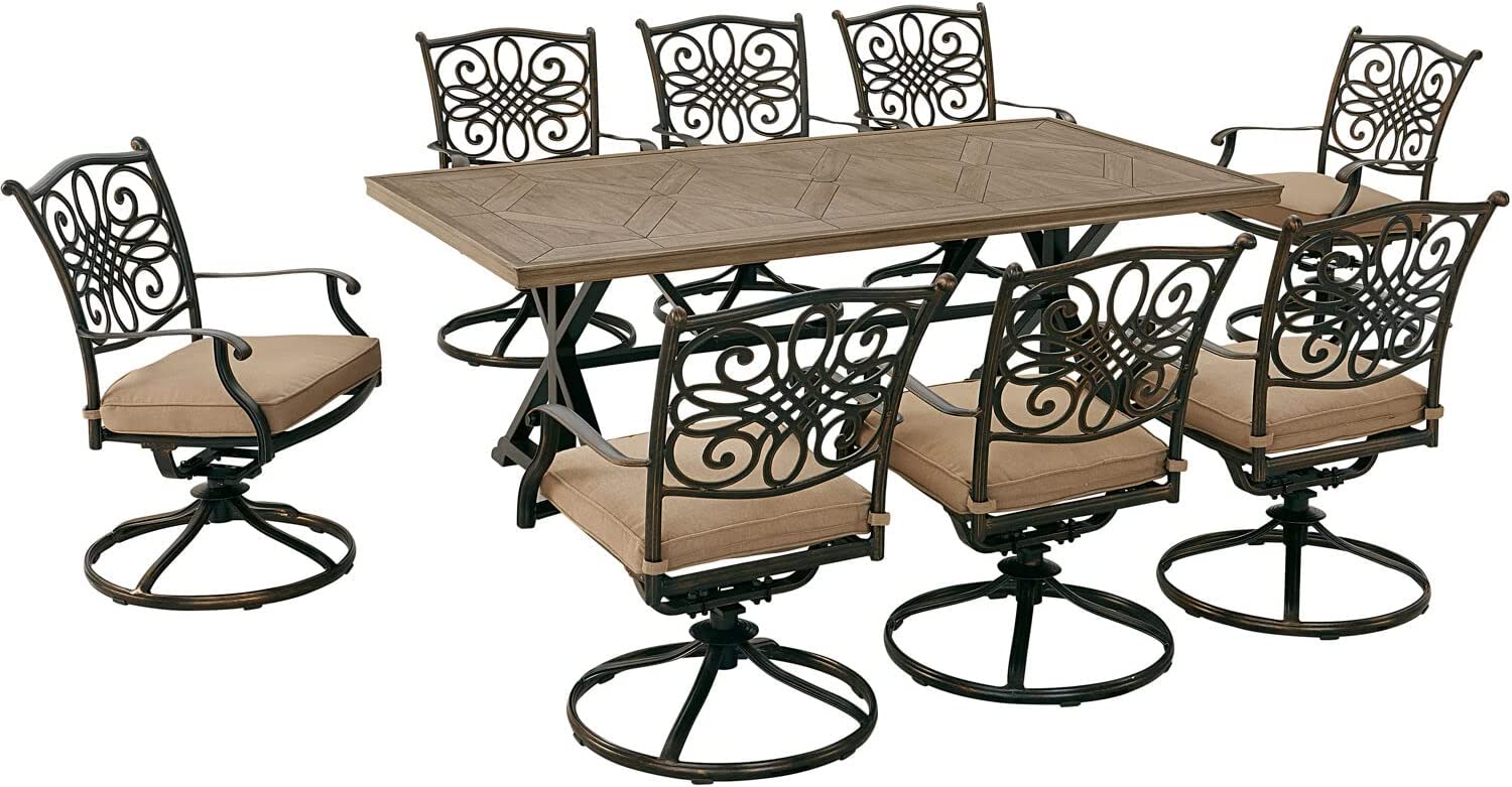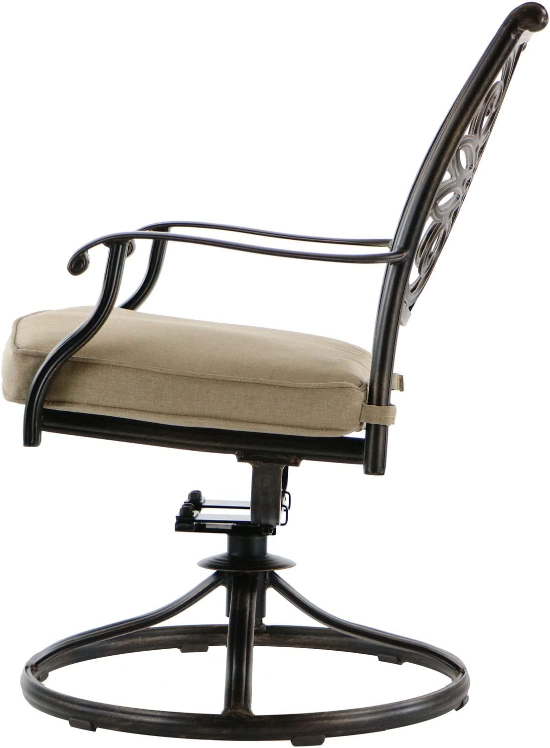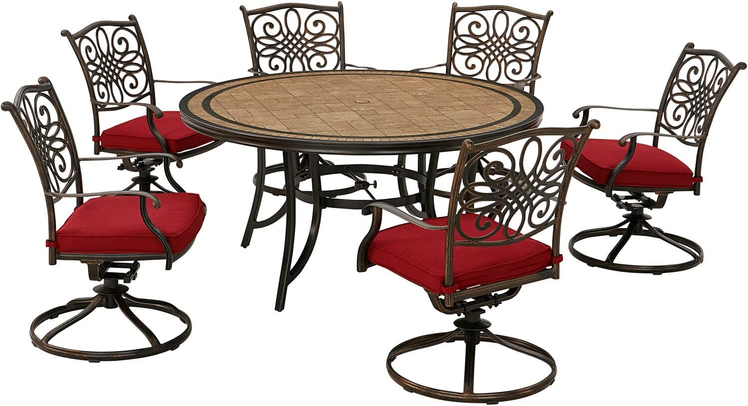 Hanover 7-Piece Tan with a 60 Cast-top Six Traditions Rust-Free Outdoor Patio Set Cushions, 6 Swivel Rockers and Aluminum Round Dining Table