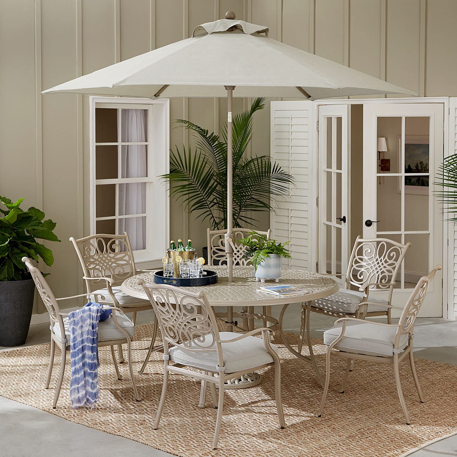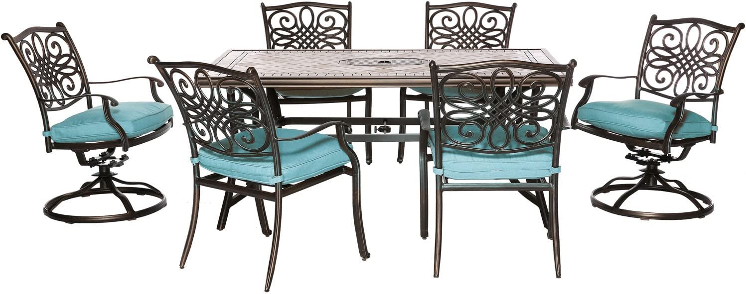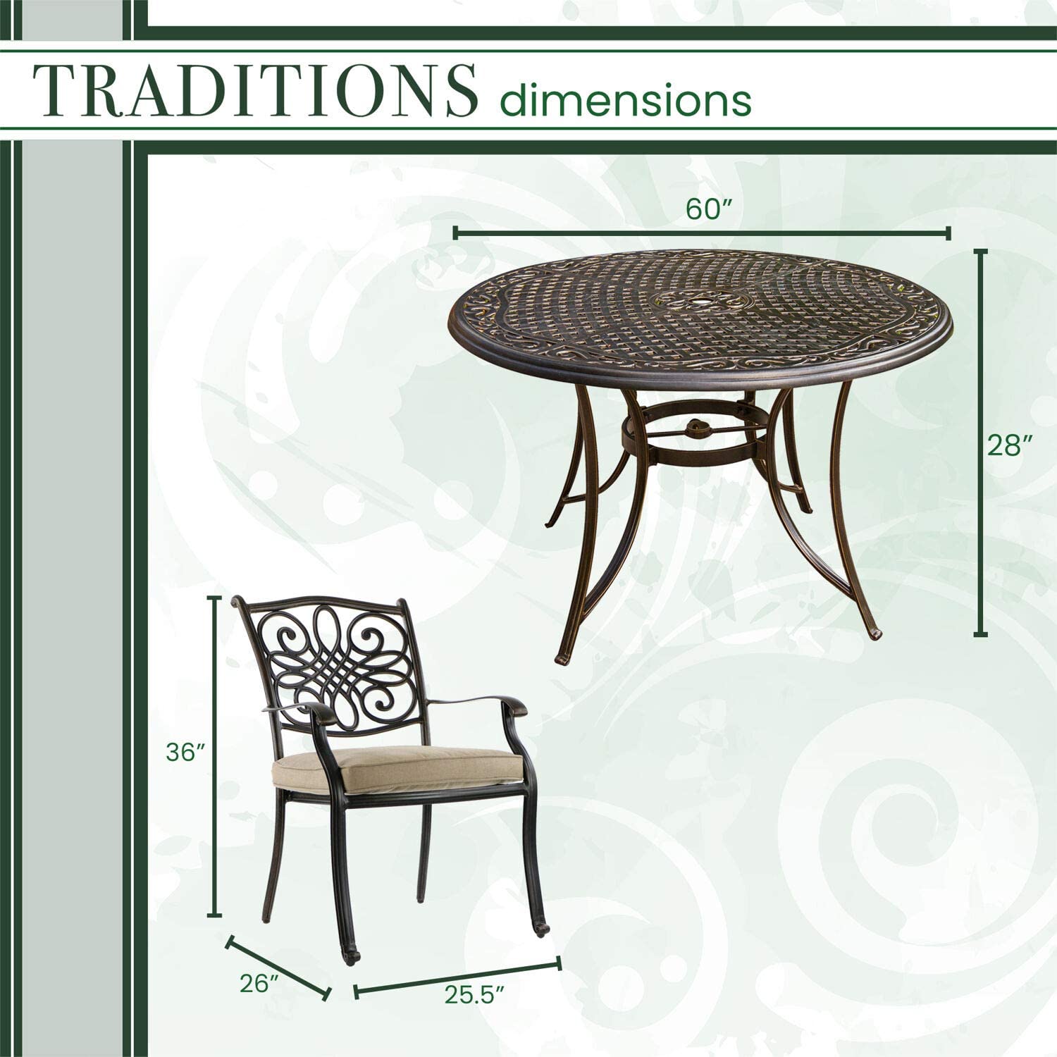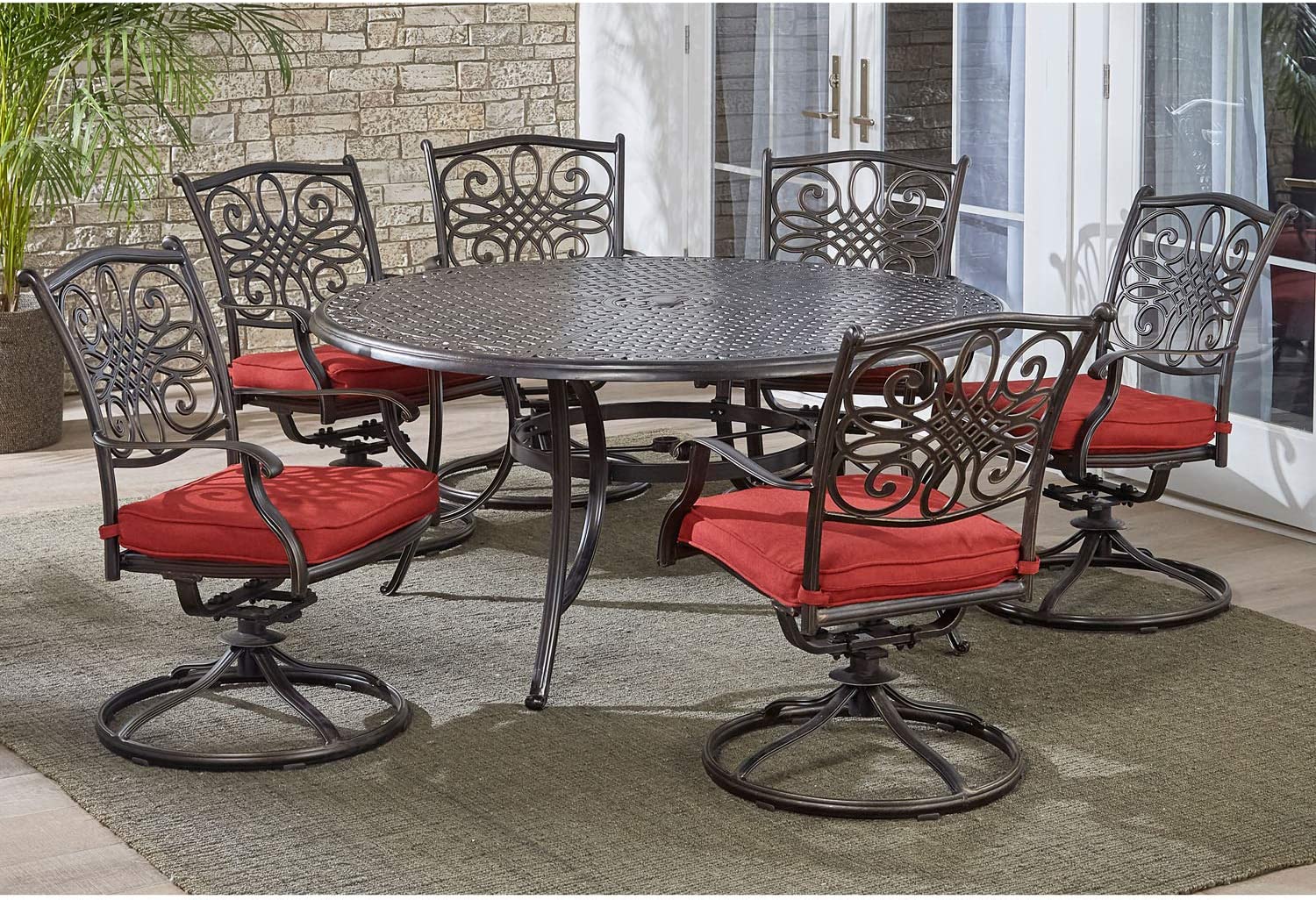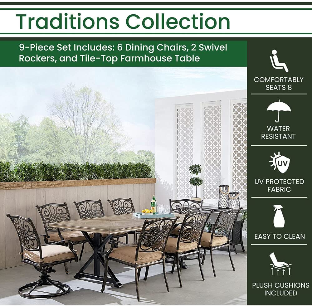 Hanover 7-Piece Tan with a 60 Cast-top Six Traditions Rust-Free Outdoor Patio Set Cushions, 6 Swivel Rockers and Aluminum Round Dining Table
