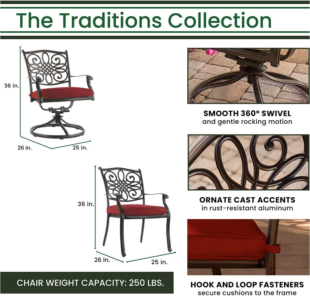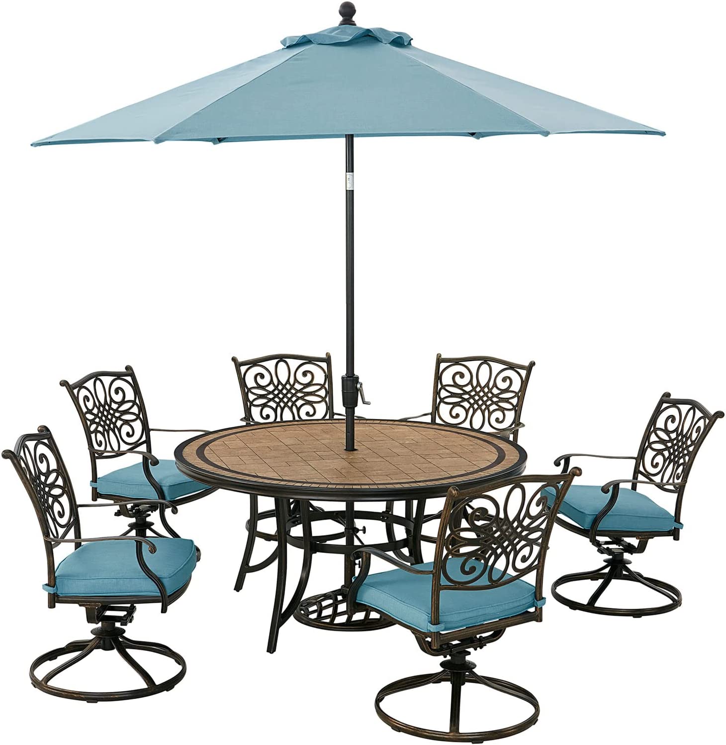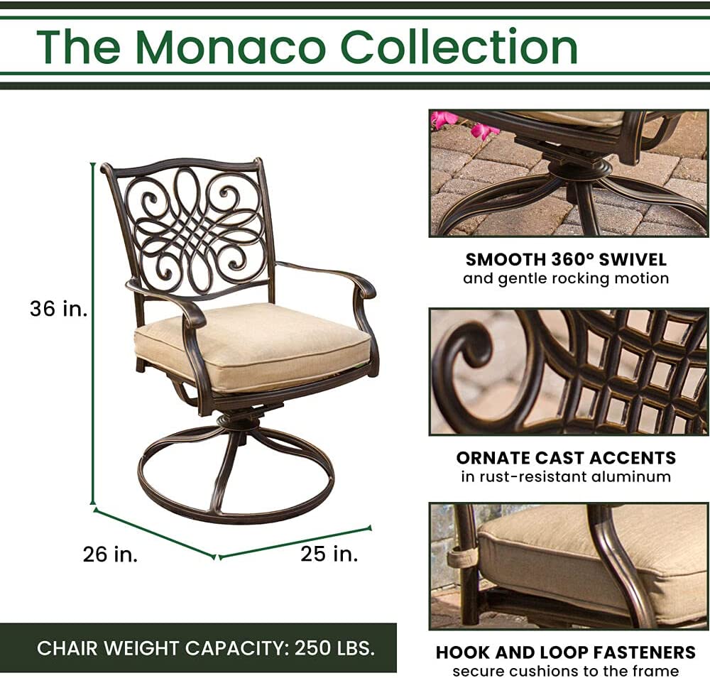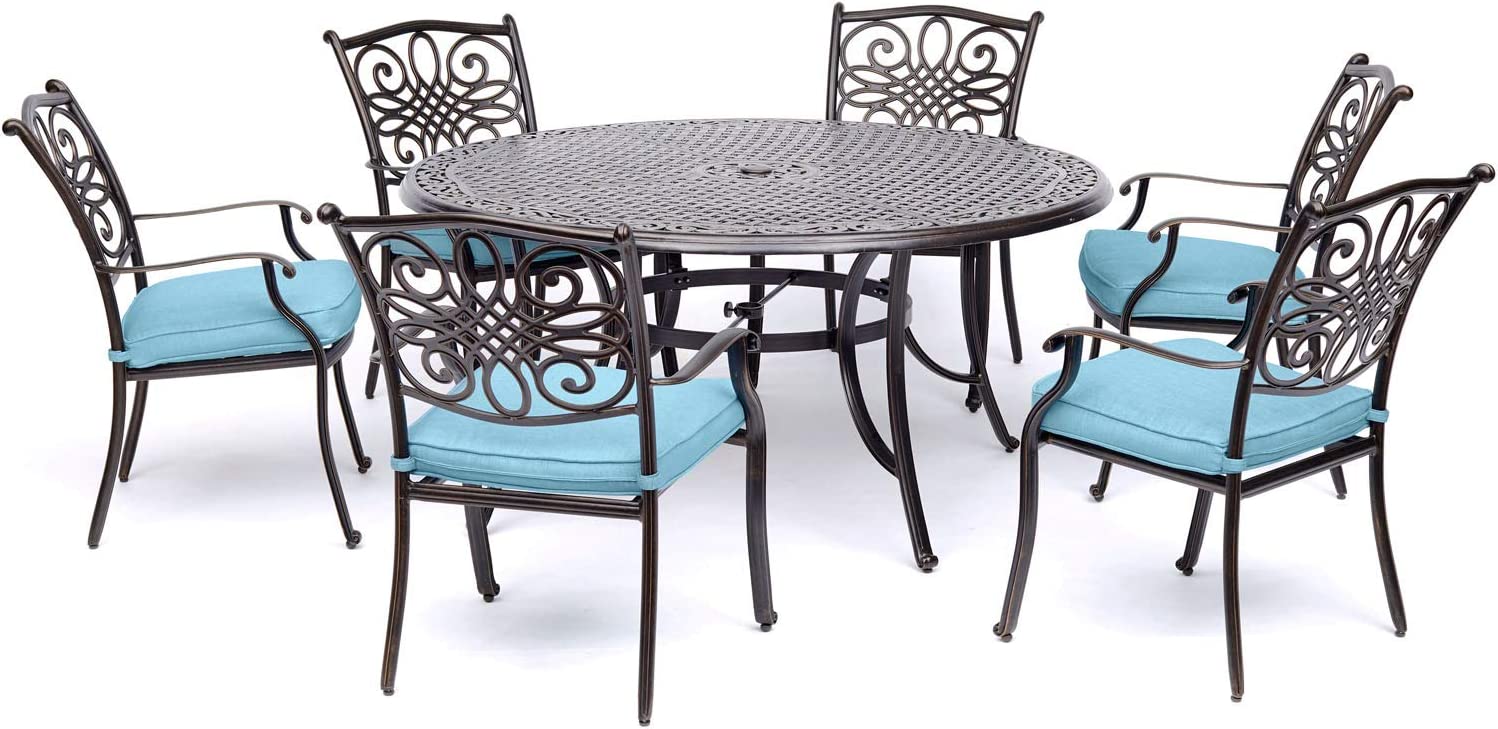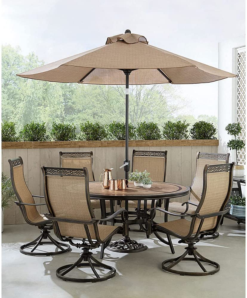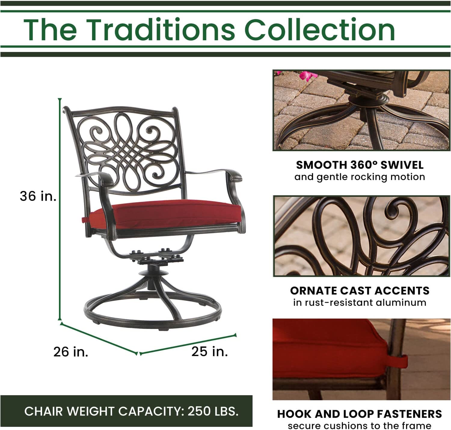 Hanover 7-Piece Tan with a 60 Cast-top Six Traditions Rust-Free Outdoor Patio Set Cushions, 6 Swivel Rockers and Aluminum Round Dining Table