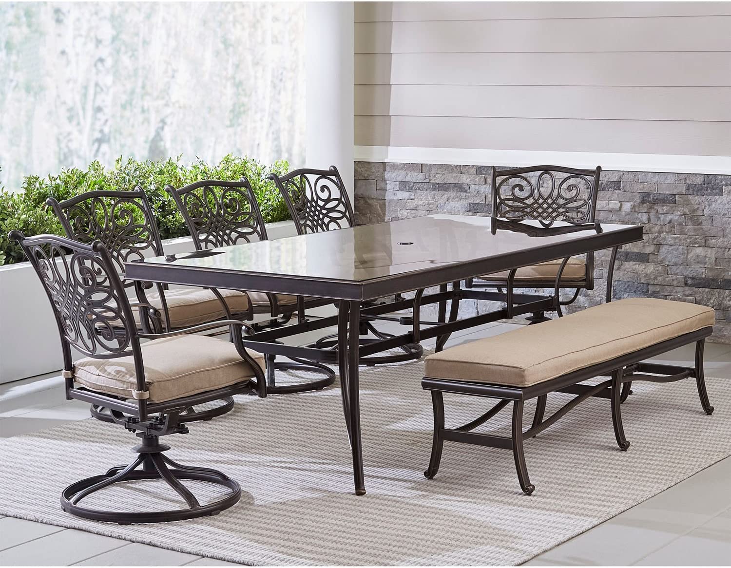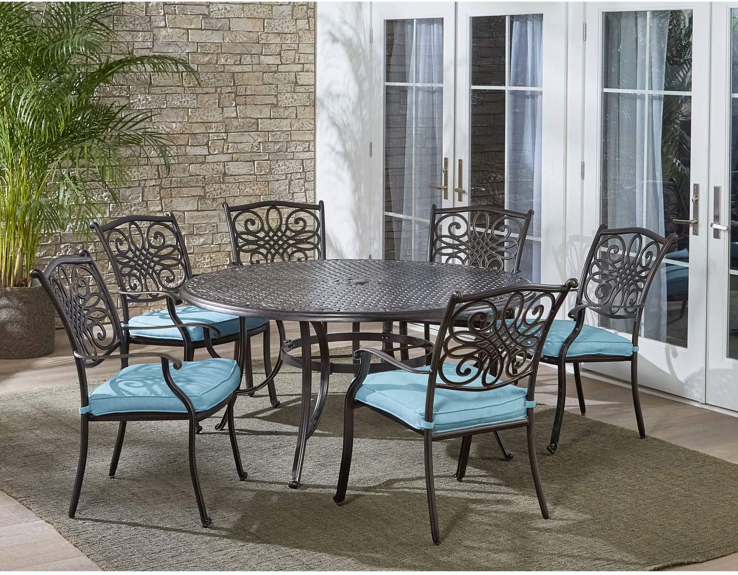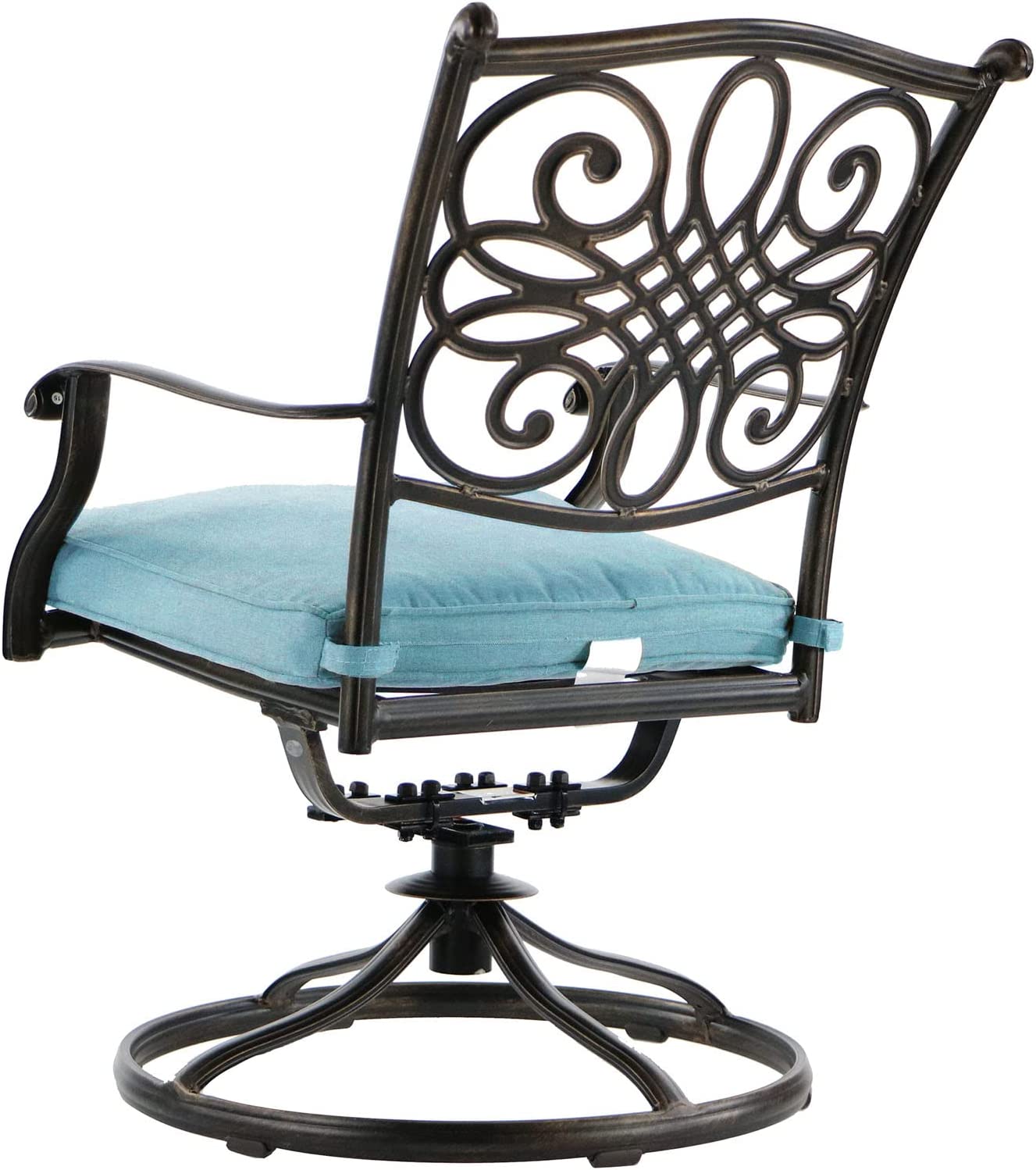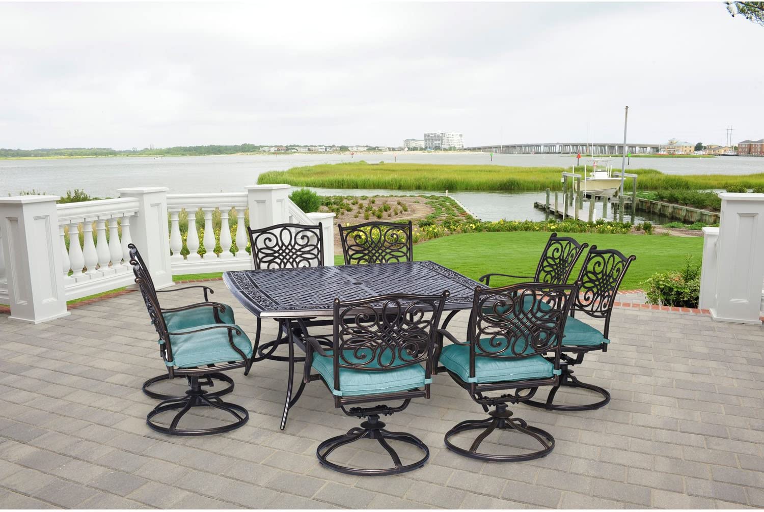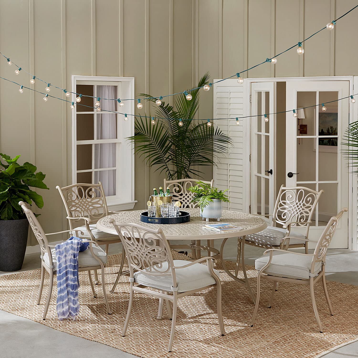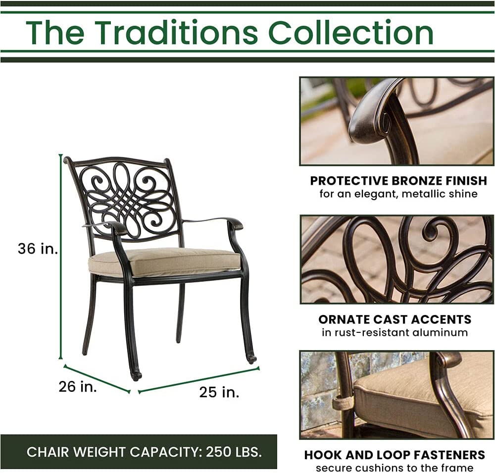 Hanover 7-Piece Tan with a 60 Cast-top Six Traditions Rust-Free Outdoor Patio Set Cushions, 6 Swivel Rockers and Aluminum Round Dining Table