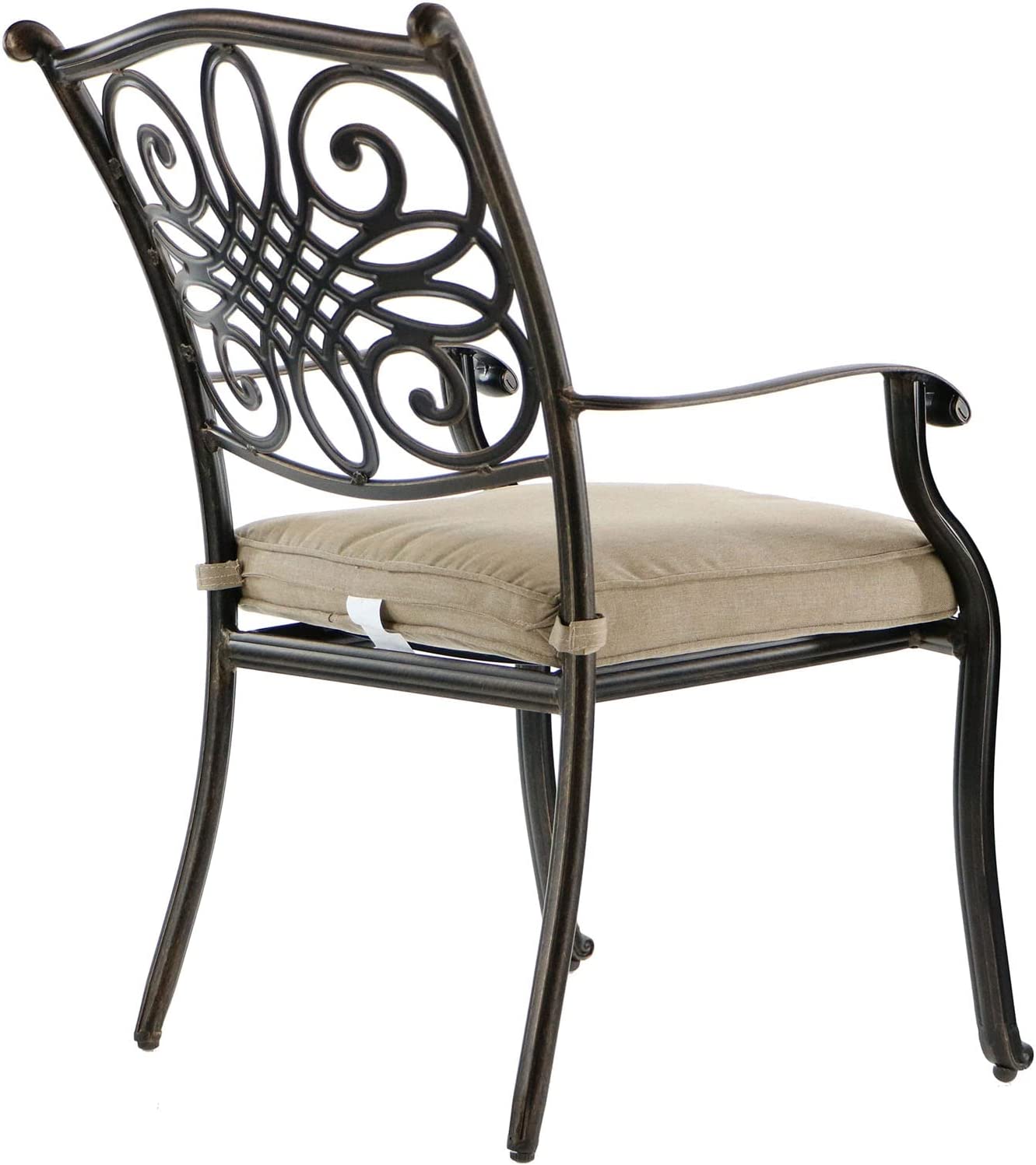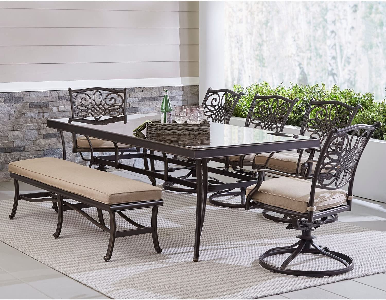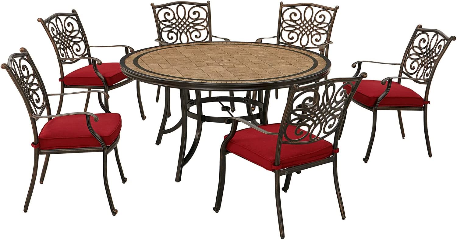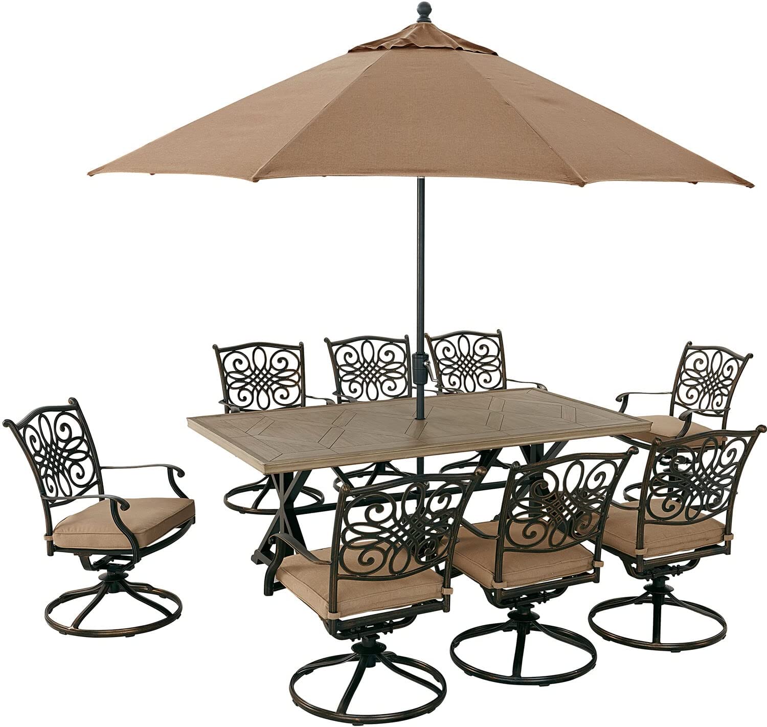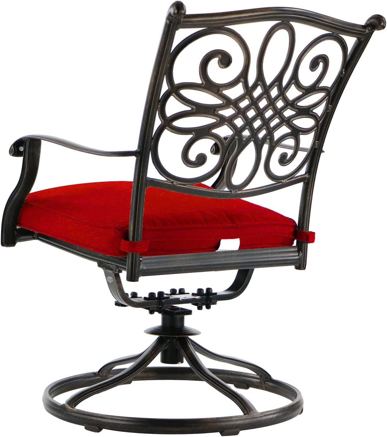 Hanover 7-Piece Tan with a 60 Cast-top Six Traditions Rust-Free Outdoor Patio Set Cushions, 6 Swivel Rockers and Aluminum Round Dining Table