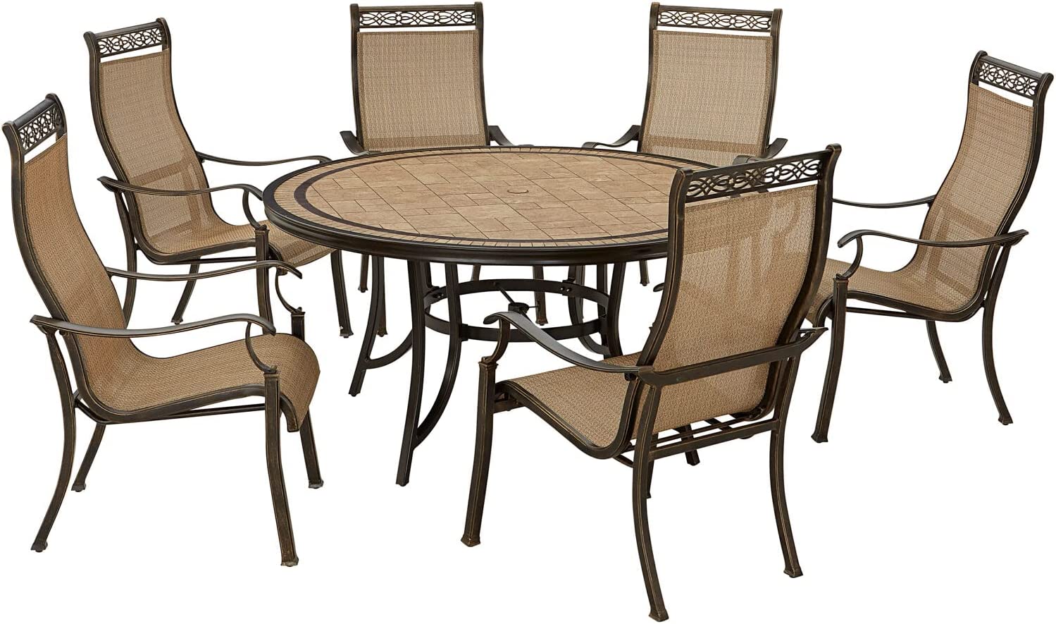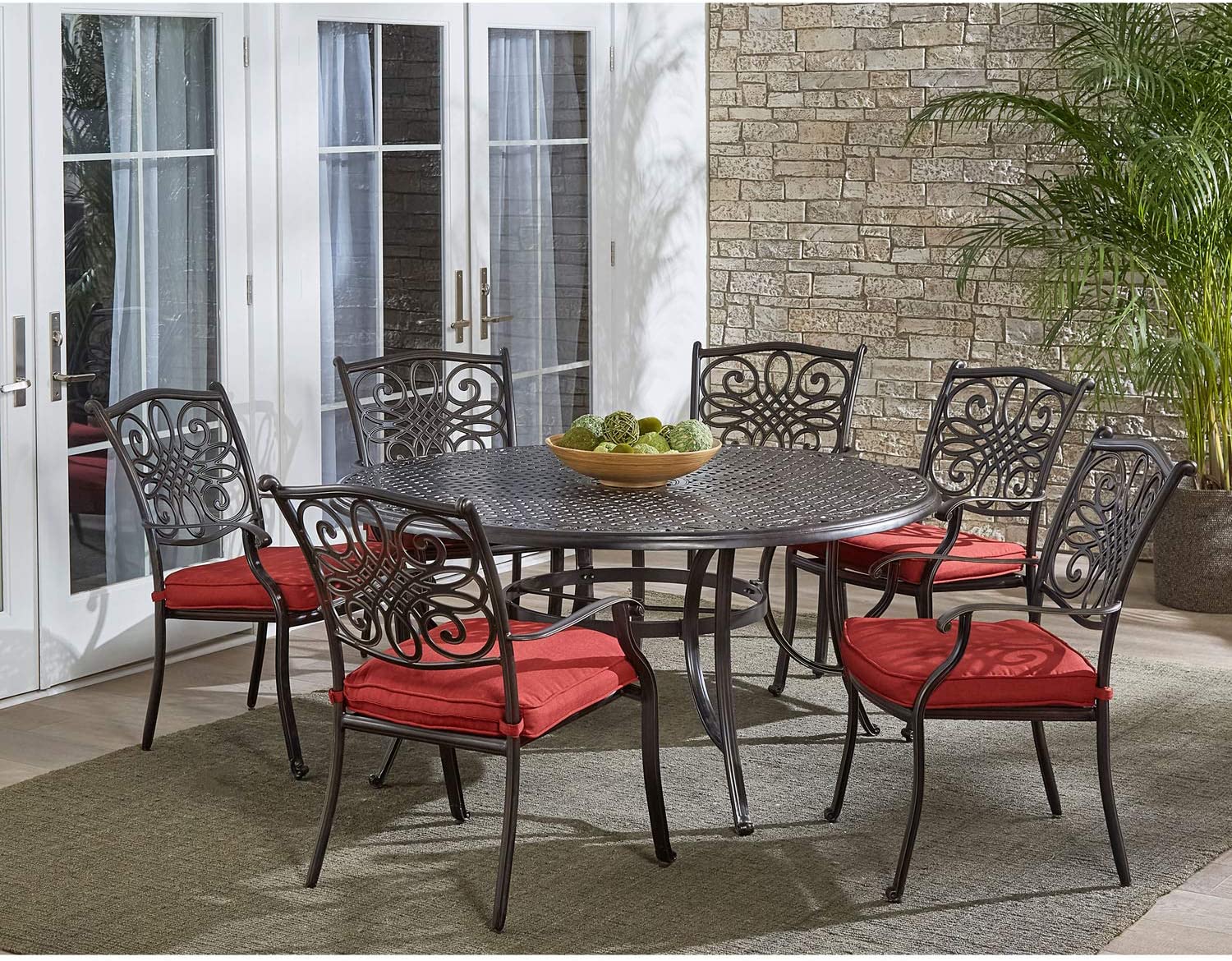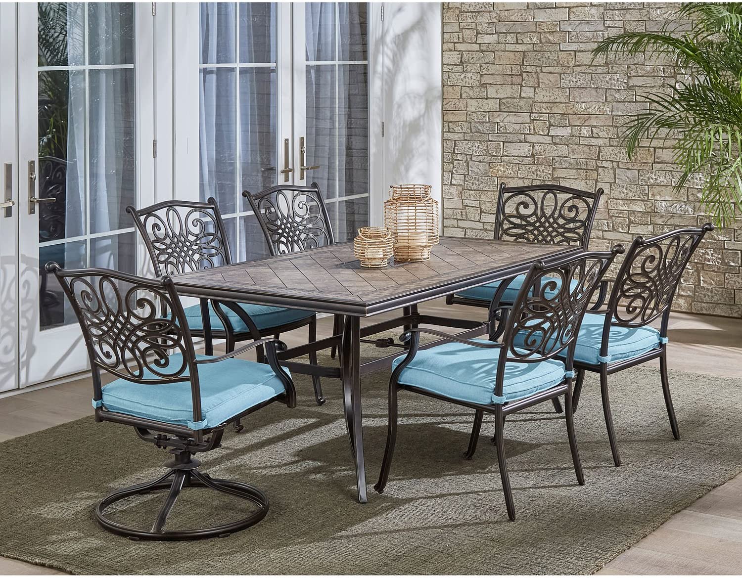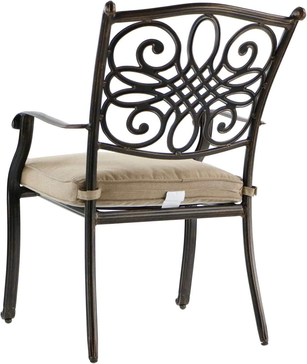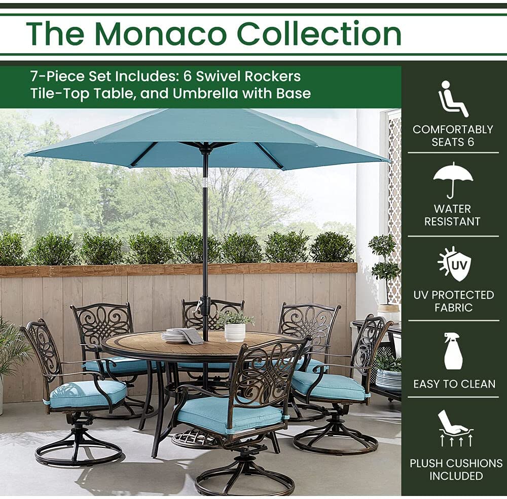 Hanover 7-Piece Tan with a 60 Cast-top Six Traditions Rust-Free Outdoor Patio Set Cushions, 6 Swivel Rockers and Aluminum Round Dining Table
