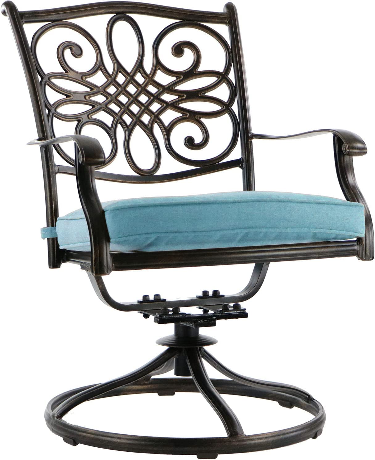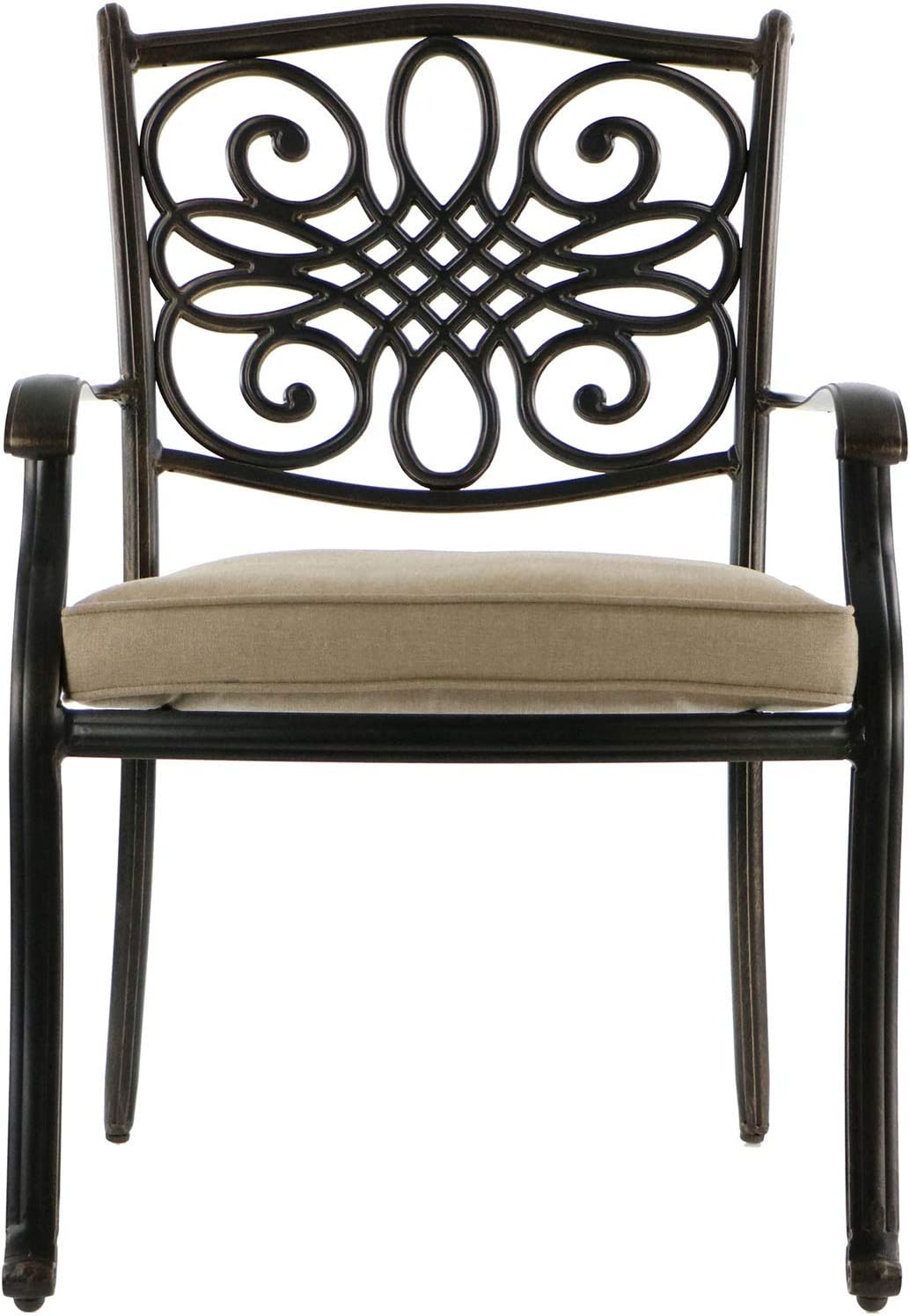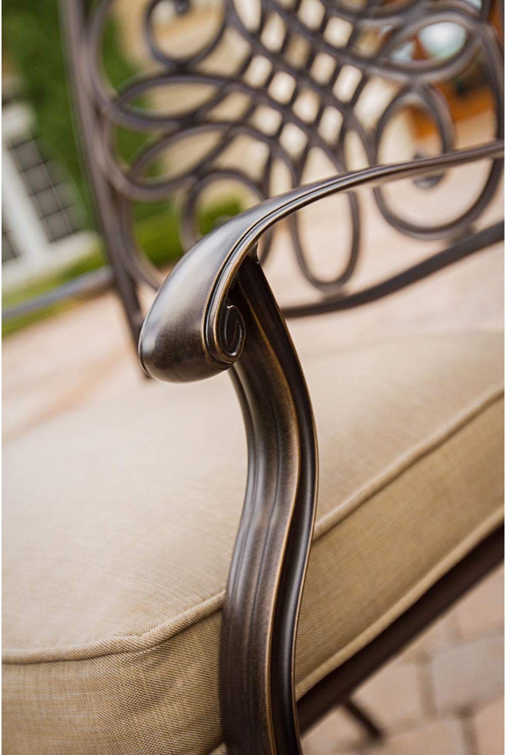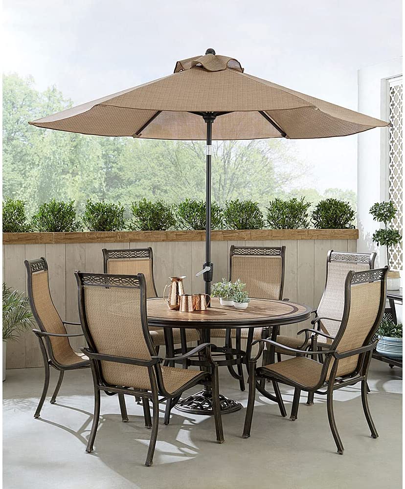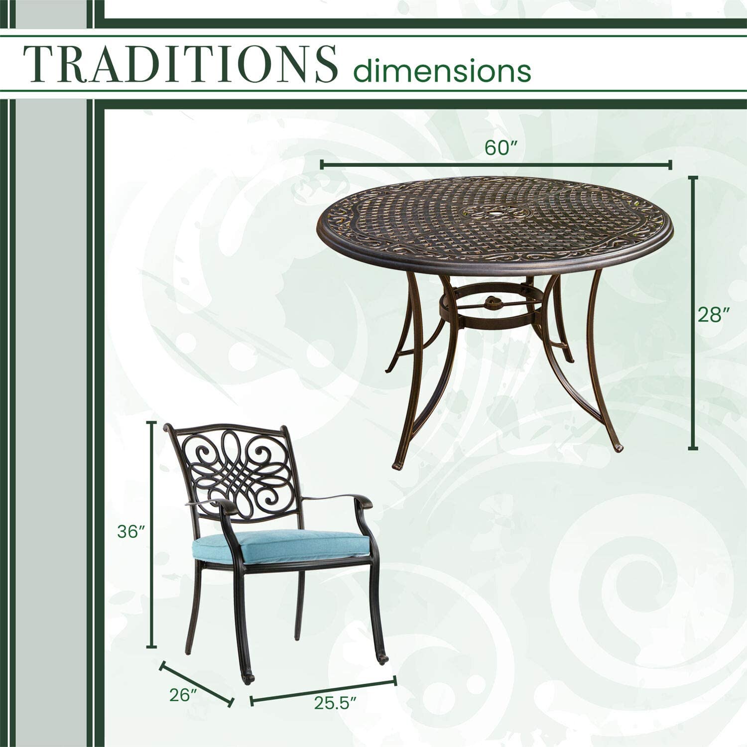 Hanover 7-Piece Tan with a 60 Cast-top Six Traditions Rust-Free Outdoor Patio Set Cushions, 6 Swivel Rockers and Aluminum Round Dining Table