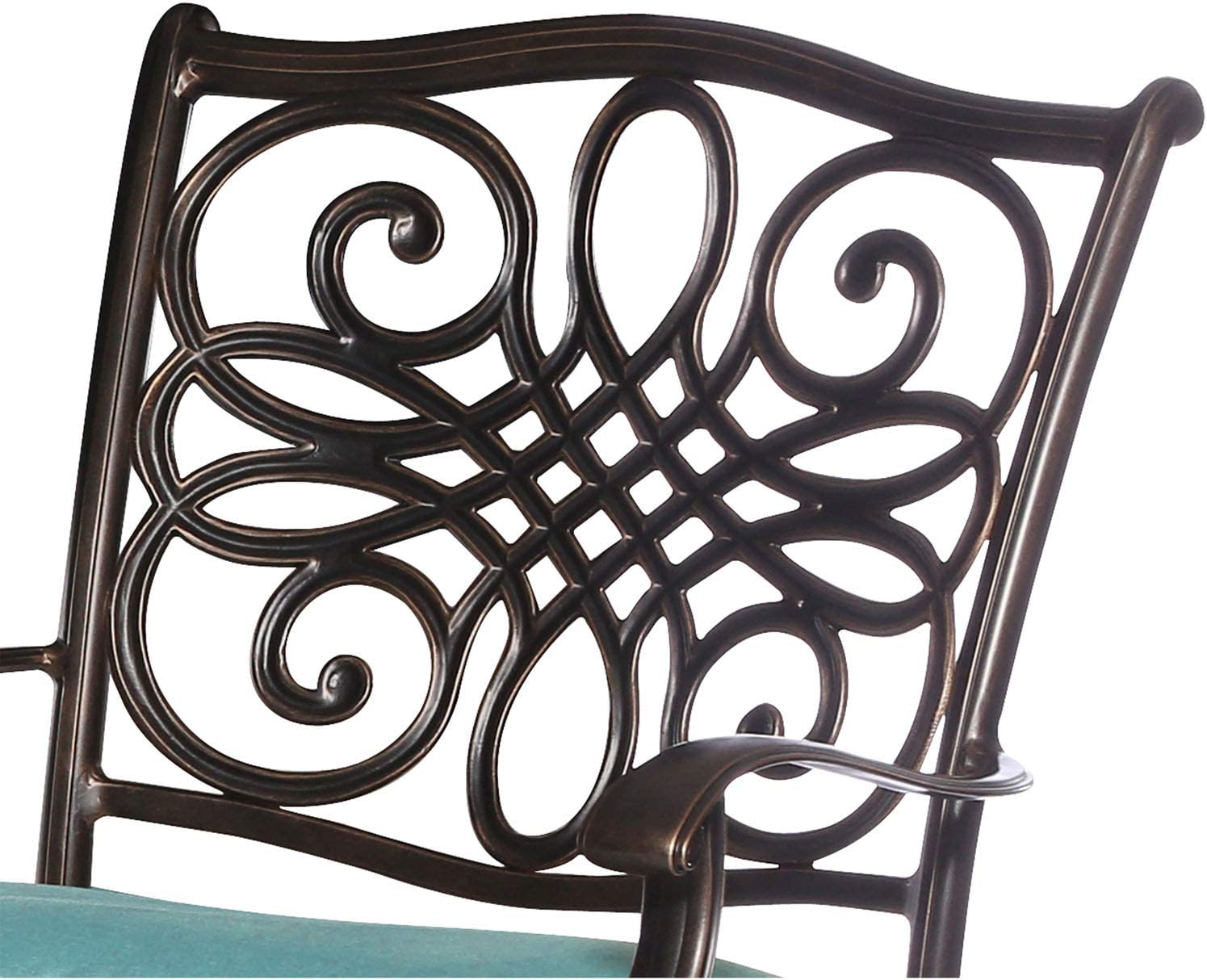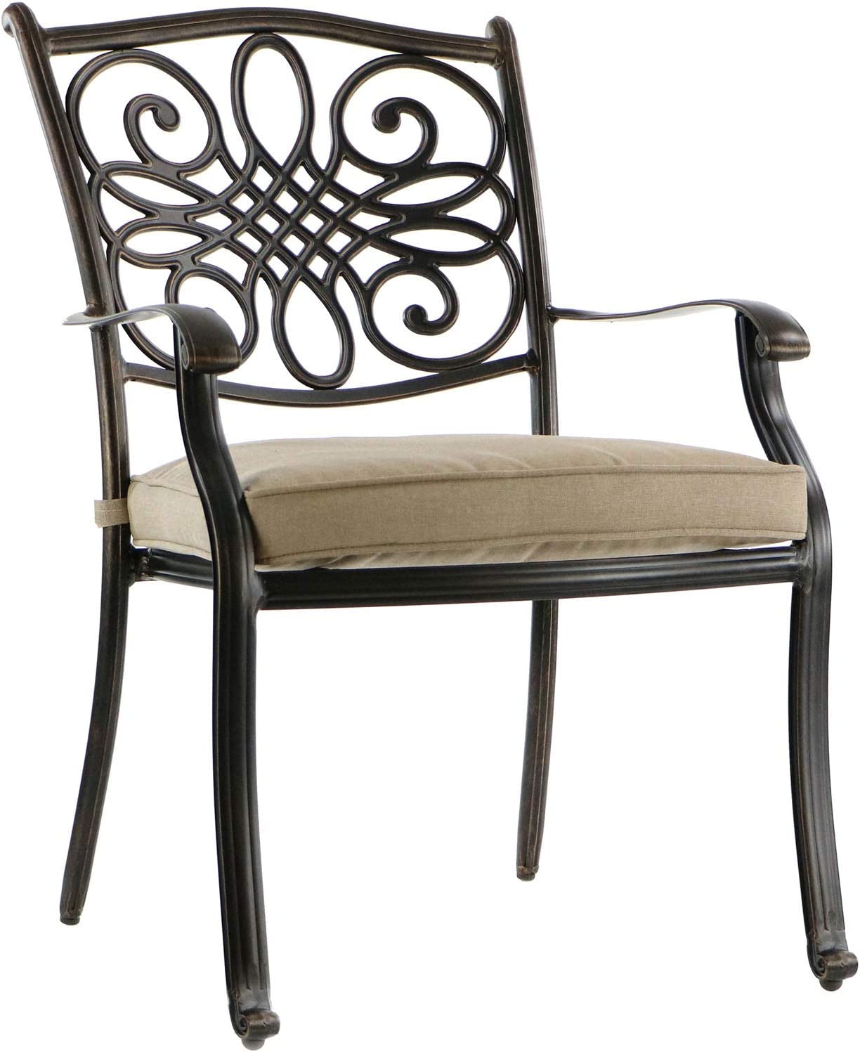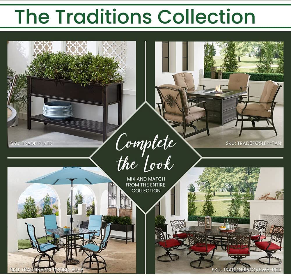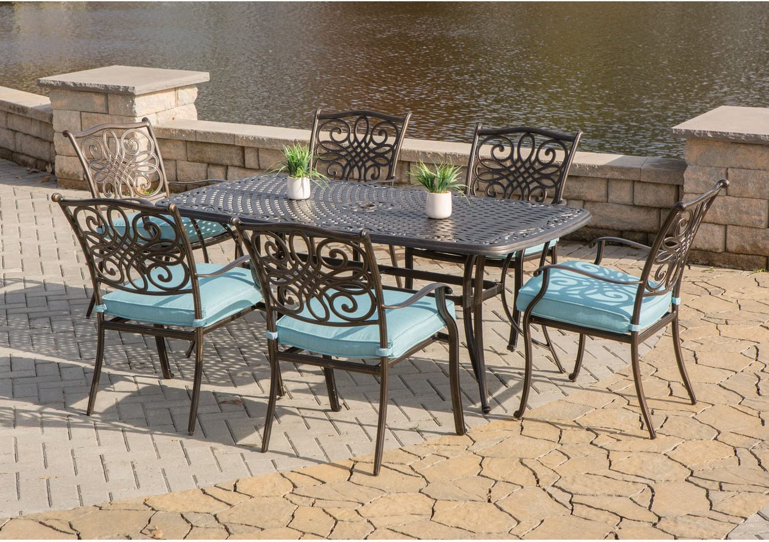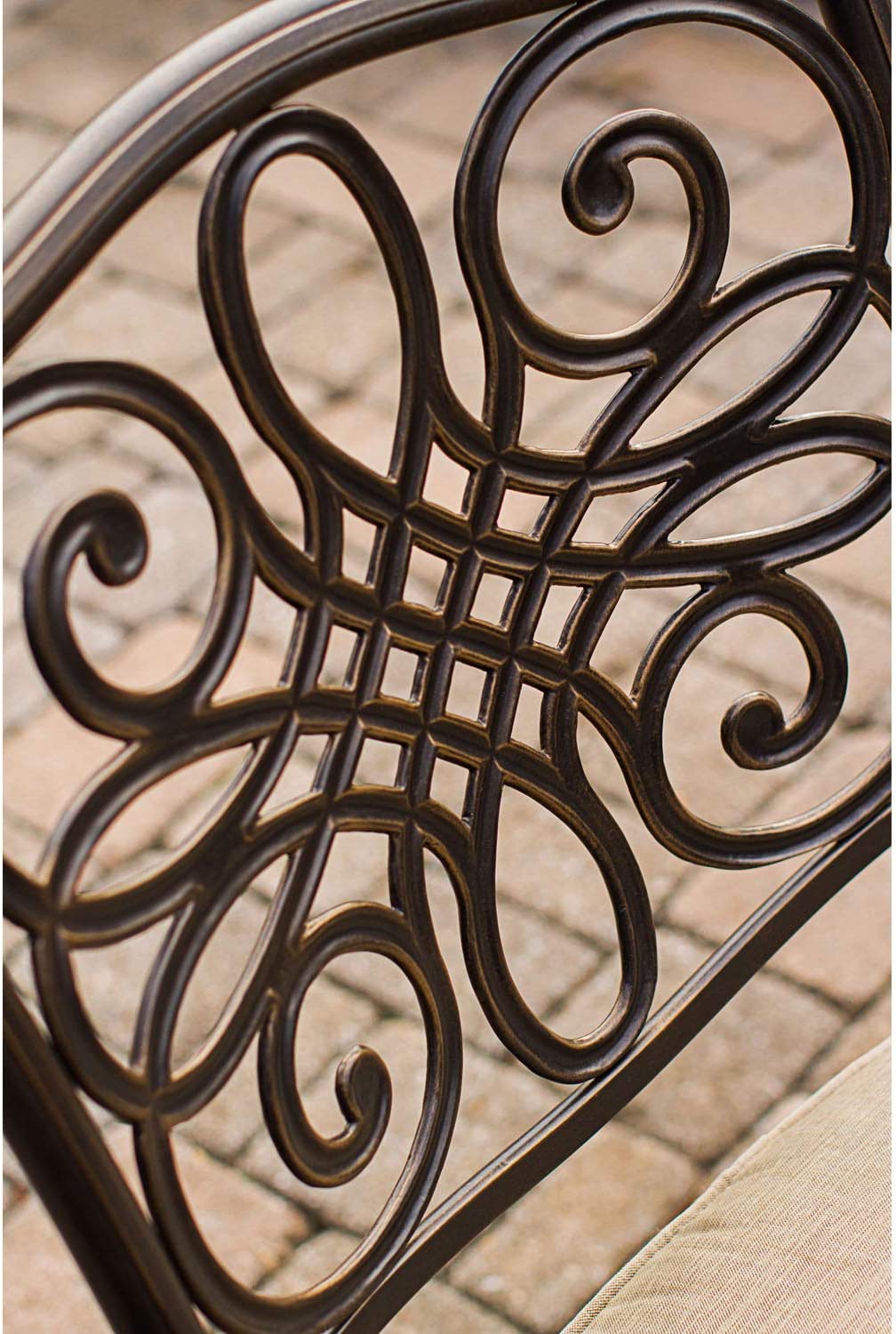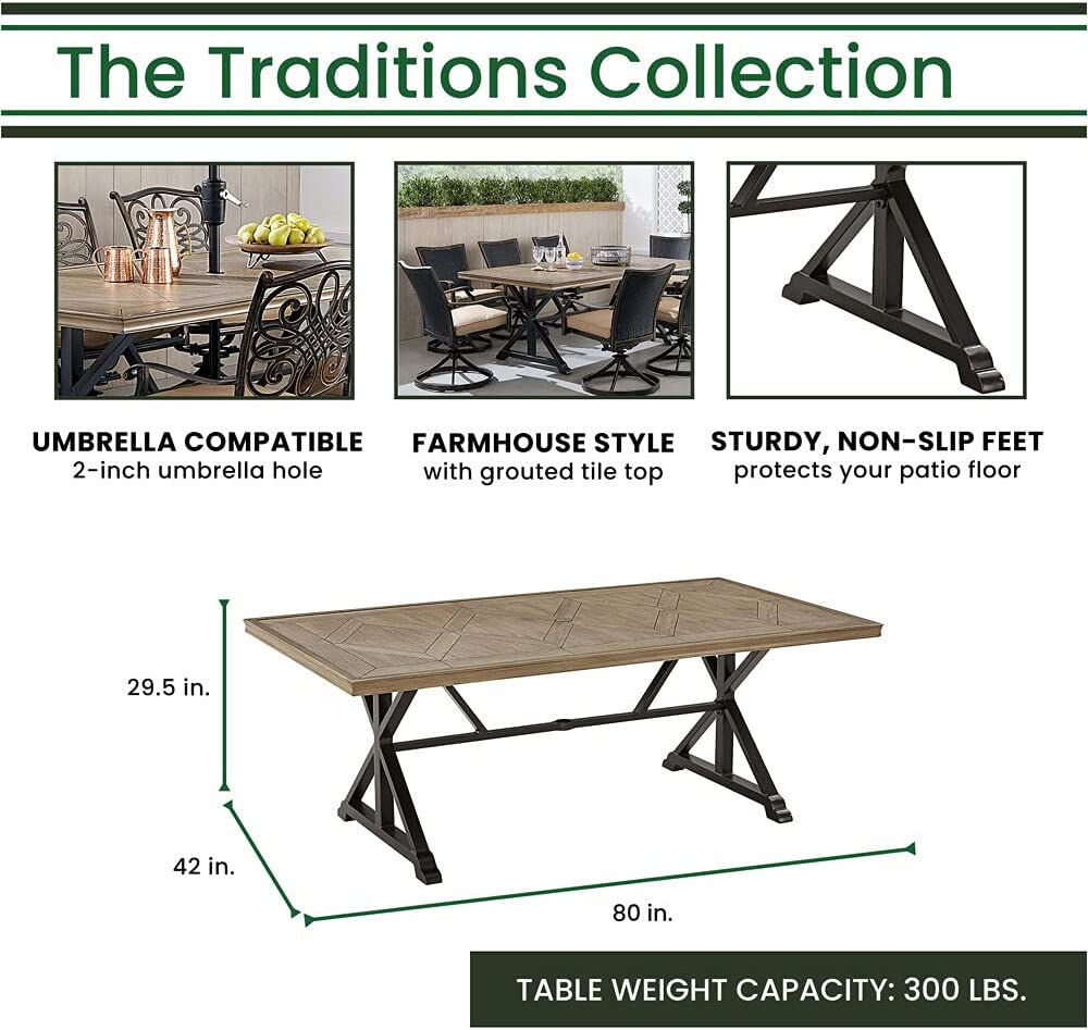 Hanover 7-Piece Tan with a 60 Cast-top Six Traditions Rust-Free Outdoor Patio Set Cushions, 6 Swivel Rockers and Aluminum Round Dining Table