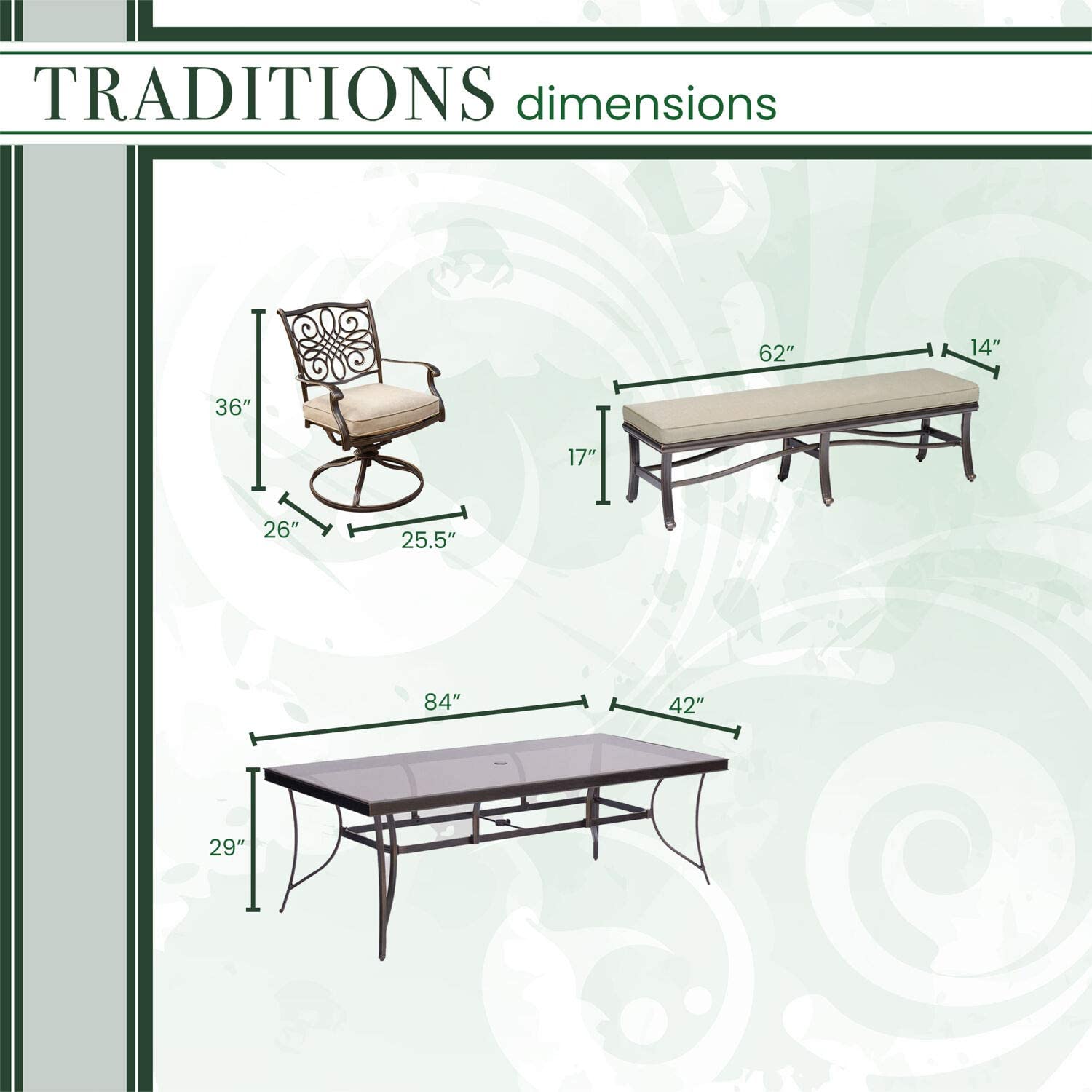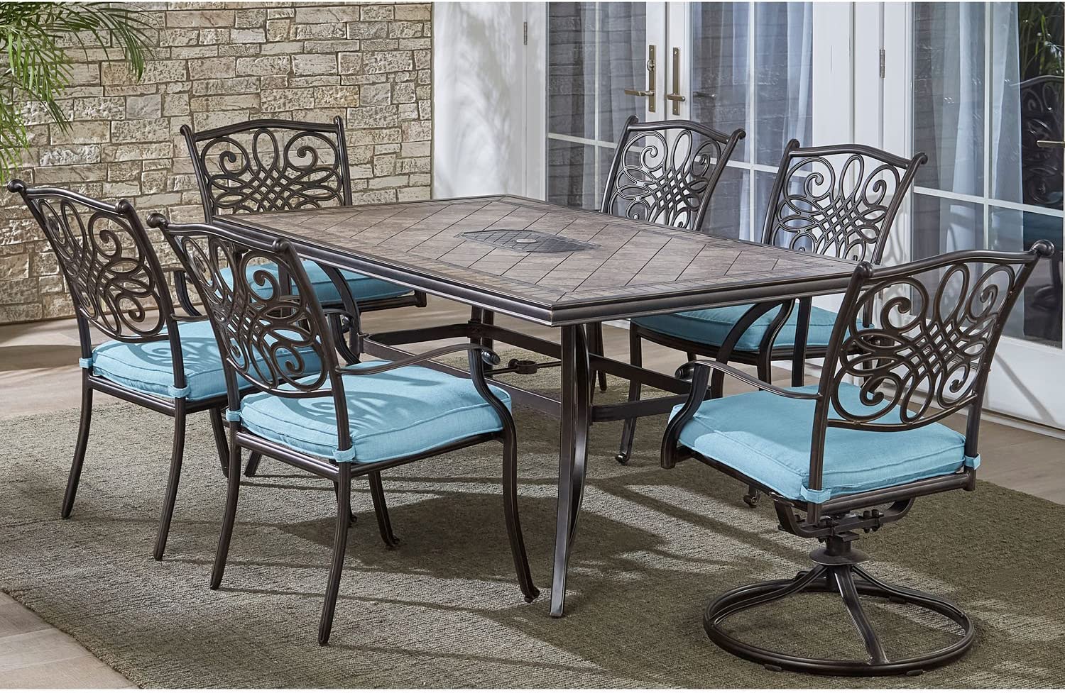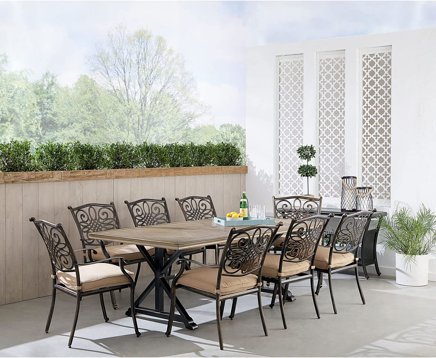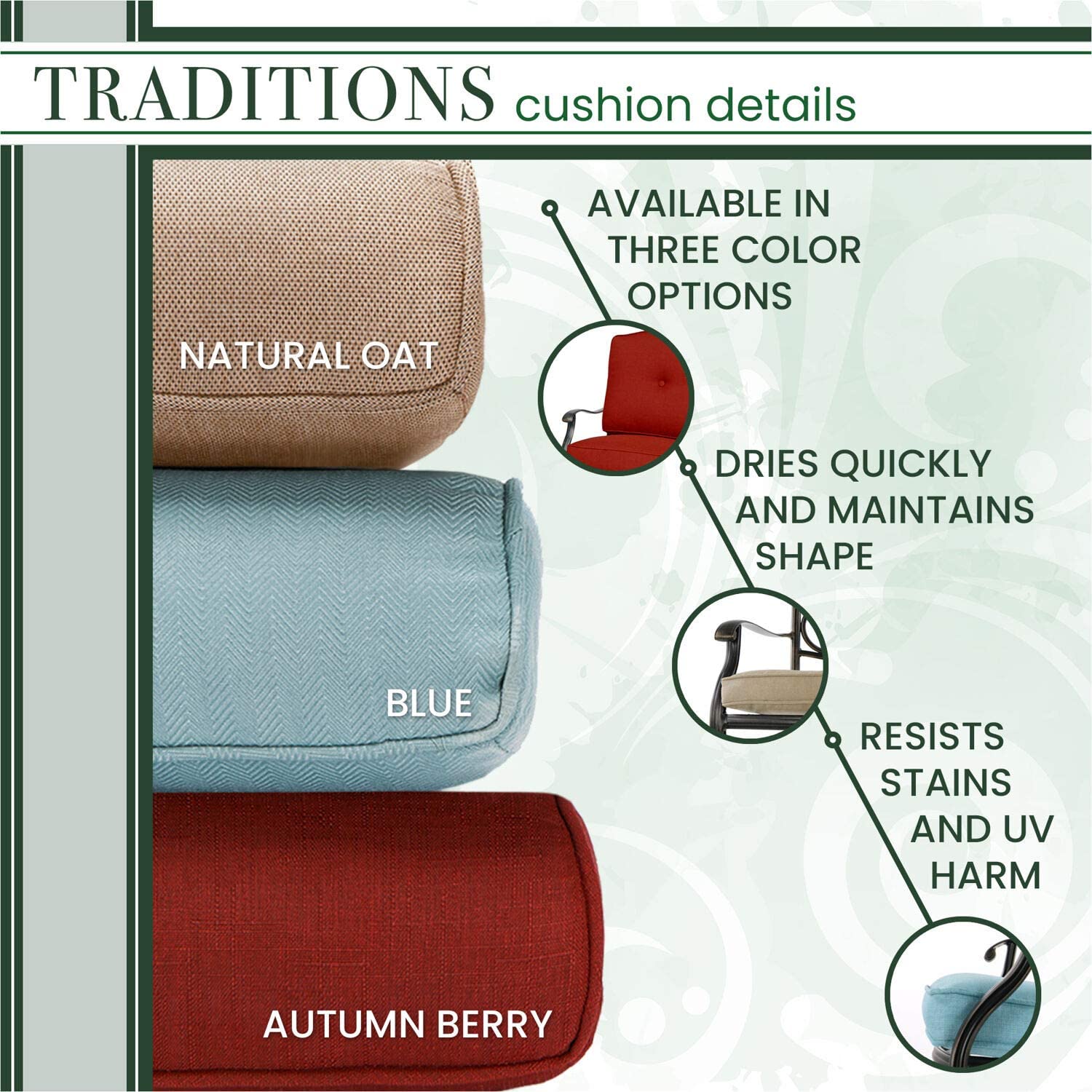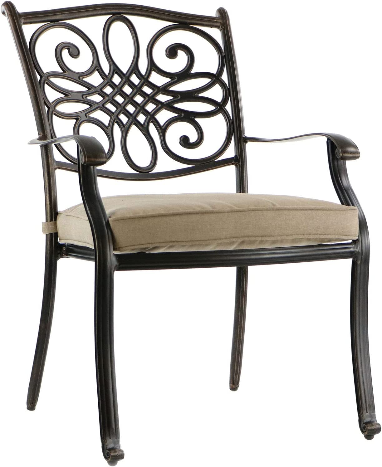 Hanover 7-Piece Tan with a 60 Cast-top Six Traditions Rust-Free Outdoor Patio Set Cushions, 6 Swivel Rockers and Aluminum Round Dining Table