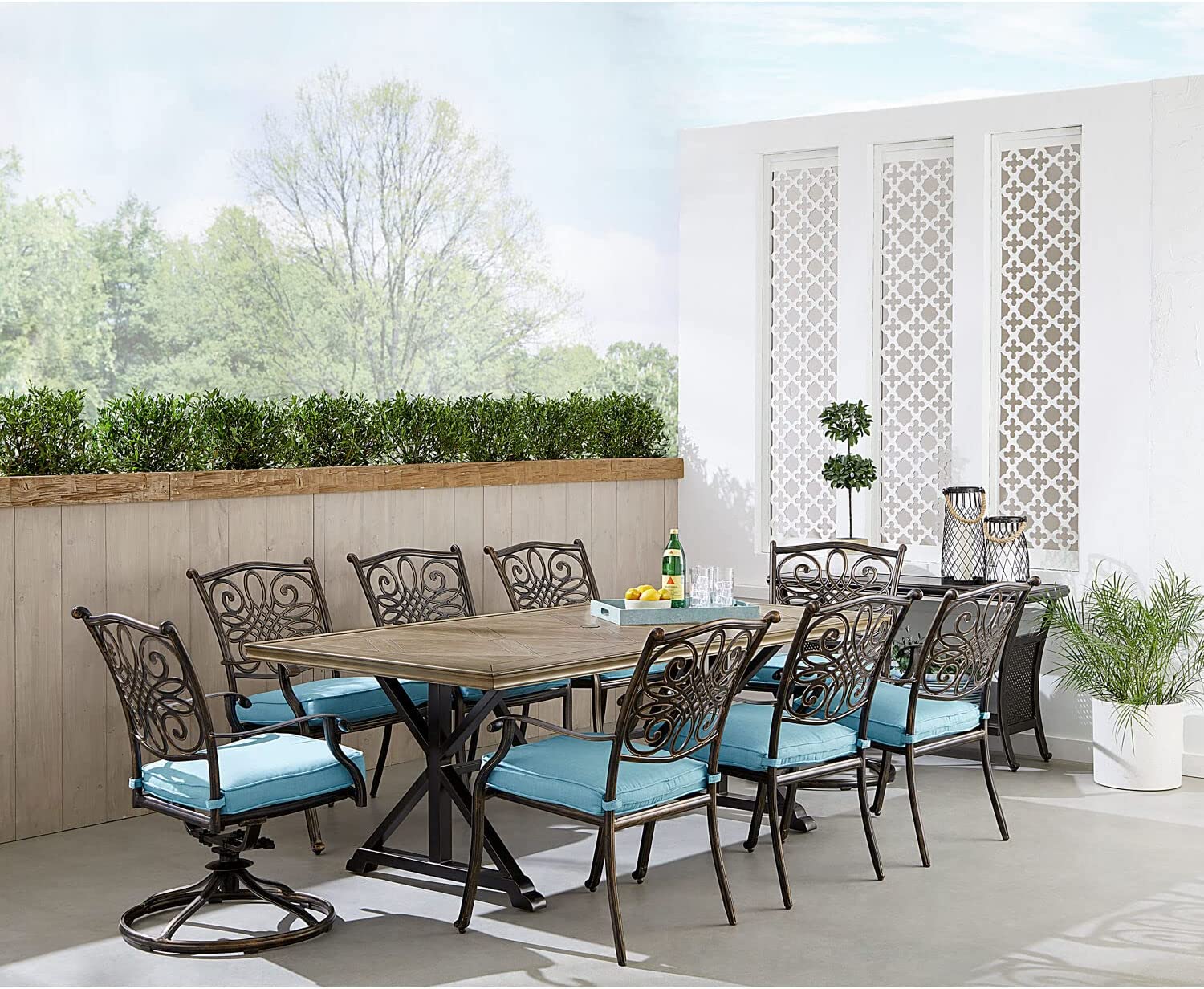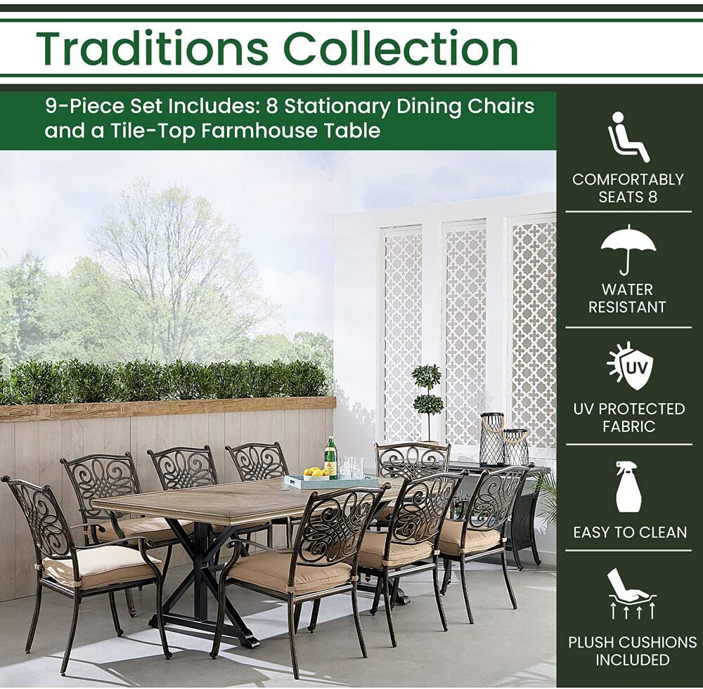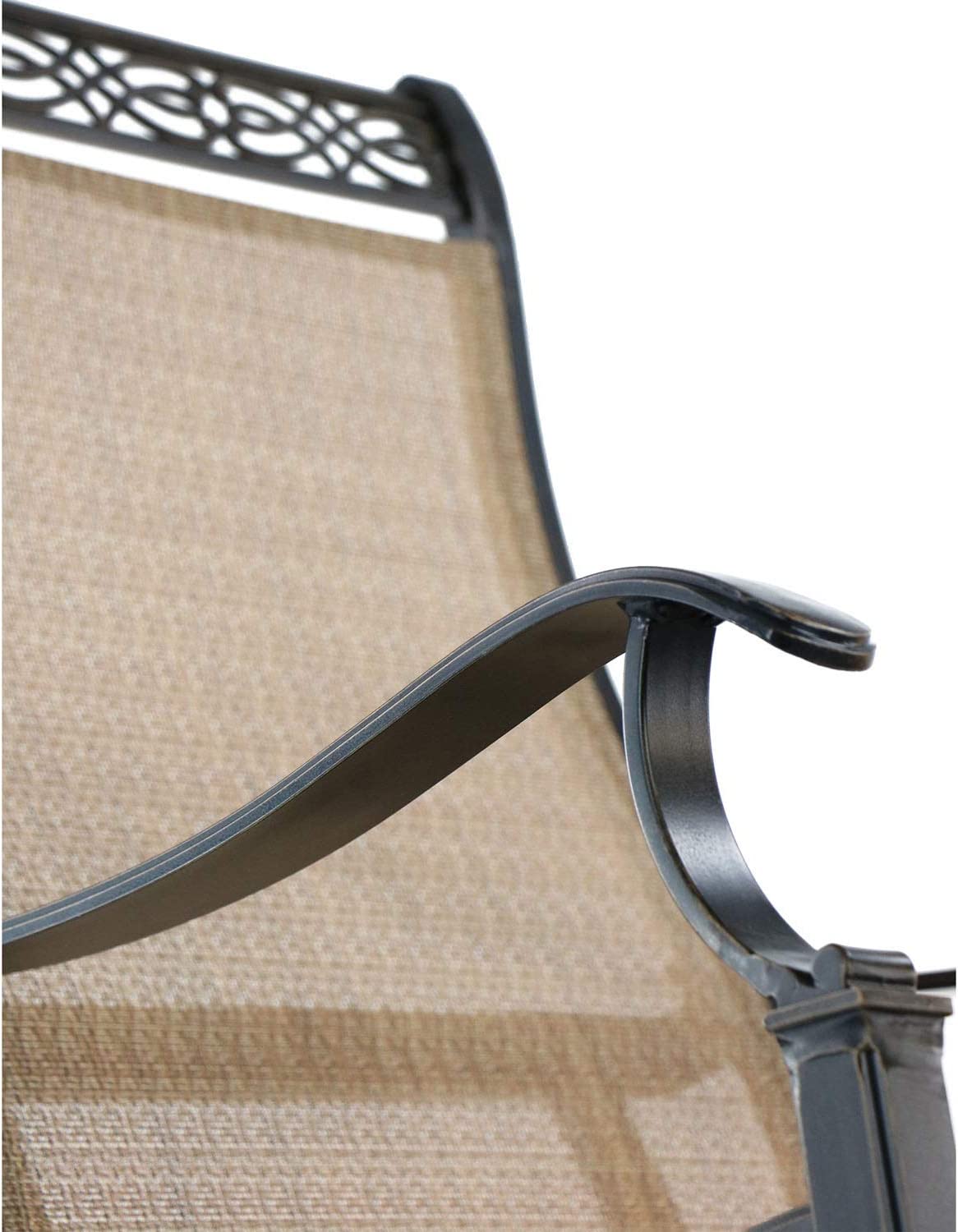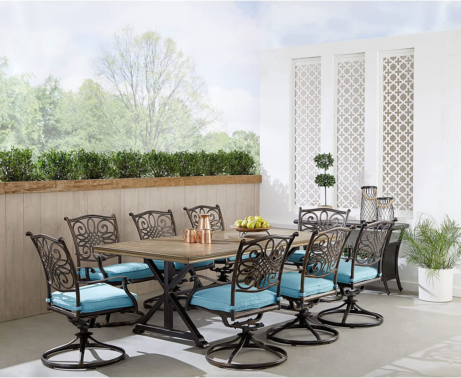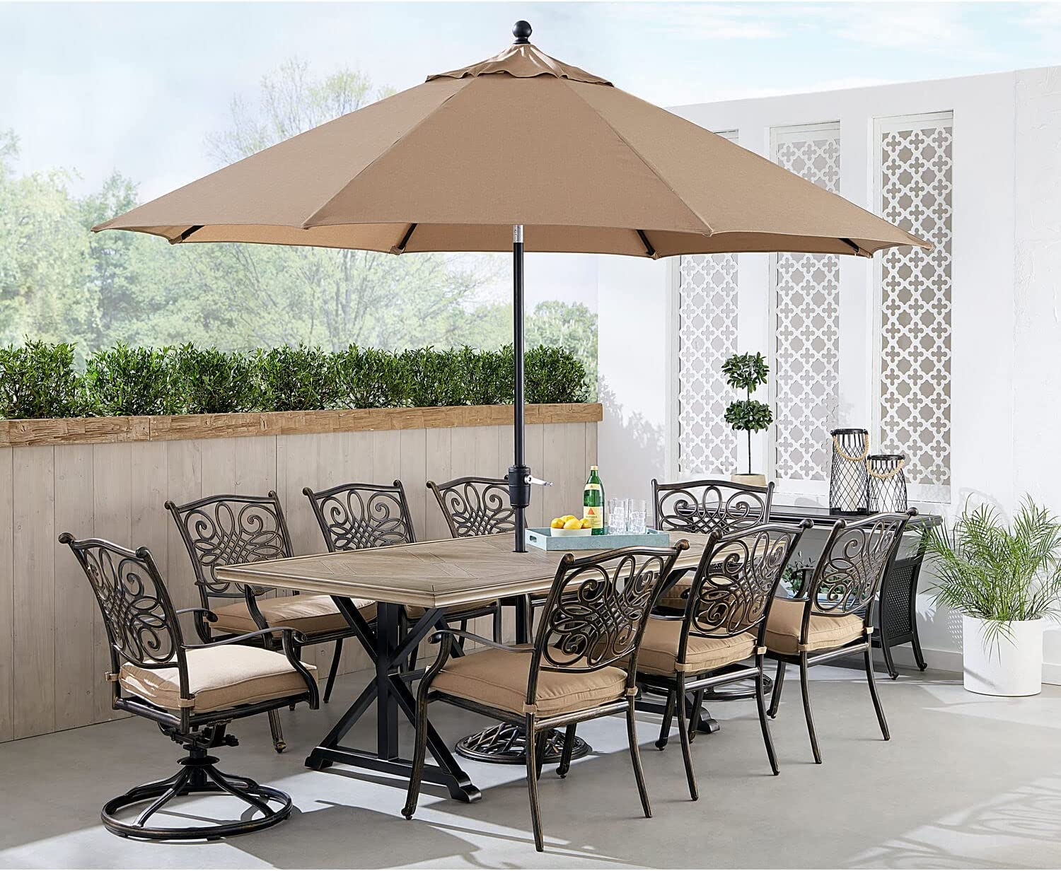 Hanover 7-Piece Tan with a 60 Cast-top Six Traditions Rust-Free Outdoor Patio Set Cushions, 6 Swivel Rockers and Aluminum Round Dining Table