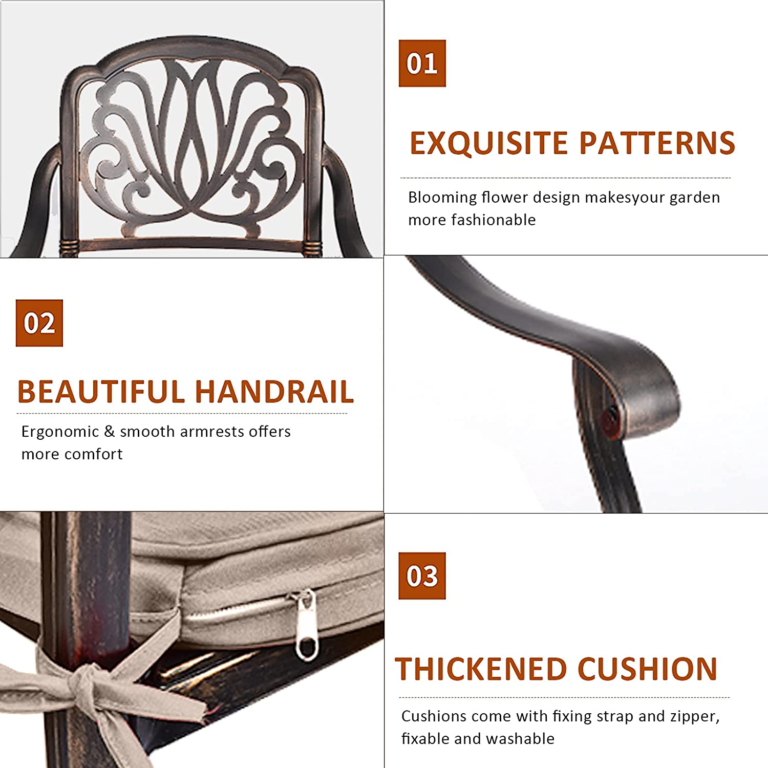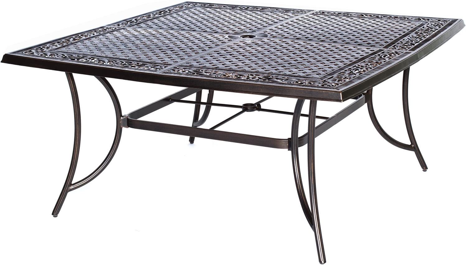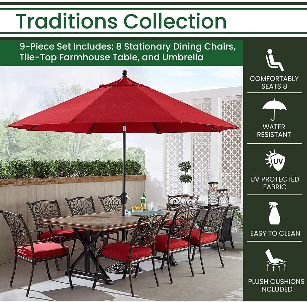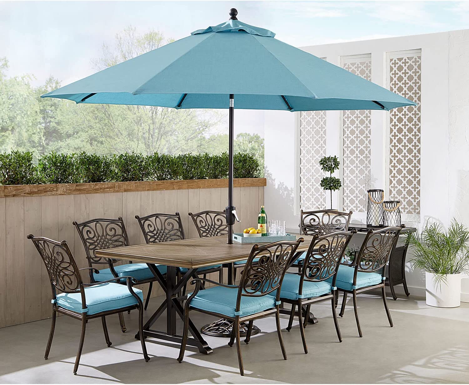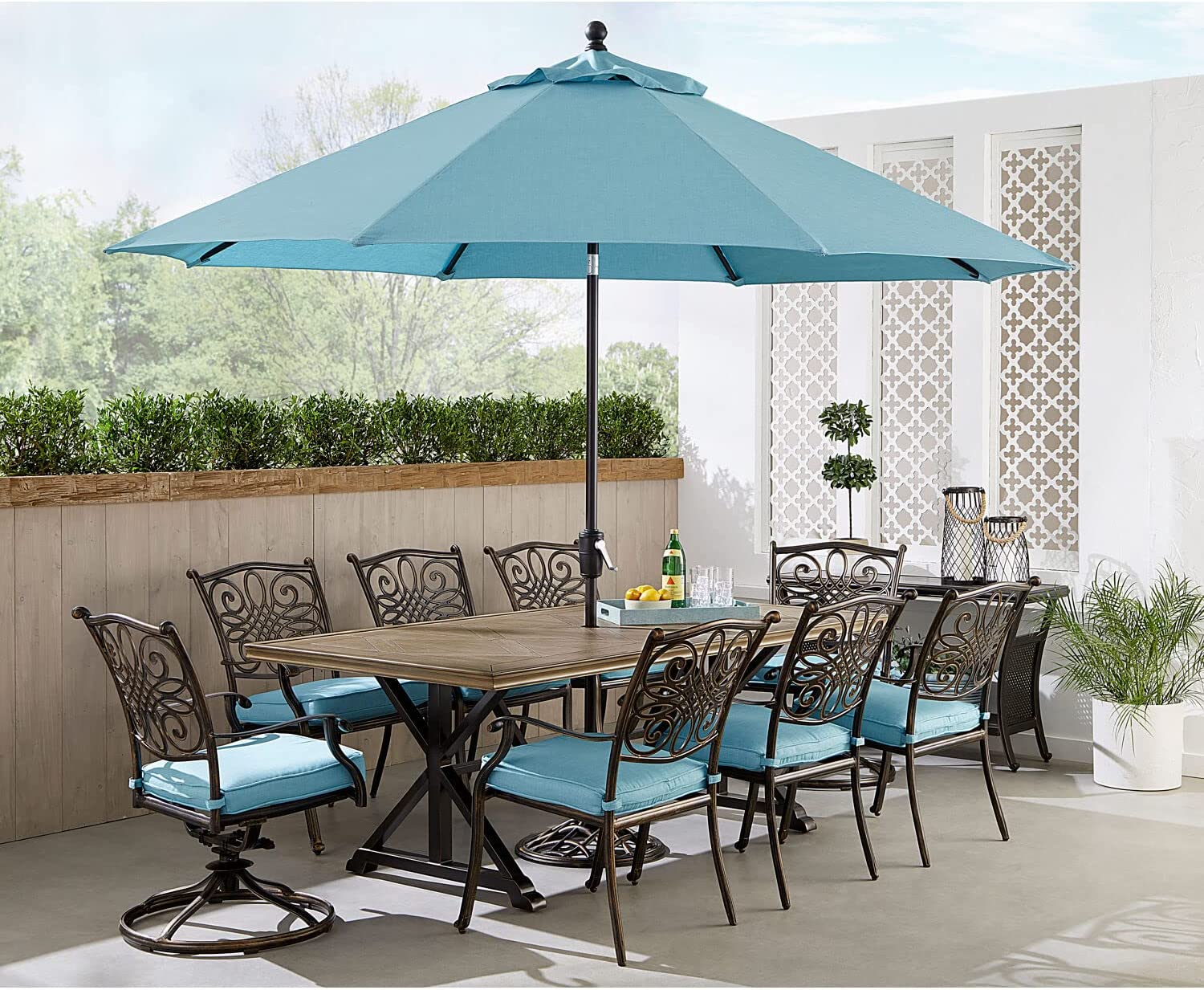 Hanover 7-Piece Tan with a 60 Cast-top Six Traditions Rust-Free Outdoor Patio Set Cushions, 6 Swivel Rockers and Aluminum Round Dining Table