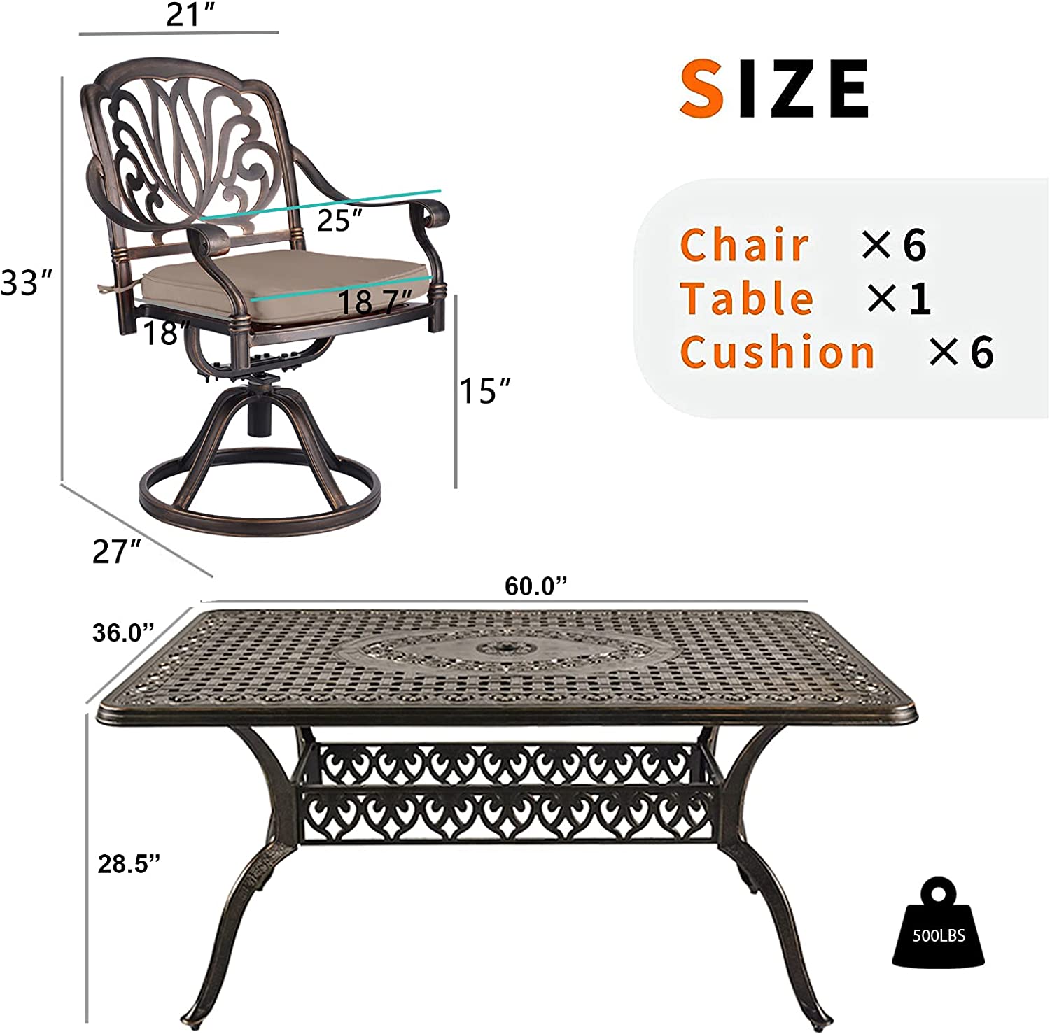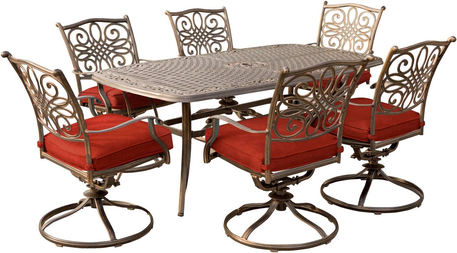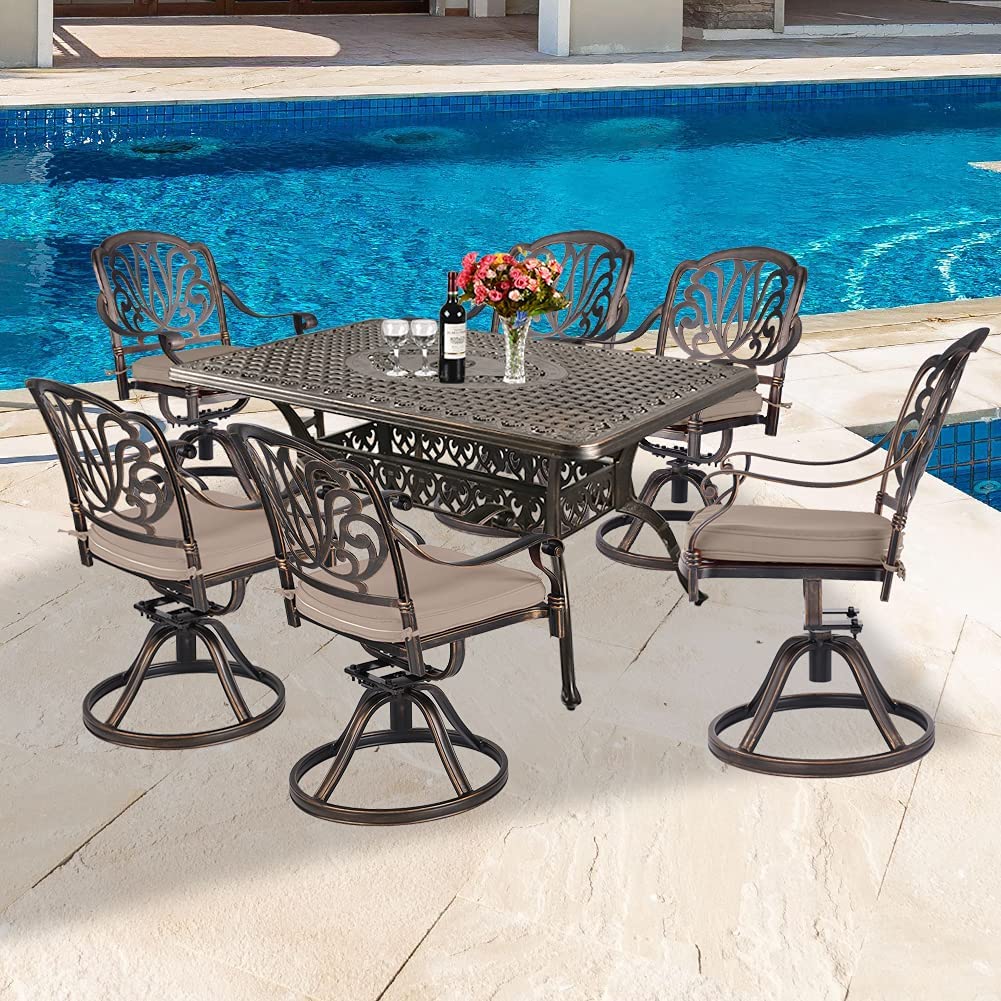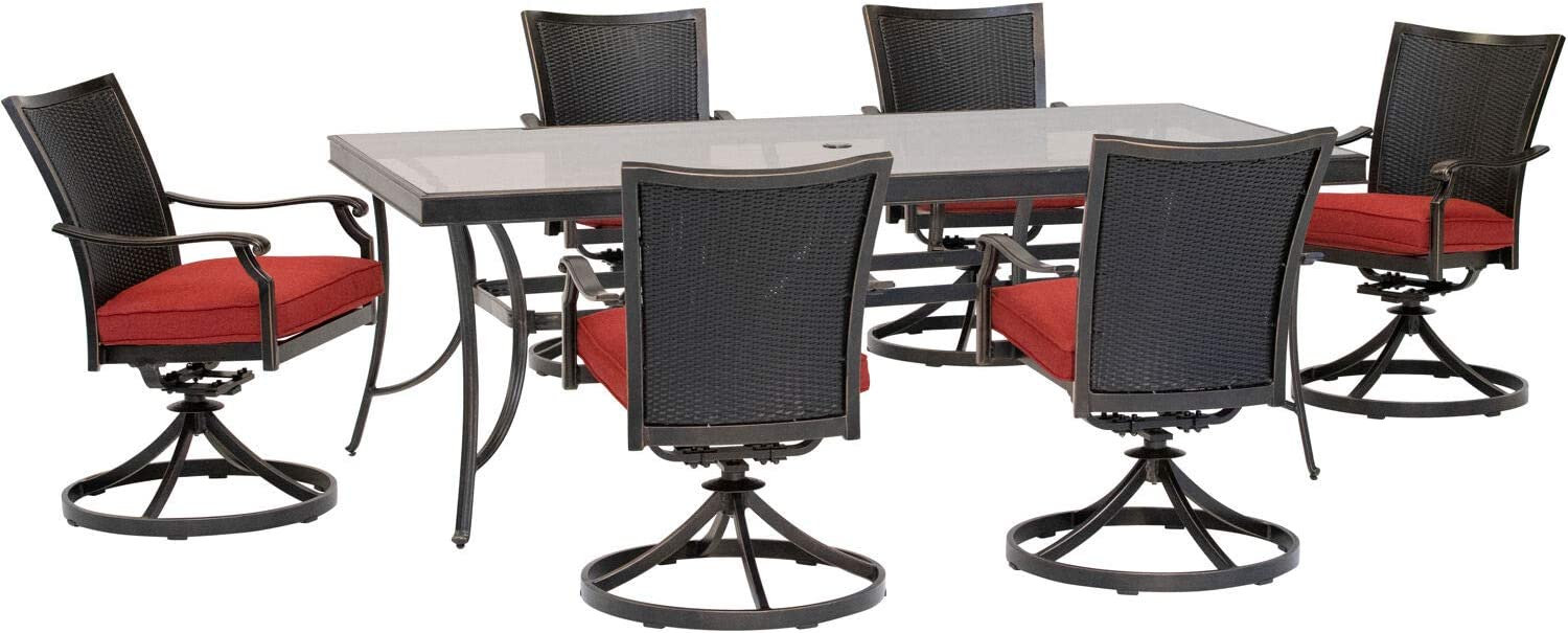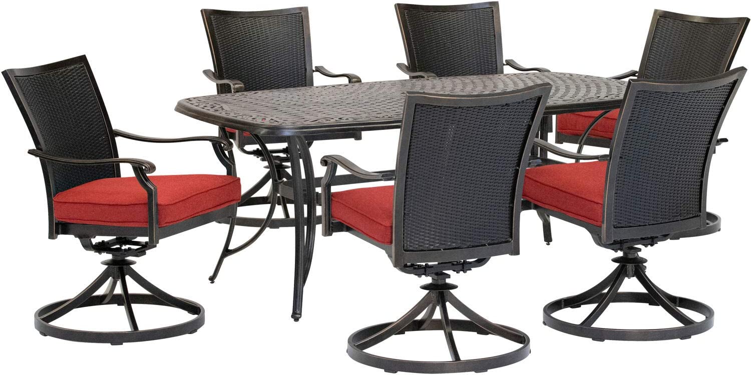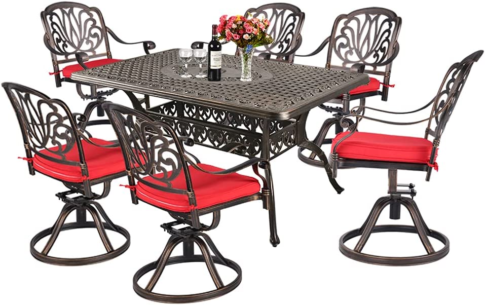 7 Piece Patio Dining Set, 6 Swivel Outdoor Dining Chairs with Cushion and 1 Rectangle Patio Dining Table, Outdoor Metal Furniture Set for Poolside, Backyard, Garden (Red Cushions)