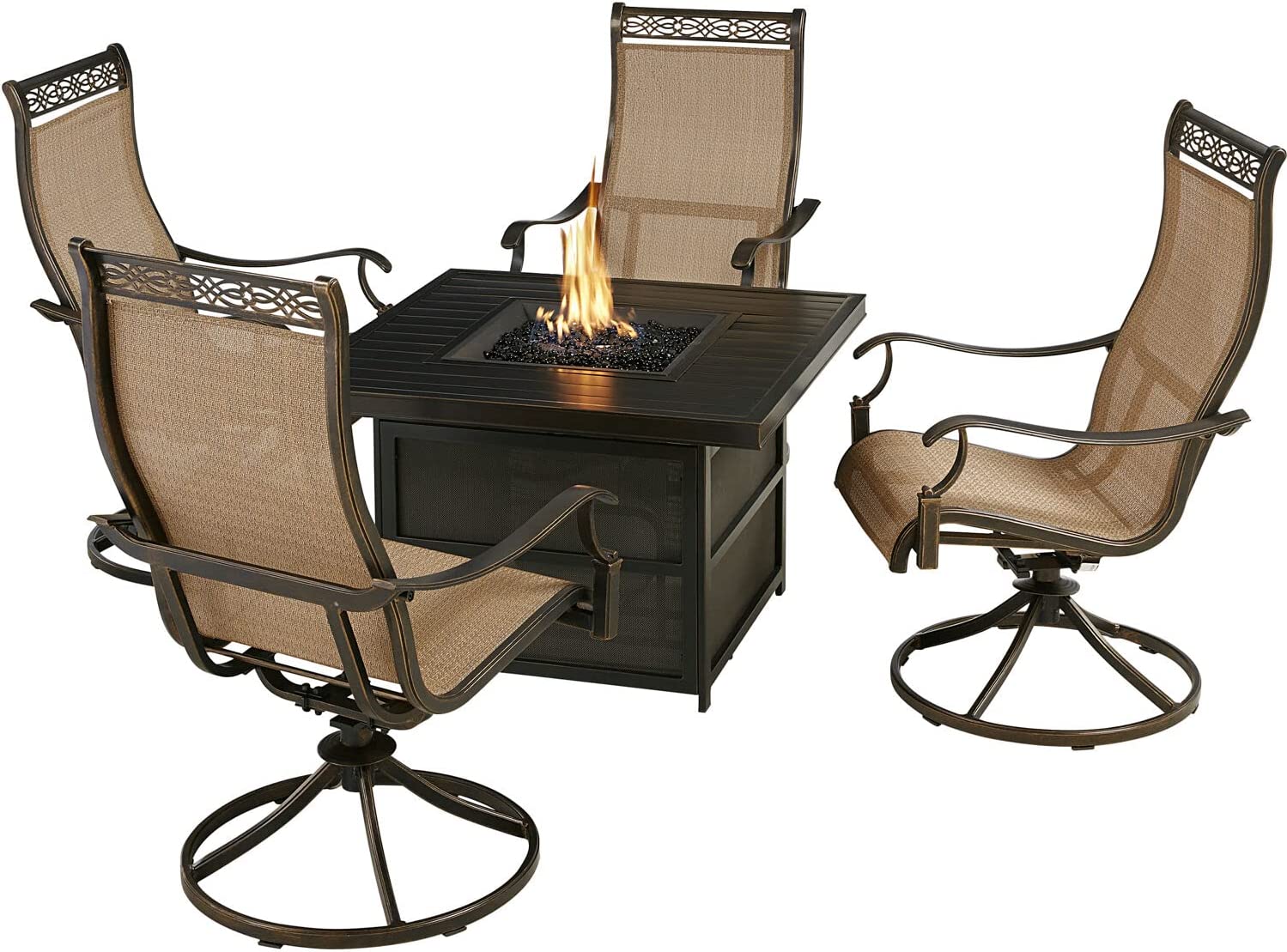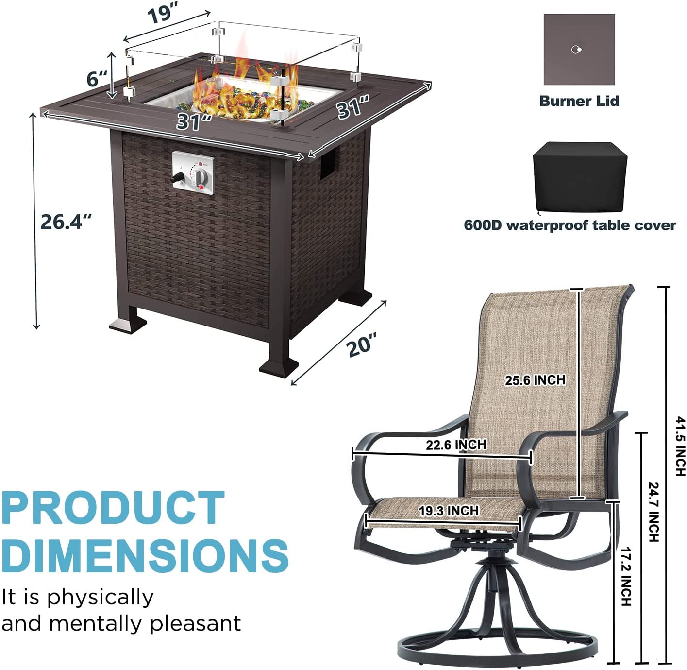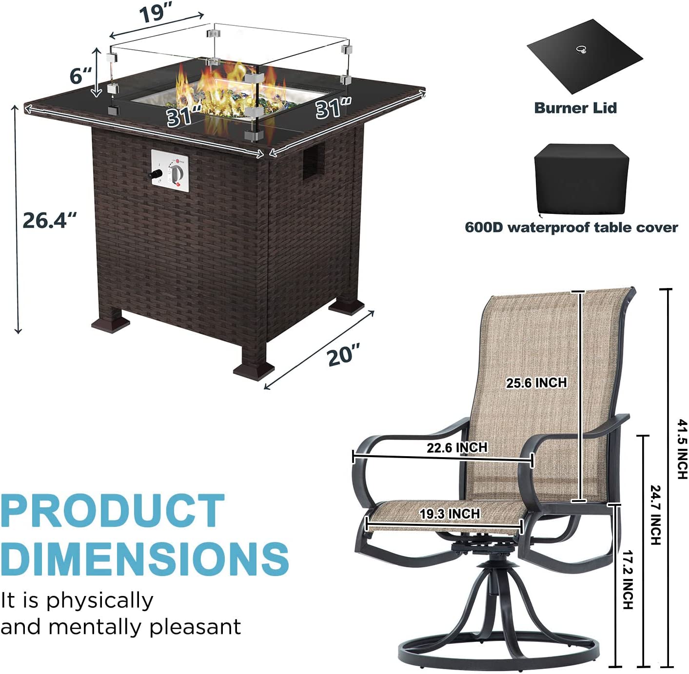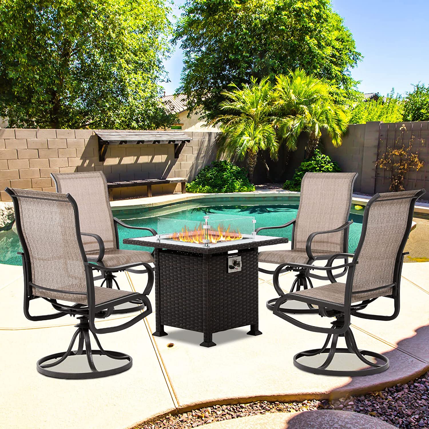 VONZOY 5 Piece Outdoor Patio Furniture Set with 32" 50000BTU Gas Propane Fire Pit Table, 4 Swivel Rocking Dining Chairs, Textilene Conversation Set - Glass Table