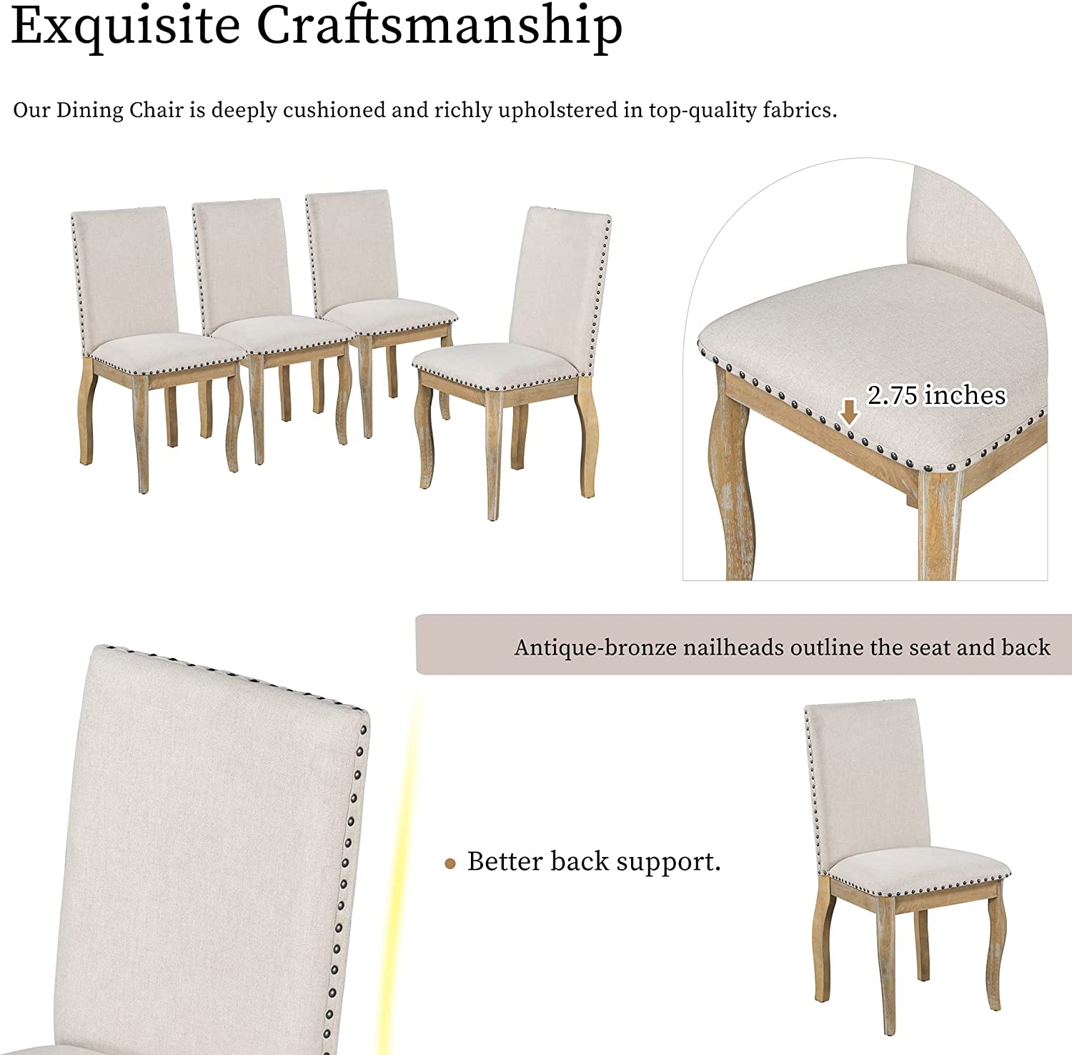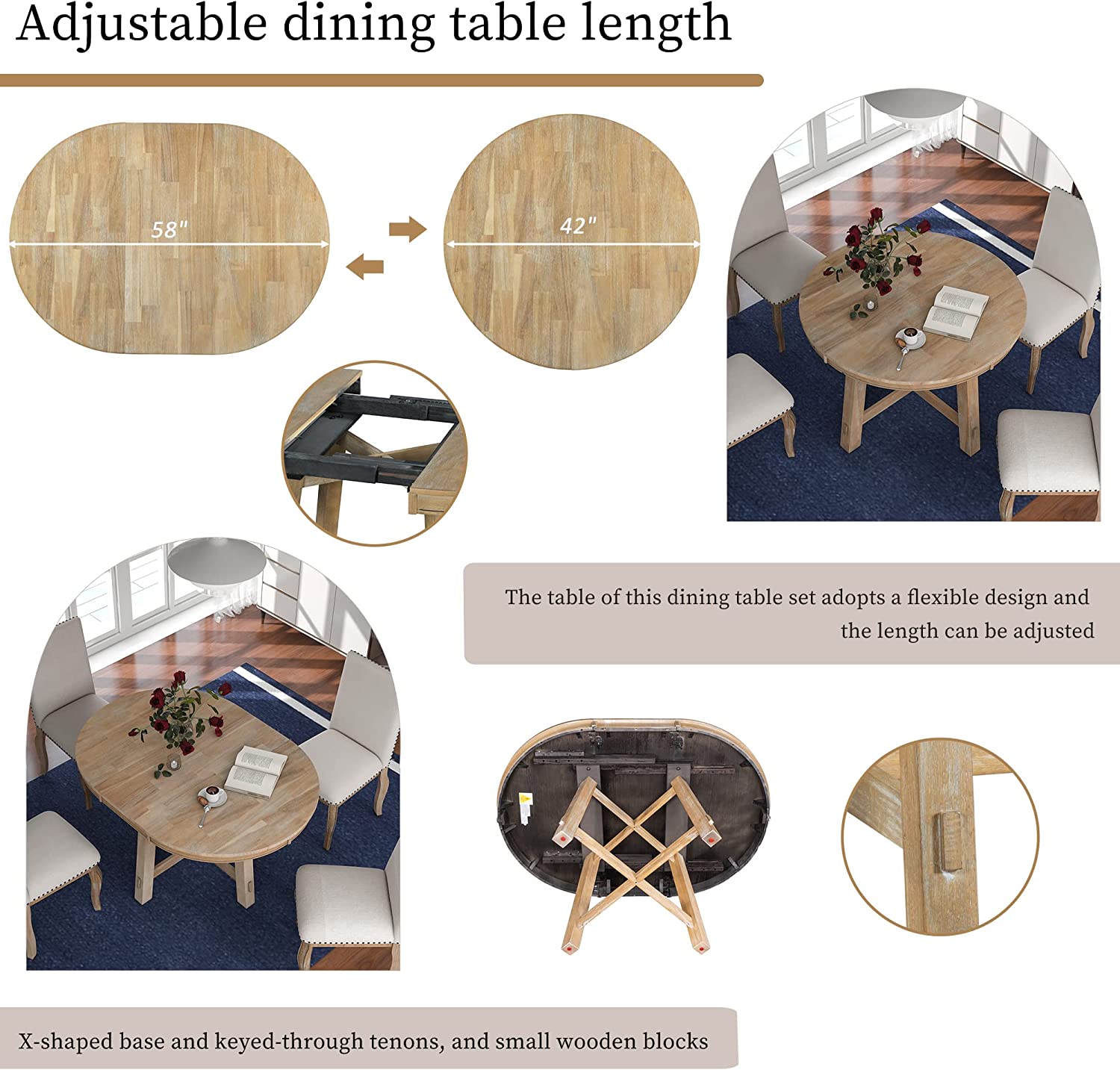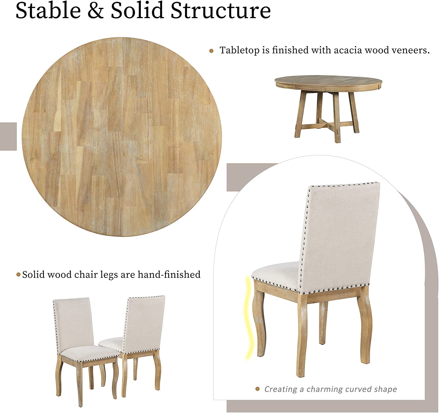 Merax 5-Piece Farmhouse Wooden Round Extendable Dining Table Set with 4 Upholstered Chairs, Family Kitchen Furniture, Natural_New