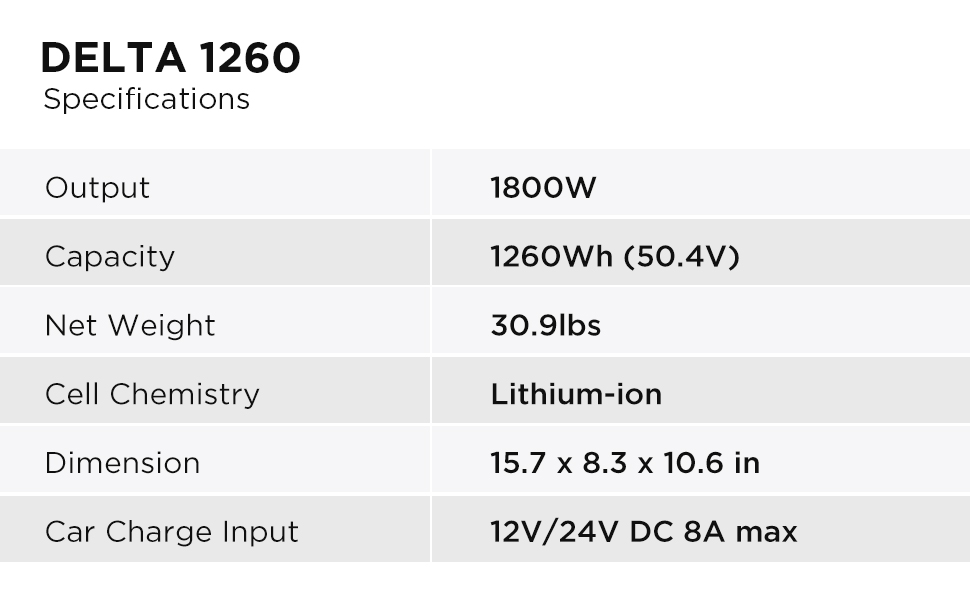 • 【High Performance and Handy Power Source】DELTA is a portable power station with 1260Wh,which to meet different kinds of electricity demands outdoor usage for home, travel, camping, backseat on long road trips.