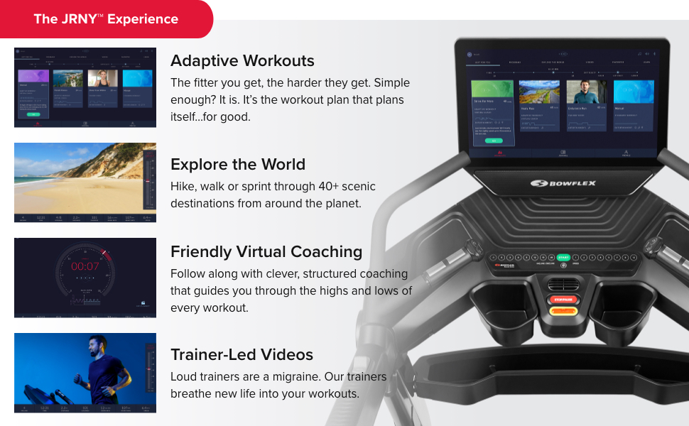 • The JRNY experience assesses your fitness level, creates custom workouts personalized to your unique capabilities, and provides coaching and feedback that guides you through your workouts – all from the built-in touchscreen