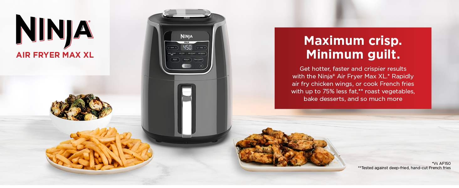 Meet the Ninja Air Fryer Max XL, a fast and easy way to cook your favorite foods. Cook and crisp 3 lbs of French fries, using little to no oil, in a family-sized 5.5-qt basket. MaxCrisp Technology delivers 450 degrees of superheated air to cook foods up to 30% faster (versus Ninja AF100), for hotter, crispier results with little to no oil for guilt free fried favorites.