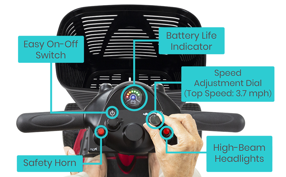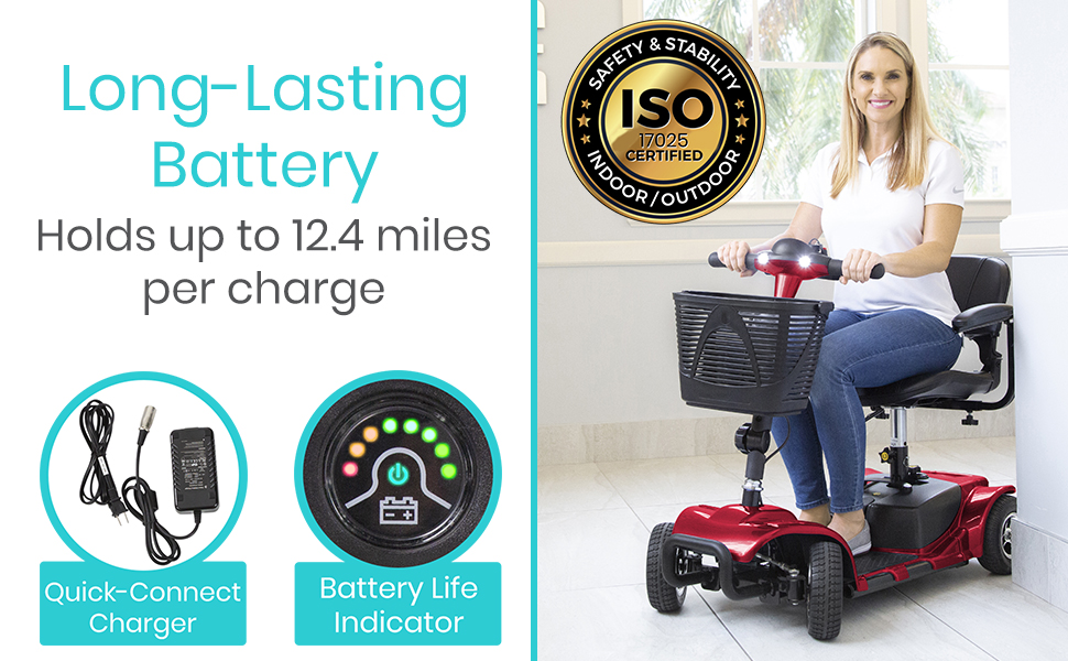 SAFELY NAVIGATE SMOOTH SURFACES: Easily maneuver over smooth indoor surfaces and rough outdoor surface with the Vive Four-Wheel Mobility Scooter—with comfort and ease. Designed to safely support up to 265 pounds, the mobility scooter and its tires were engineered for durability and safety. Its easy-grip tires are flat-free, non-marking, and are 8”. Its maximum speed is 3.7 mph, and it has a driving distance up to 12.4 miles per charge.