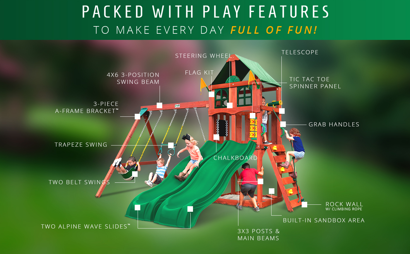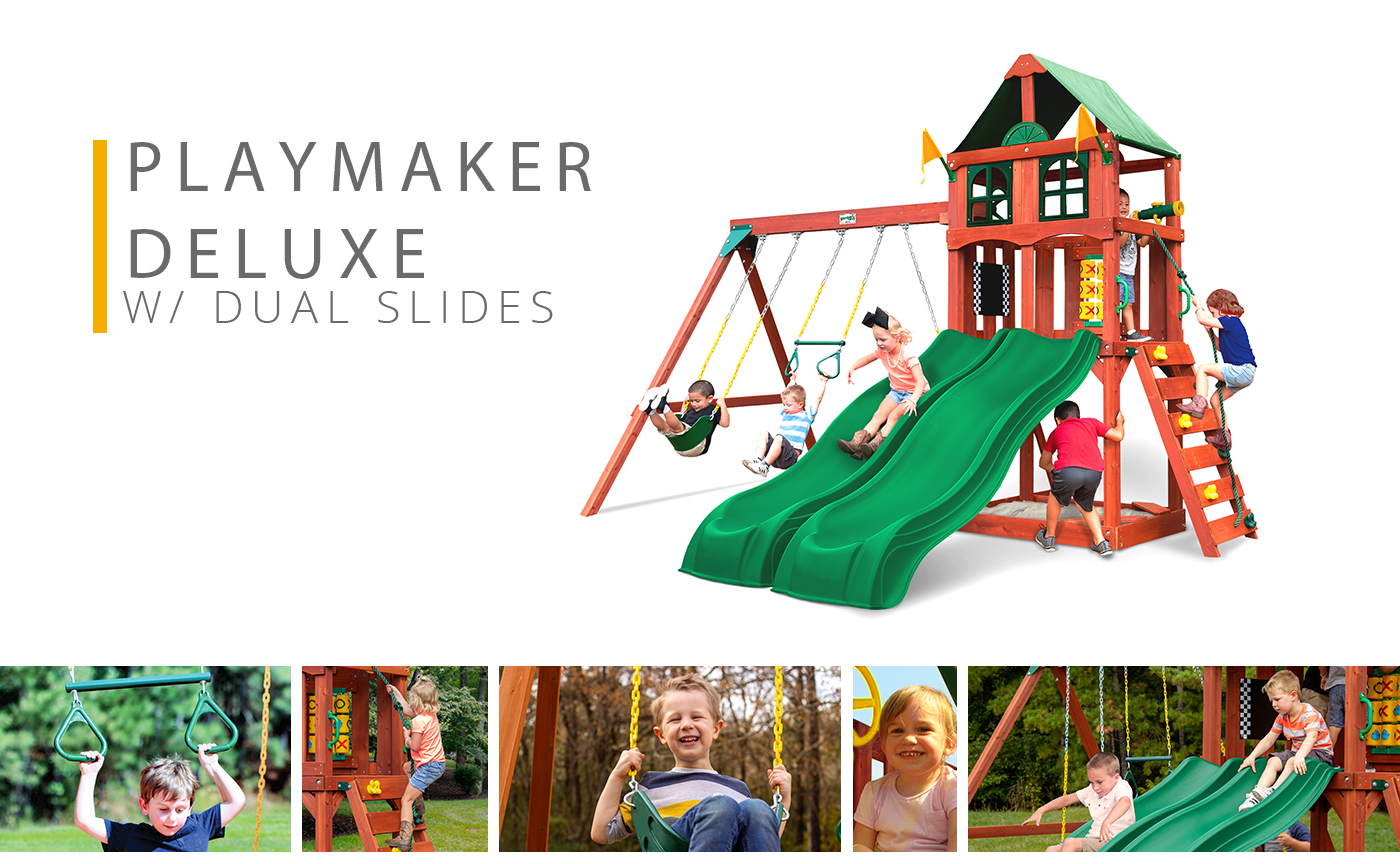 Have double the fun with the Playmaker Deluxe Wood Swing Set by Gorilla Playsets. This high-quality swing set provides hours of outdoor activities for your child to enjoy, like the rock climbing wall, the built-in sandbox area, two Alpine Wave Slides, and much more. The heavy-duty Deluxe Vinyl Canopy protects the upper play deck from the weather elements and provides shade on hot days. This outdoor playground includes all required hardware, lumber, and a fully illustrated instruction manual to ease assembly. Gorilla Playsets' lumber comes pre-cut, pre-sanded, and pre-stained to help reduce the time of installation. The beautiful redwood stained cedar wood naturally resists rot, decay, and insect damage. The Playmaker Deluxe Swing Set meets the American Society of Testing Materials (ASTM) safety standards for residential use only.