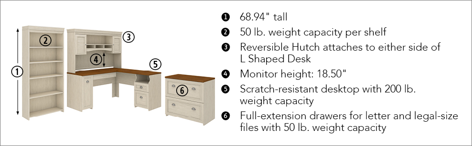 Brand Bush Furniture Shape L-Shape Product Dimensions 59.53"D x 60.28"W x 68.95"H Color Antique White Style Vintage Special Feature Adjustable Room Type Office Mounting Type Found in image, Freestanding Item Weight 429 Pounds Furniture Finish Antique white Size 60W Included Components L Desk, Hutch, Lateral File and 5 Shelf Bookcase Assembly Required Yes Model Name Fairview Item Weight 429 pounds Manufacturer Bush Industries